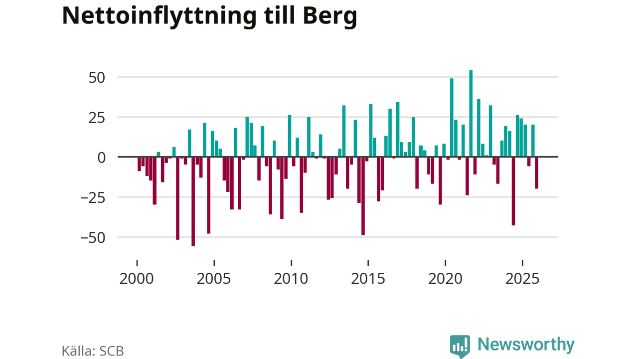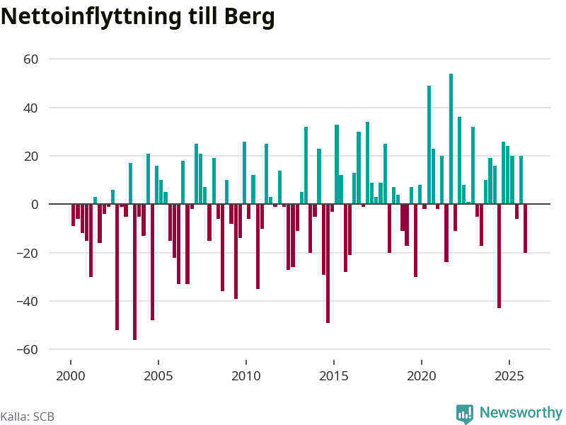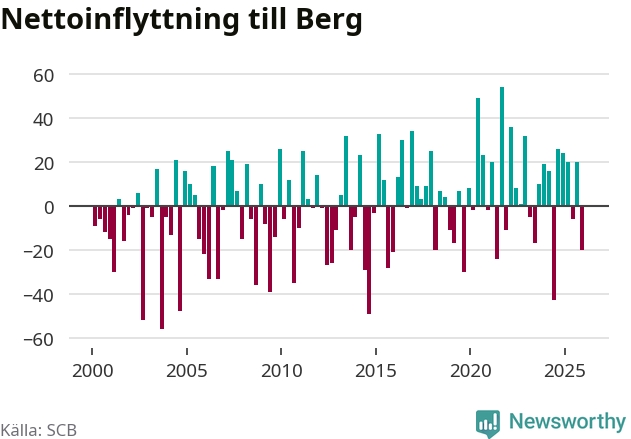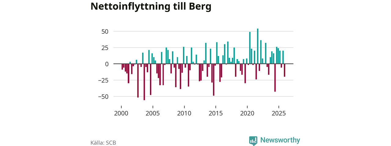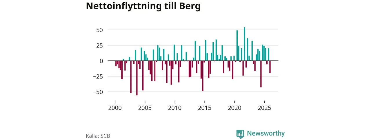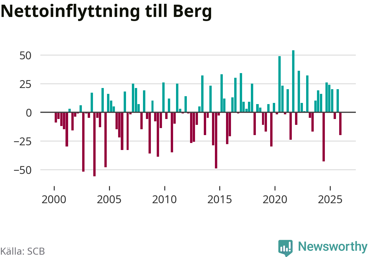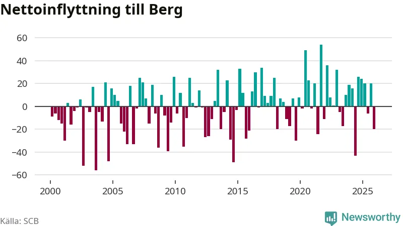 Under fjärde kvartalet 2025 flyttade 87 personer till kommunen medan 107 personer flyttade därifrån. Sedan seklets början har Berg oftast haft ett positivt flyttnetto.