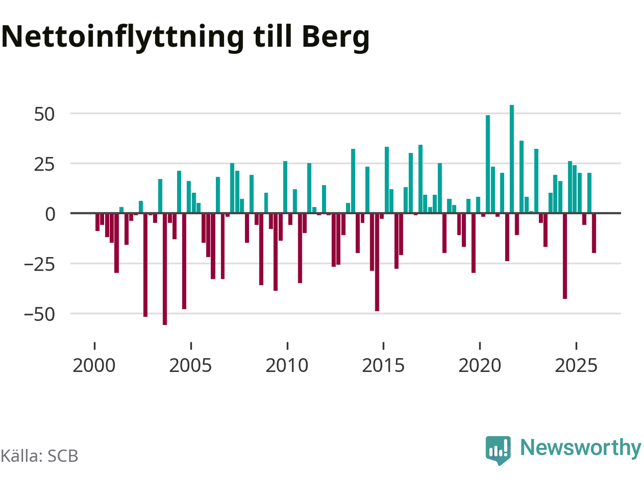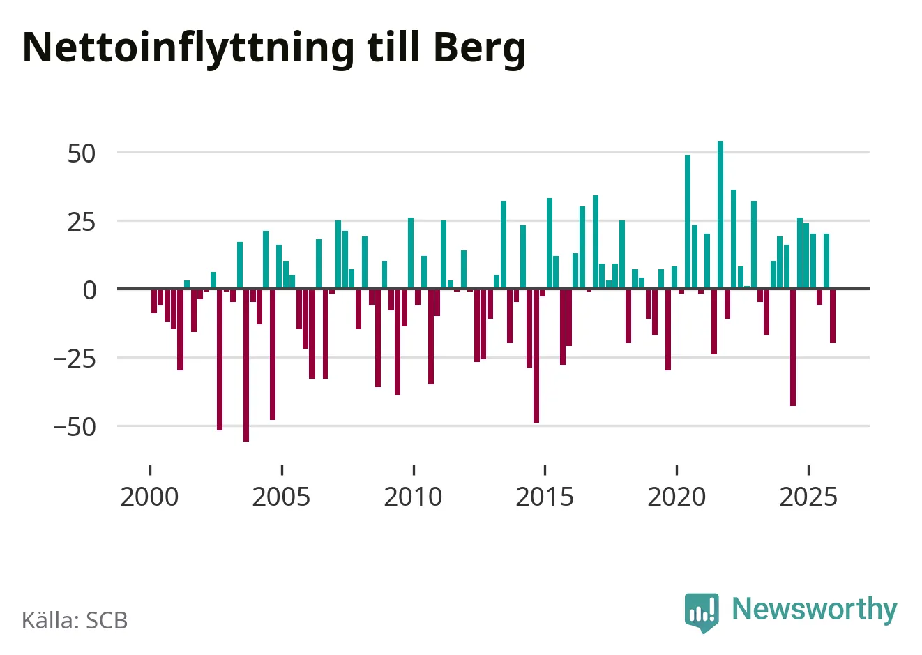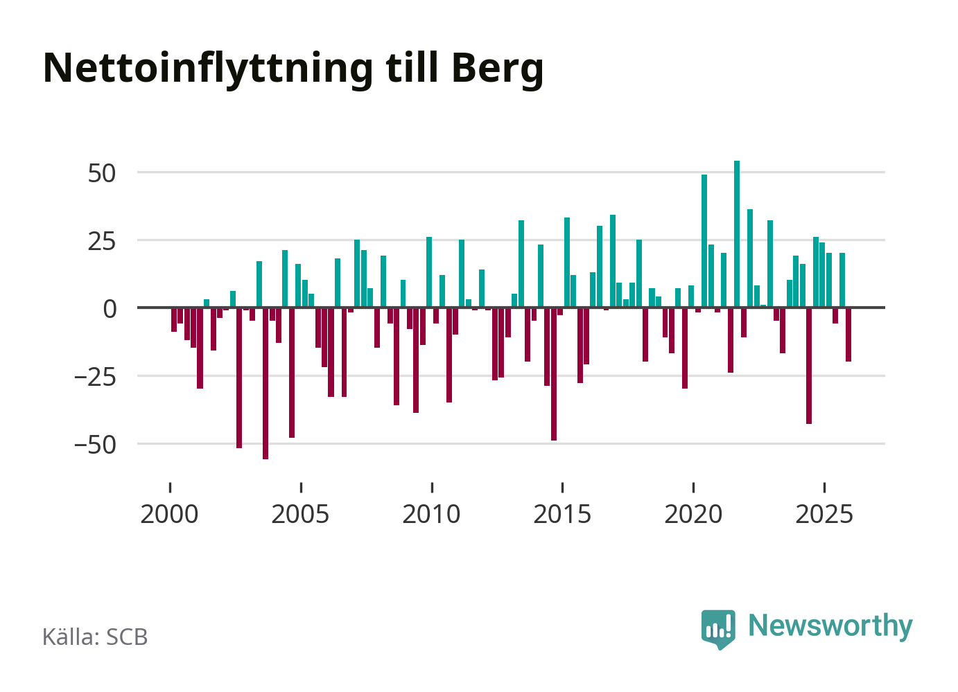 Under fjärde kvartalet 2025 flyttade 87 personer till kommunen medan 107 personer flyttade därifrån. Sedan seklets början har Berg oftast haft ett positivt flyttnetto.