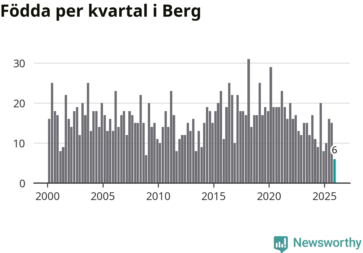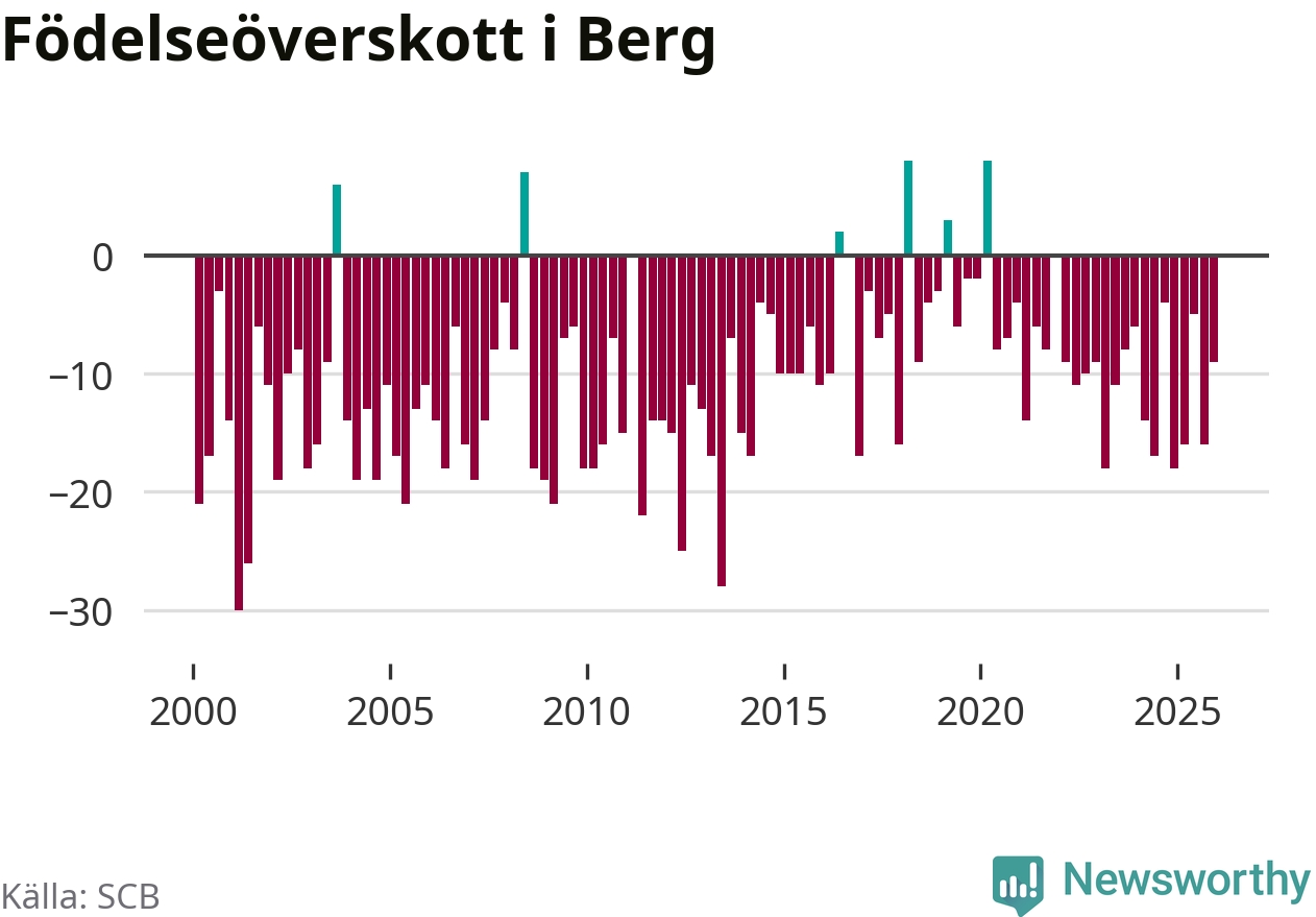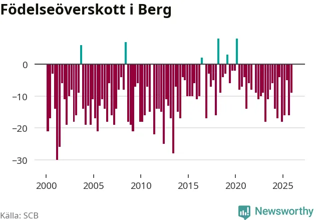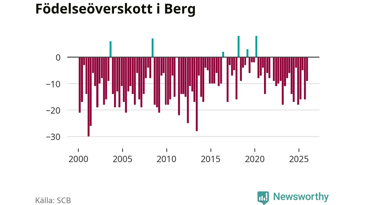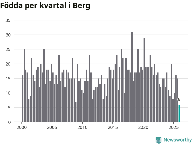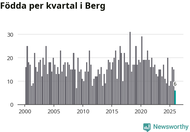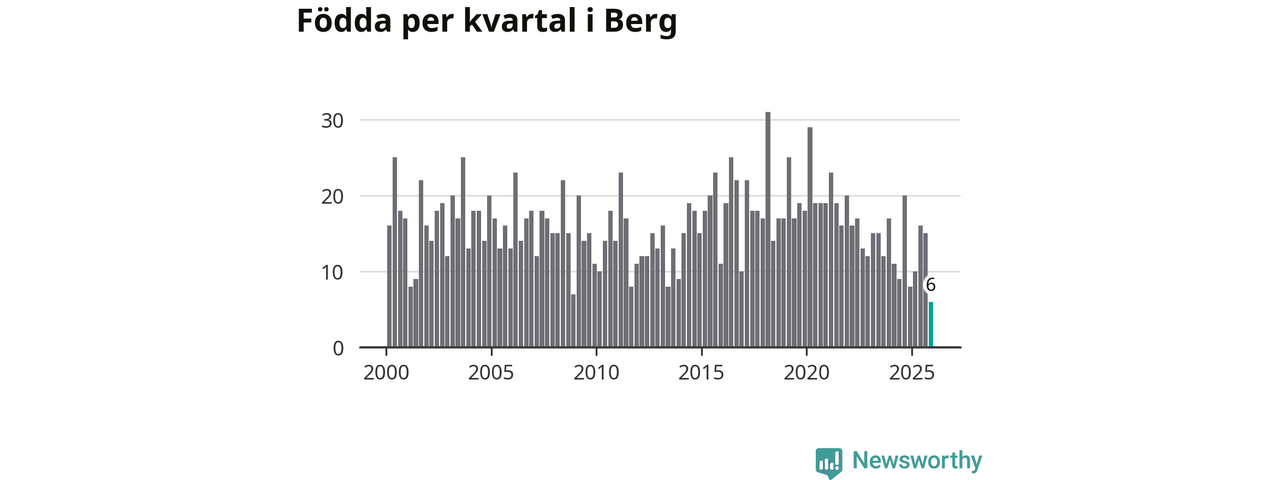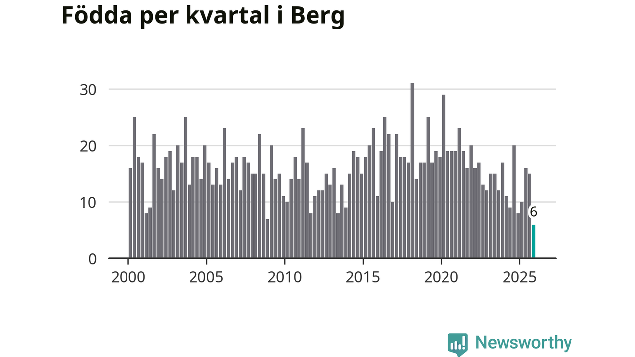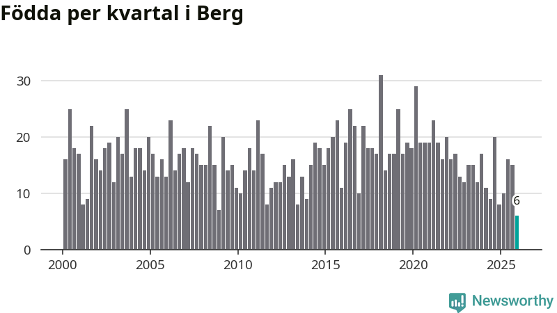 Enligt SCB:s siffror föddes sex barn i Berg under det senaste kvartalet. Det är det lägsta födelsetal som registrerats i kommunen under 2000-talet. Det finns en osäkerhet här, eftersom SCB lägger på ett slumpmässigt brus på alla siffror. Klart är i alla fall att det rör sig om historiskt låga nivåer. Samtidigt avled 15 personer. Berg hade alltså ett negativt födelsenetto, vilket kommunen historiskt sett nästan alltid har haft.