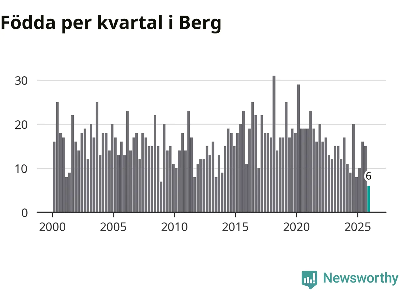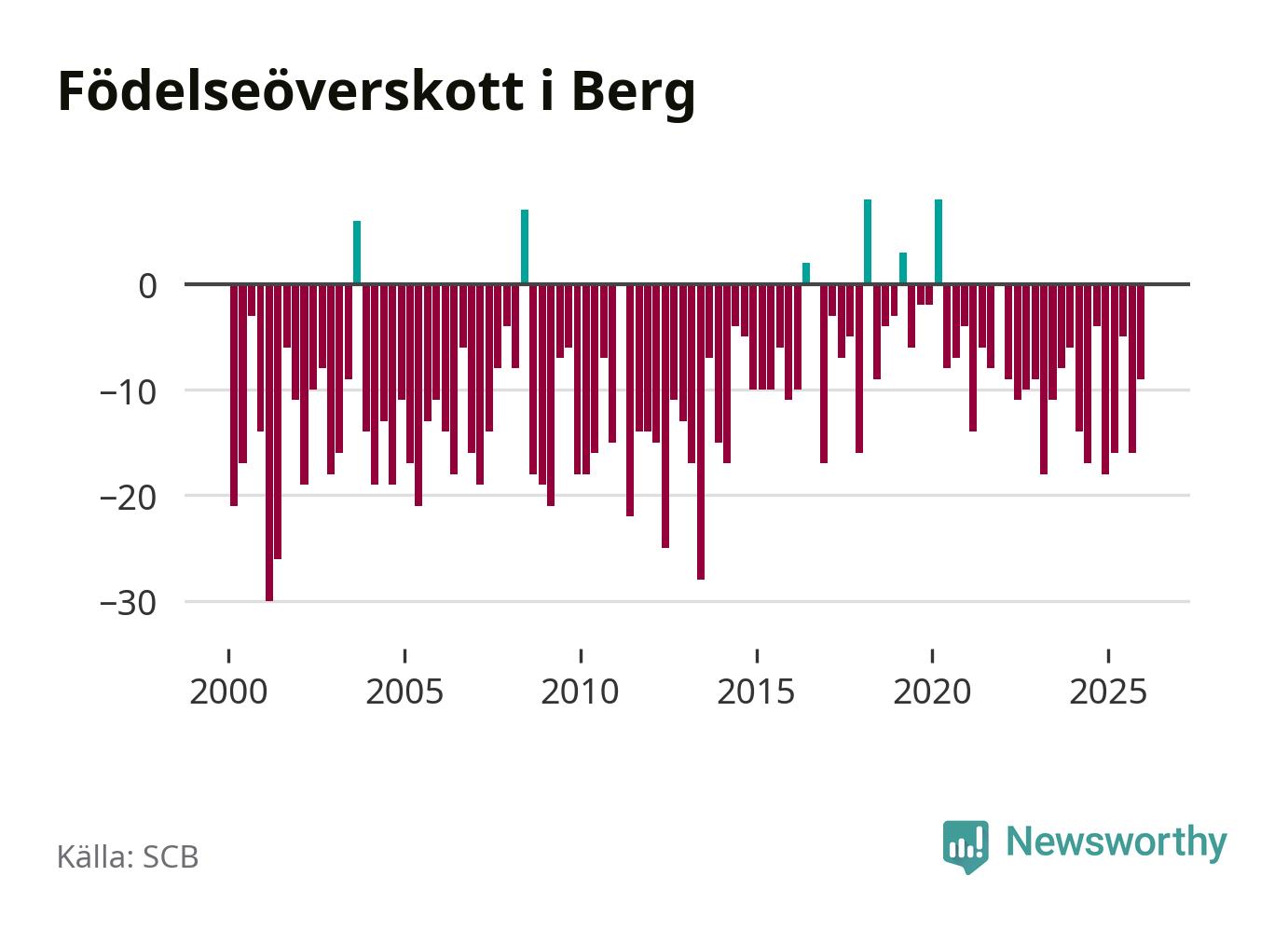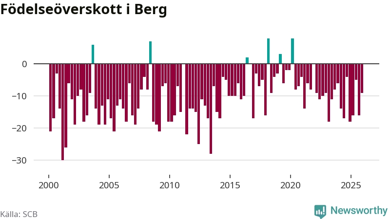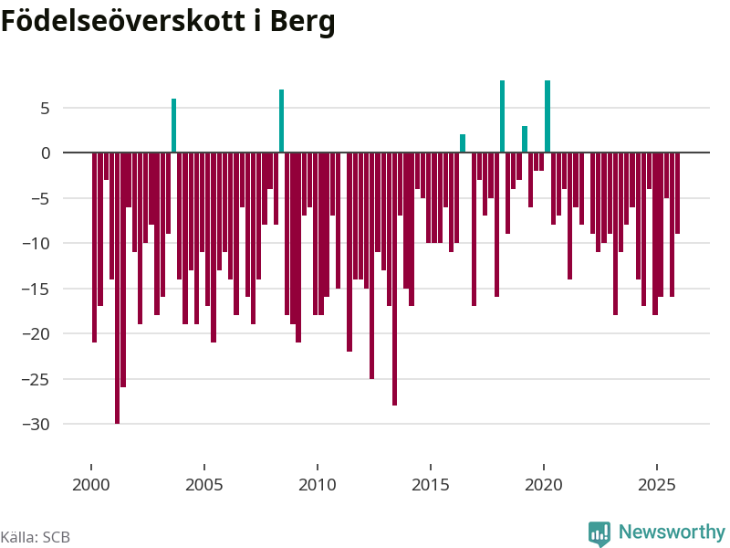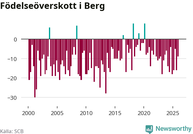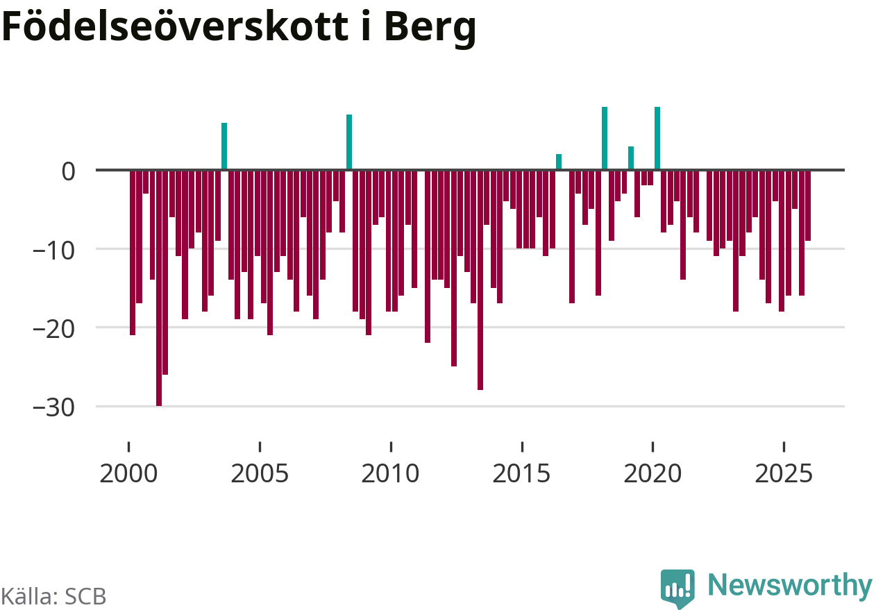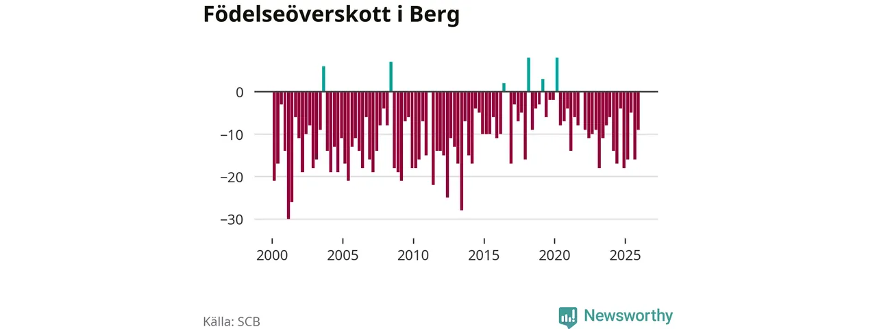 Enligt SCB:s siffror föddes sex barn i Berg under det senaste kvartalet. Det är det lägsta födelsetal som registrerats i kommunen under 2000-talet. Det finns en osäkerhet här, eftersom SCB lägger på ett slumpmässigt brus på alla siffror. Klart är i alla fall att det rör sig om historiskt låga nivåer. Samtidigt avled 15 personer. Berg hade alltså ett negativt födelsenetto, vilket kommunen historiskt sett nästan alltid har haft.