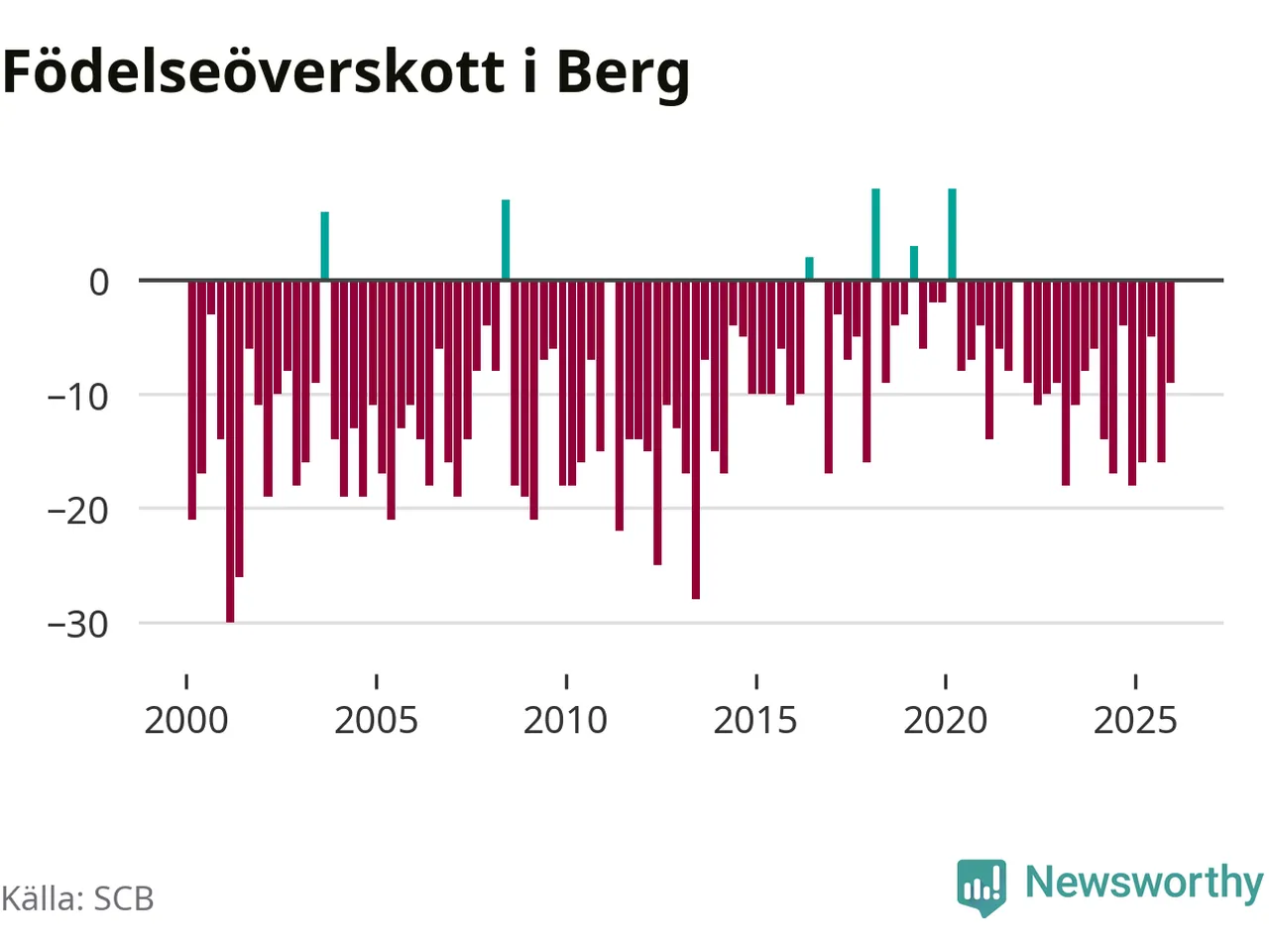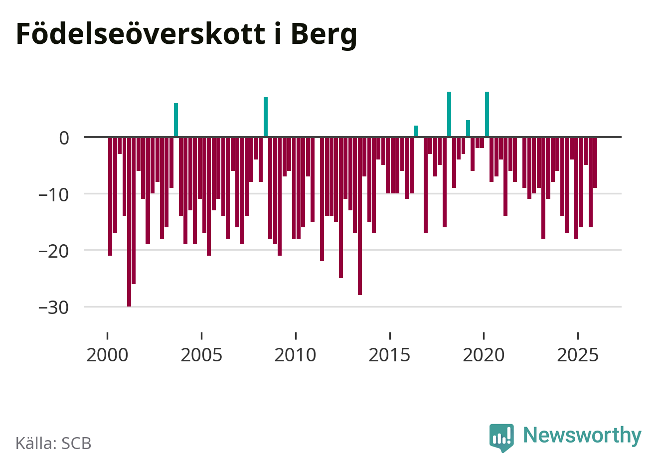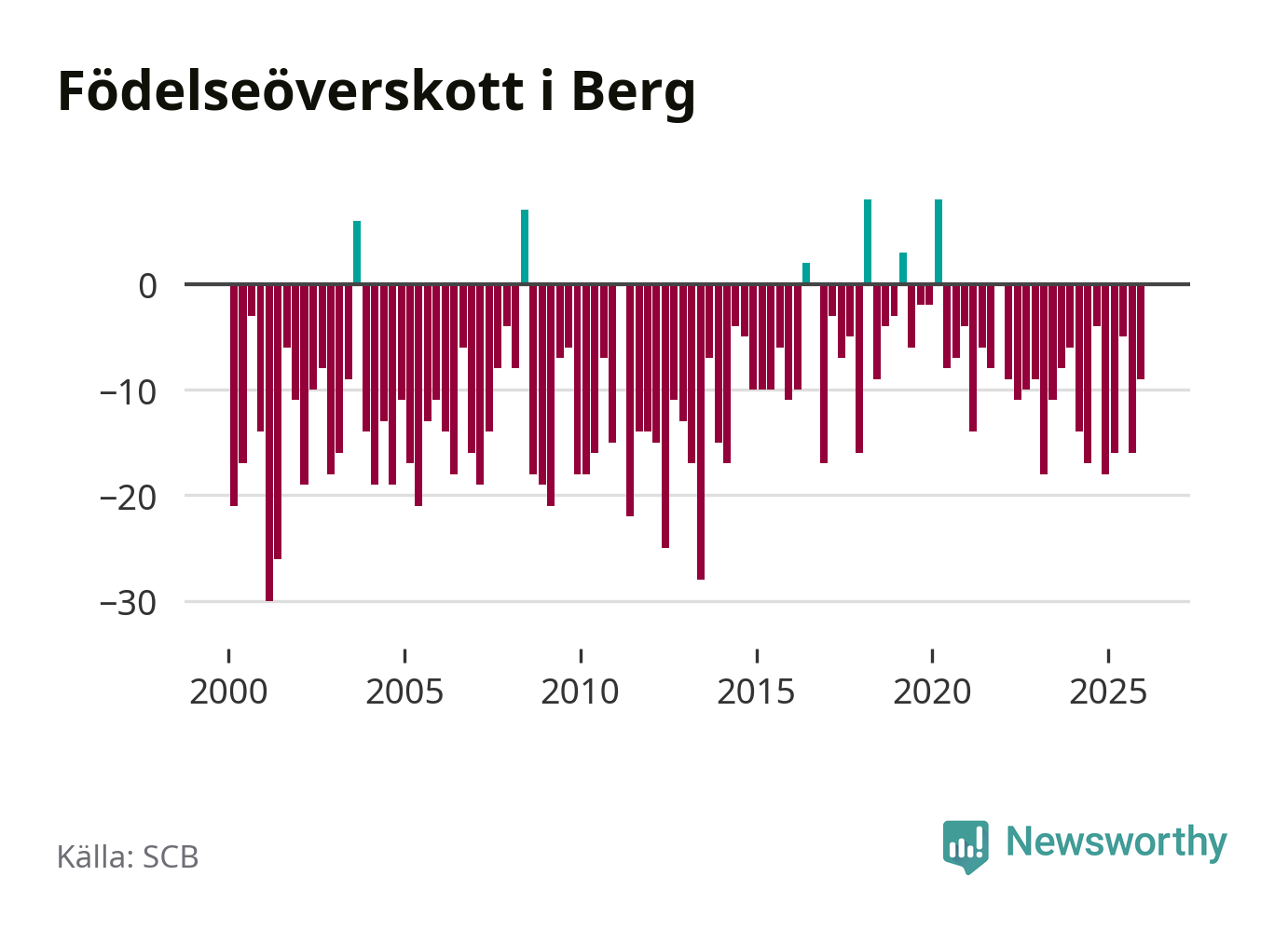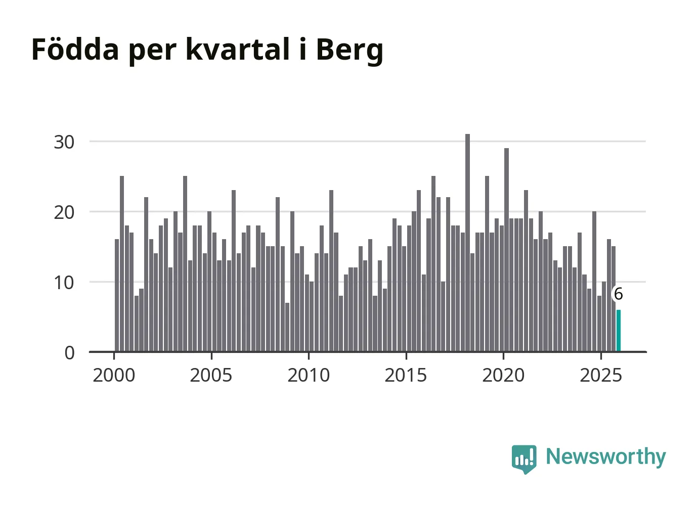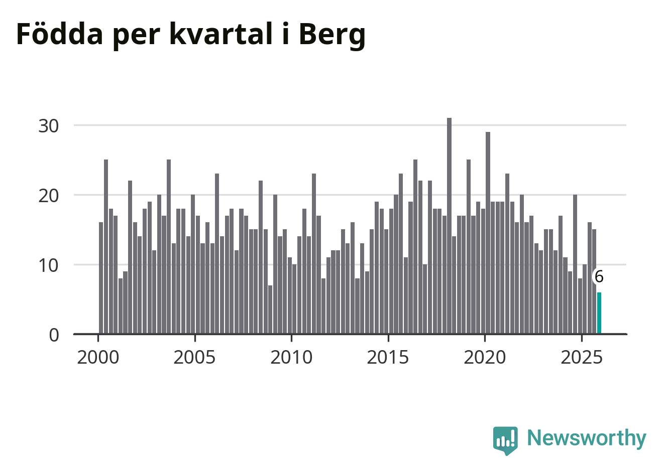 Enligt SCB:s siffror föddes sex barn i Berg under det senaste kvartalet. Det är det lägsta födelsetal som registrerats i kommunen under 2000-talet. Det finns en osäkerhet här, eftersom SCB lägger på ett slumpmässigt brus på alla siffror. Klart är i alla fall att det rör sig om historiskt låga nivåer. Samtidigt avled 15 personer. Berg hade alltså ett negativt födelsenetto, vilket kommunen historiskt sett nästan alltid har haft.
