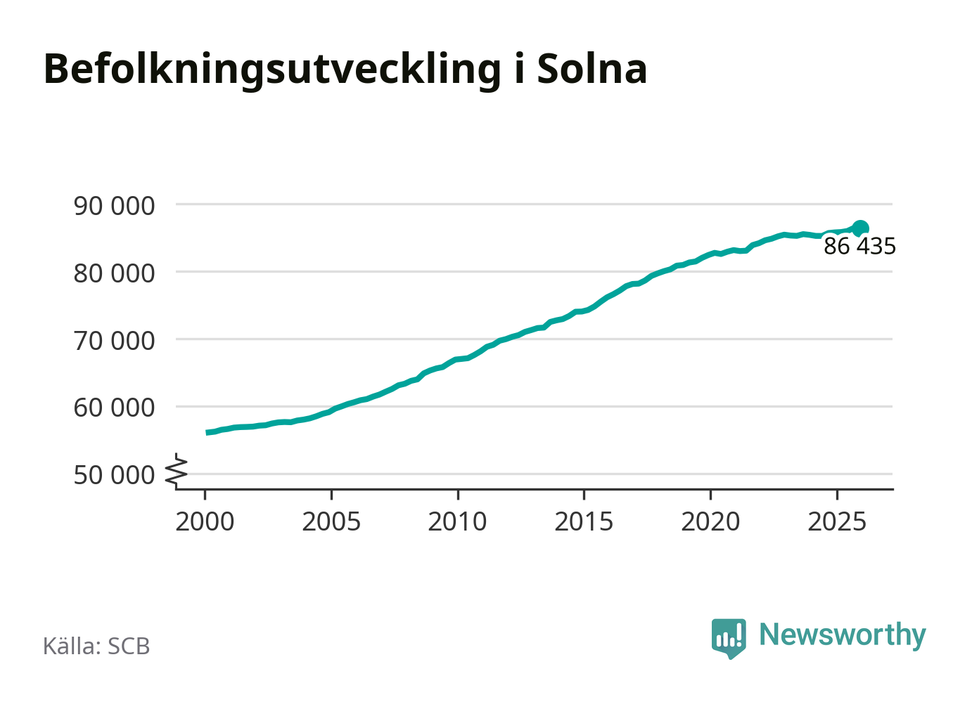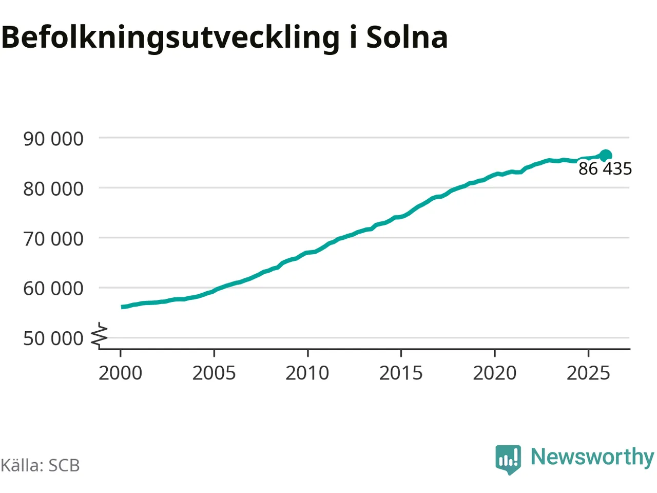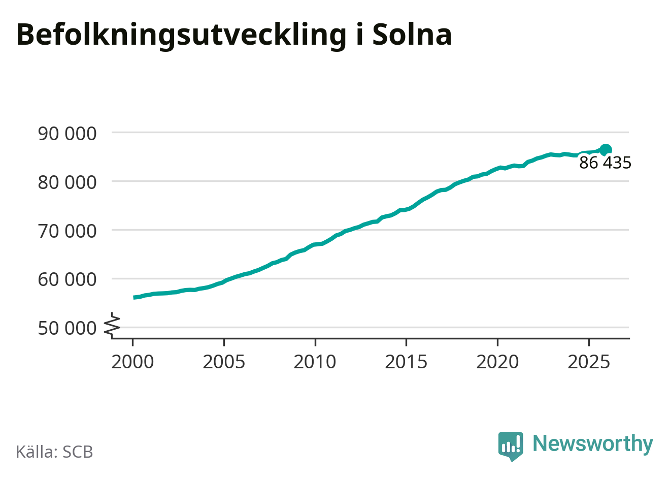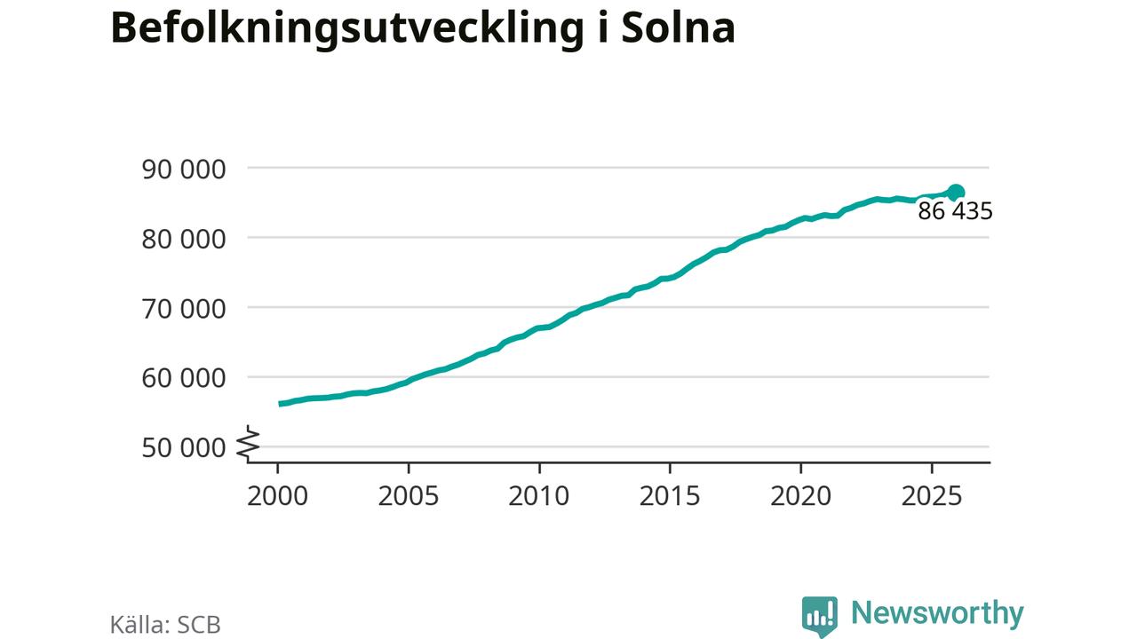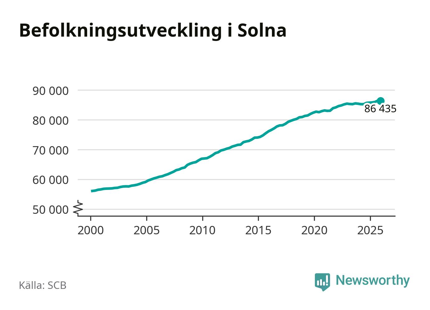 Den 31 december bodde 86 435 personer i Solna kommun, enligt SCB:s senaste siffror. Det är något färre än i slutet av tredje kvartalet, men skillnaden är så liten att den lika gärna kan bero på den lilla justering som SCB gör av siffrorna för att skydda enskilda individers identitet.