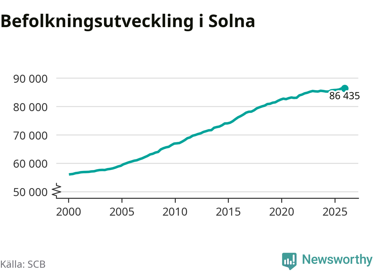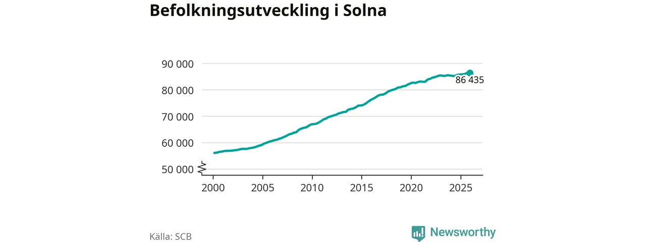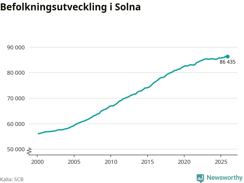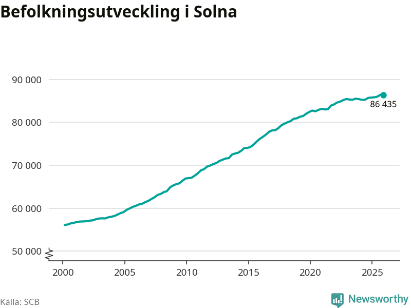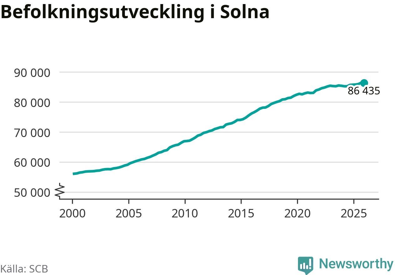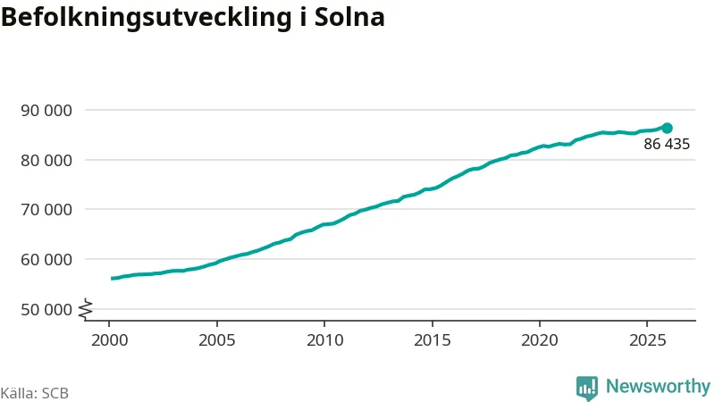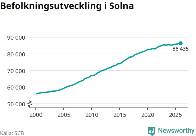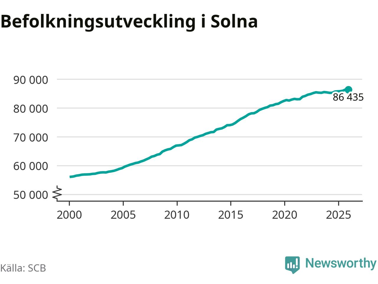 Den 31 december bodde 86 435 personer i Solna kommun, enligt SCB:s senaste siffror. Det är något färre än i slutet av tredje kvartalet, men skillnaden är så liten att den lika gärna kan bero på den lilla justering som SCB gör av siffrorna för att skydda enskilda individers identitet.