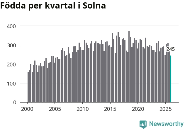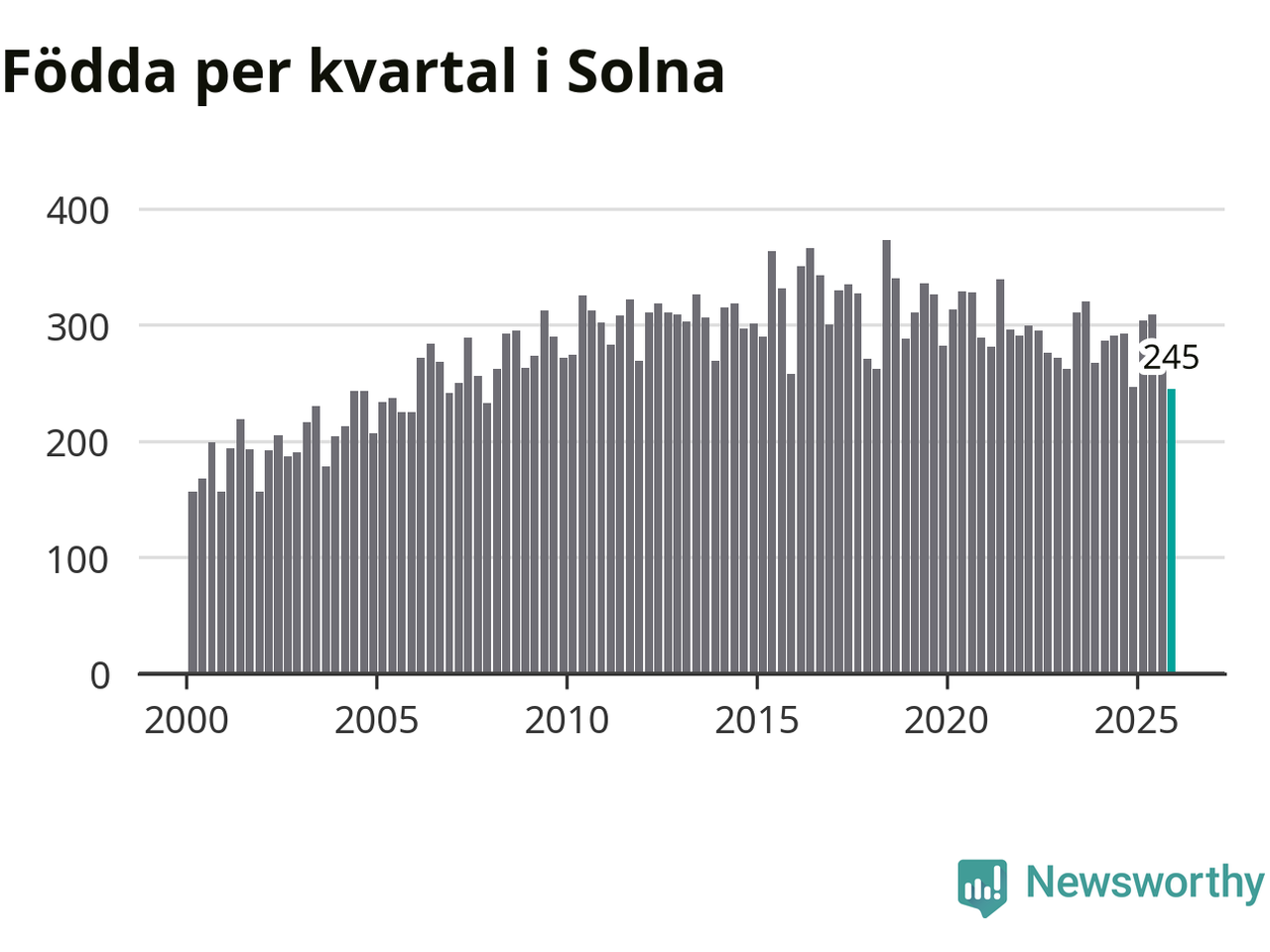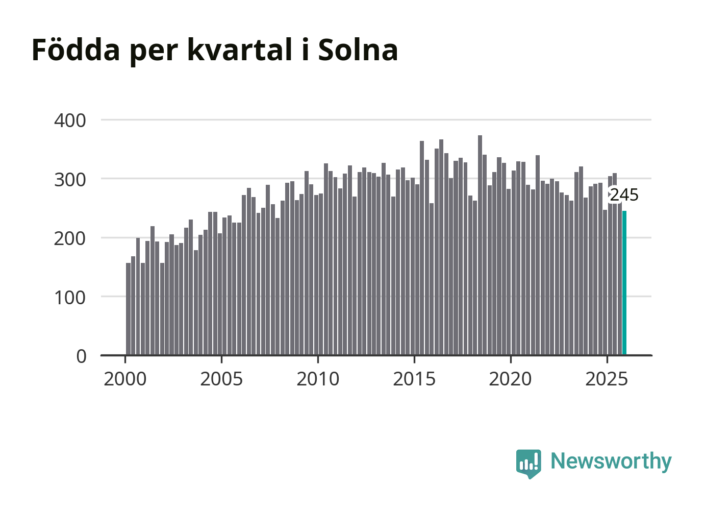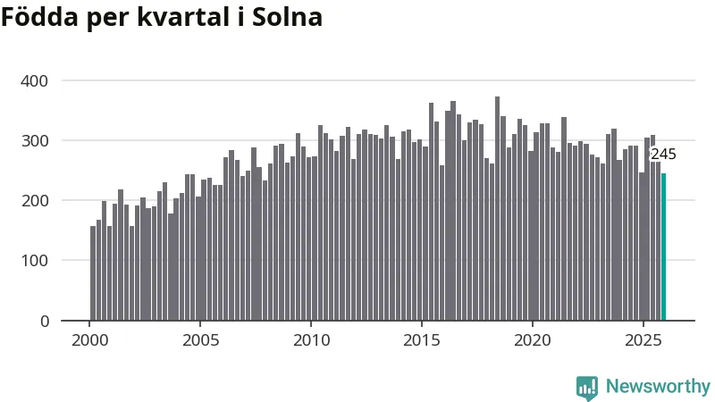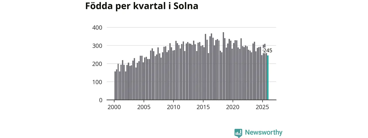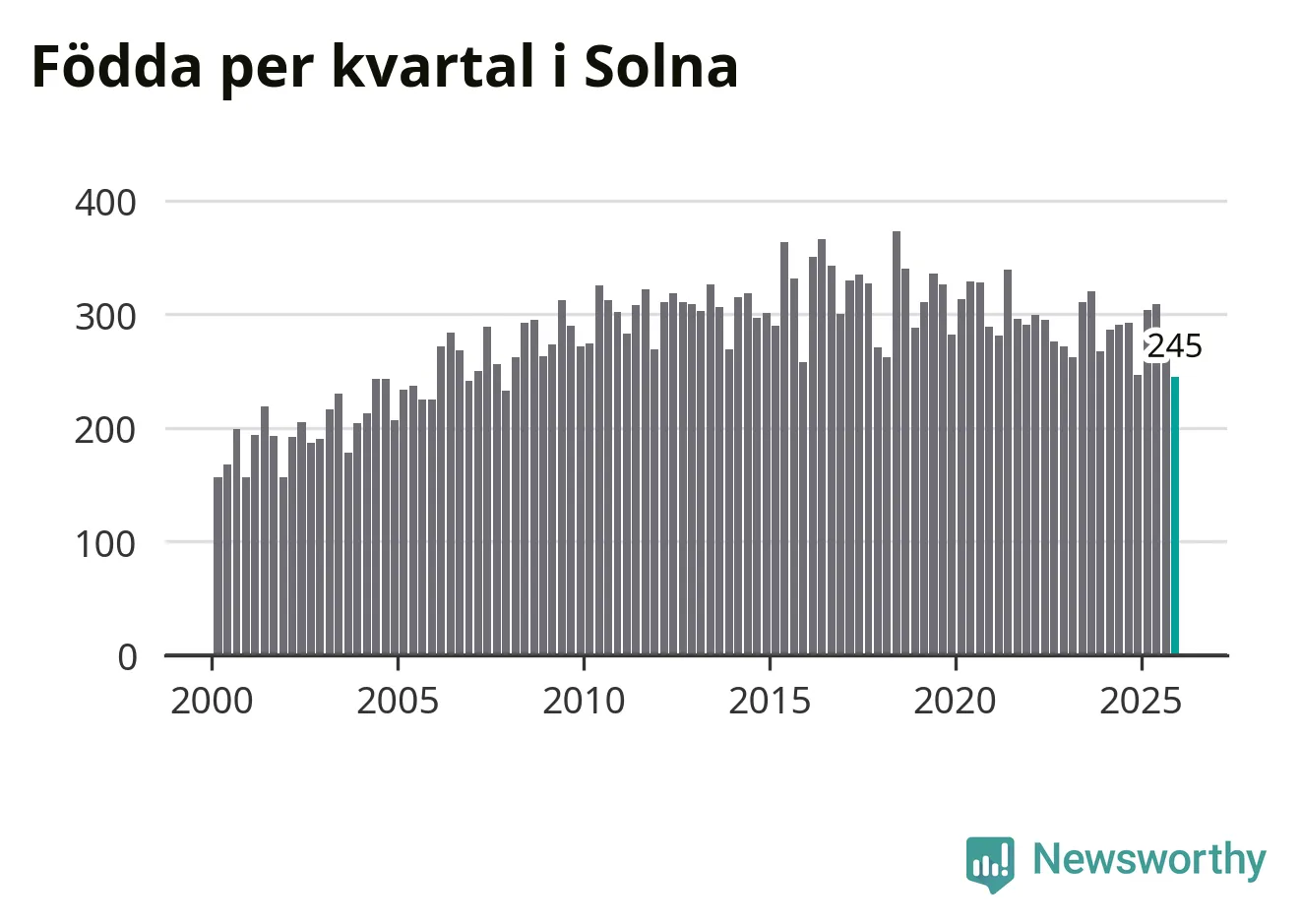 Enligt SCB:s siffror föddes 245 barn i Solna under det senaste kvartalet. Samtidigt avled relativt få – 113 personer. Solna hade alltså ett positivt födelsenetto, vilket kommunen historiskt sett i princip alltid har haft.