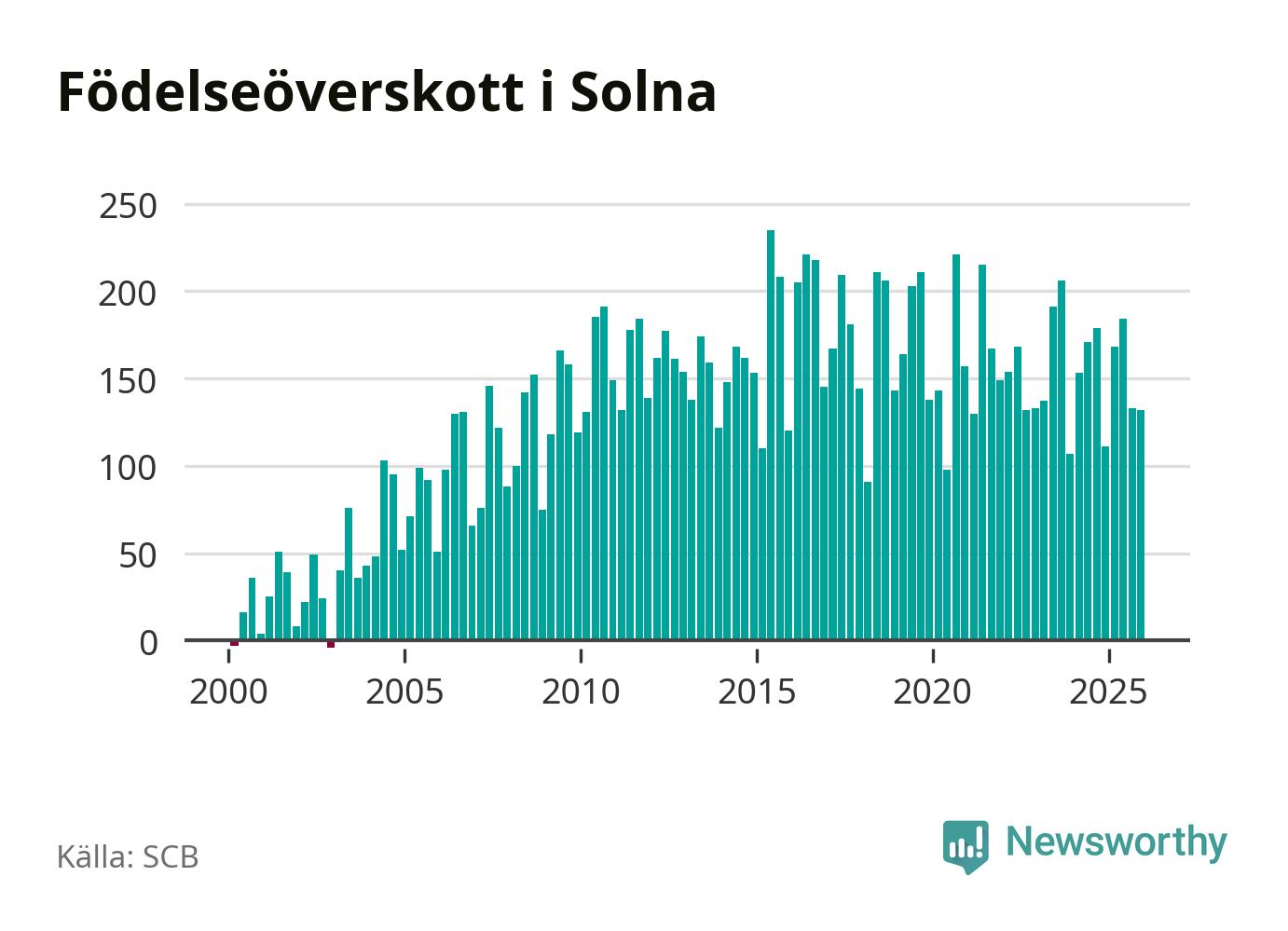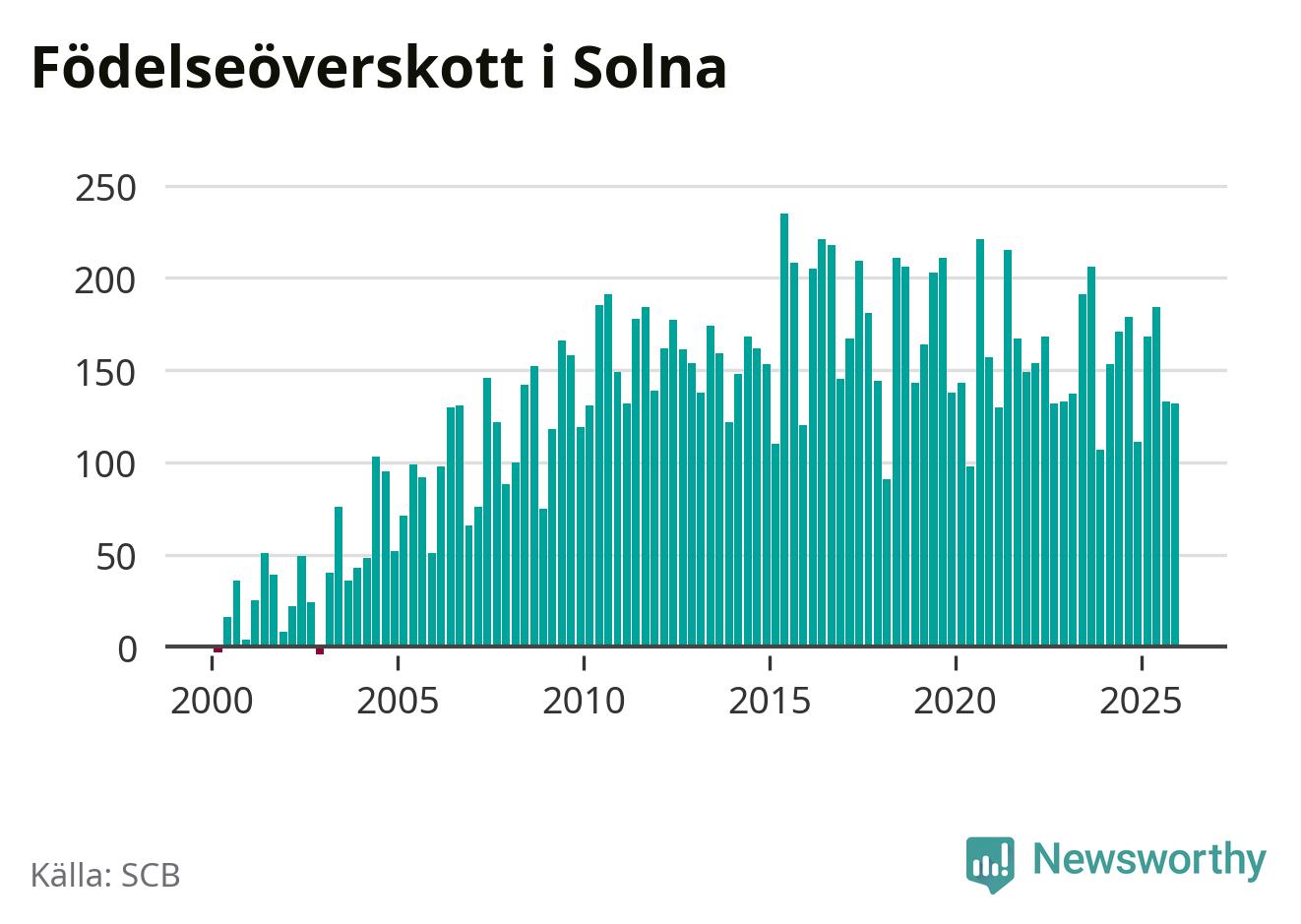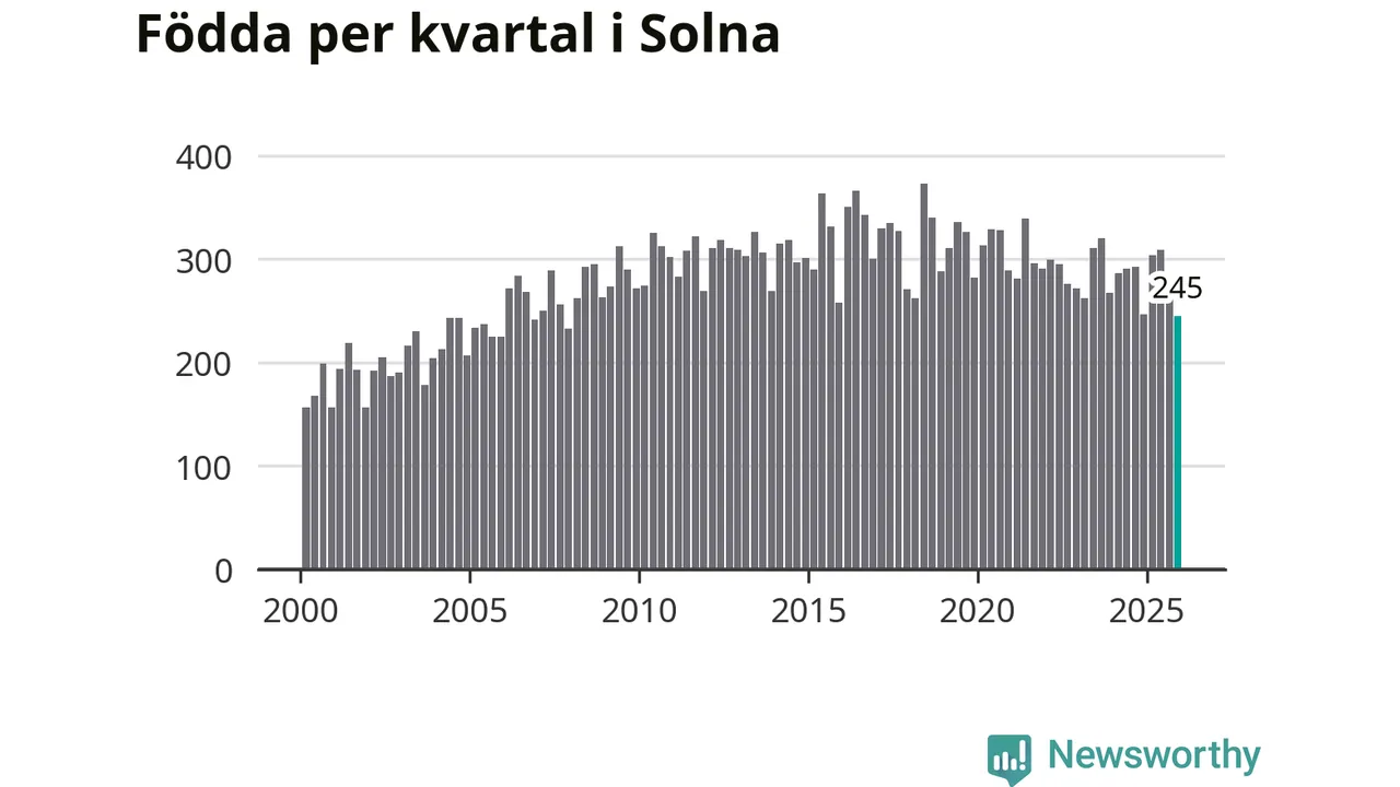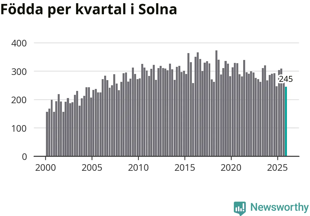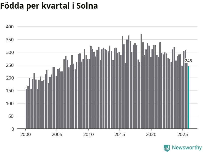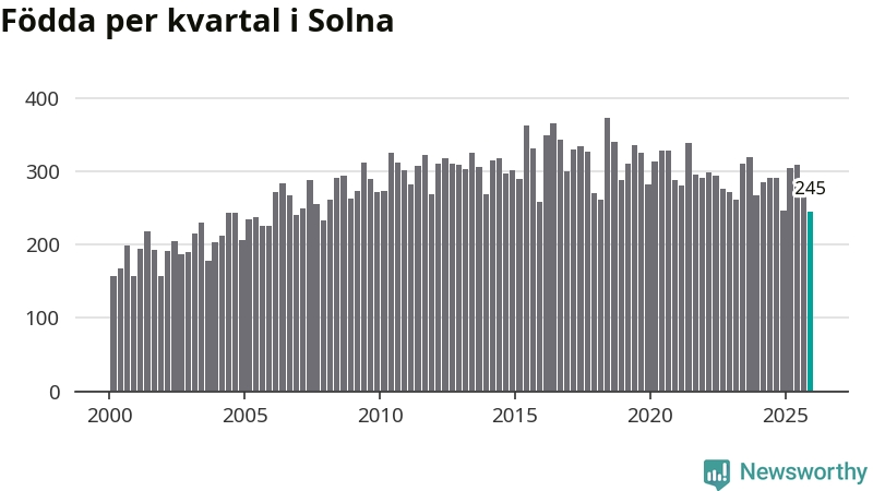 Enligt SCB:s siffror föddes 245 barn i Solna under det senaste kvartalet. Samtidigt avled relativt få – 113 personer. Solna hade alltså ett positivt födelsenetto, vilket kommunen historiskt sett i princip alltid har haft.