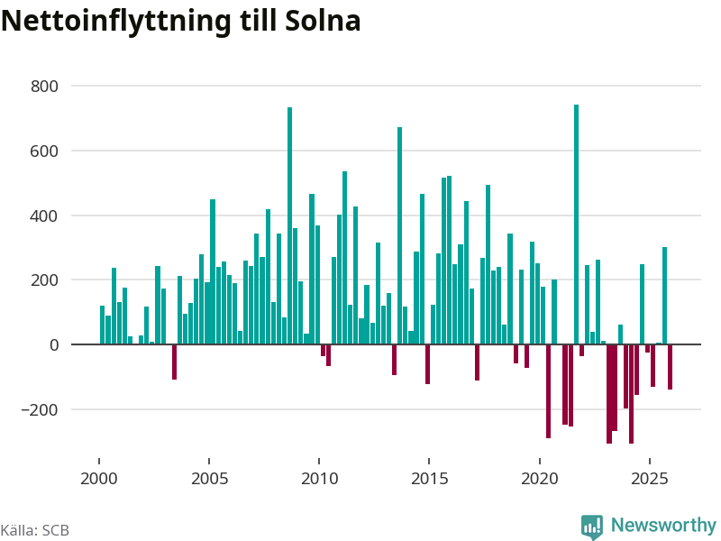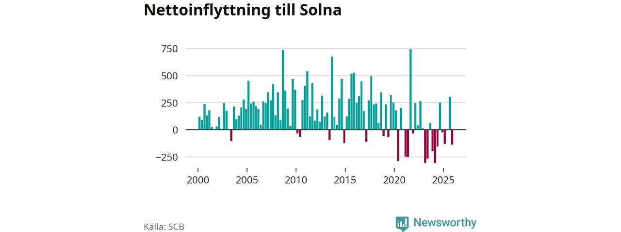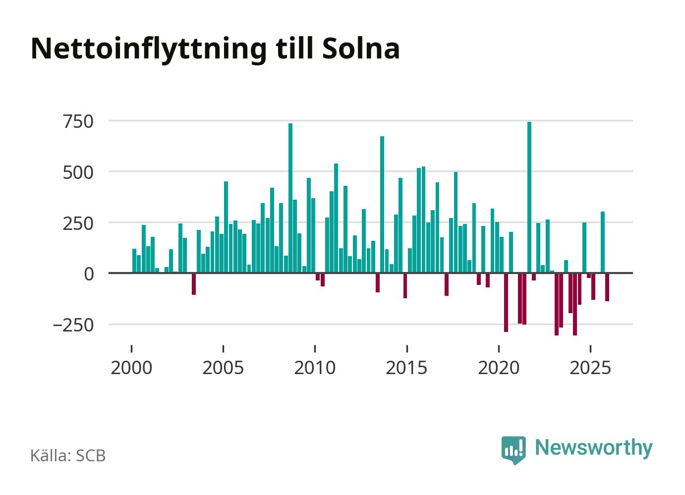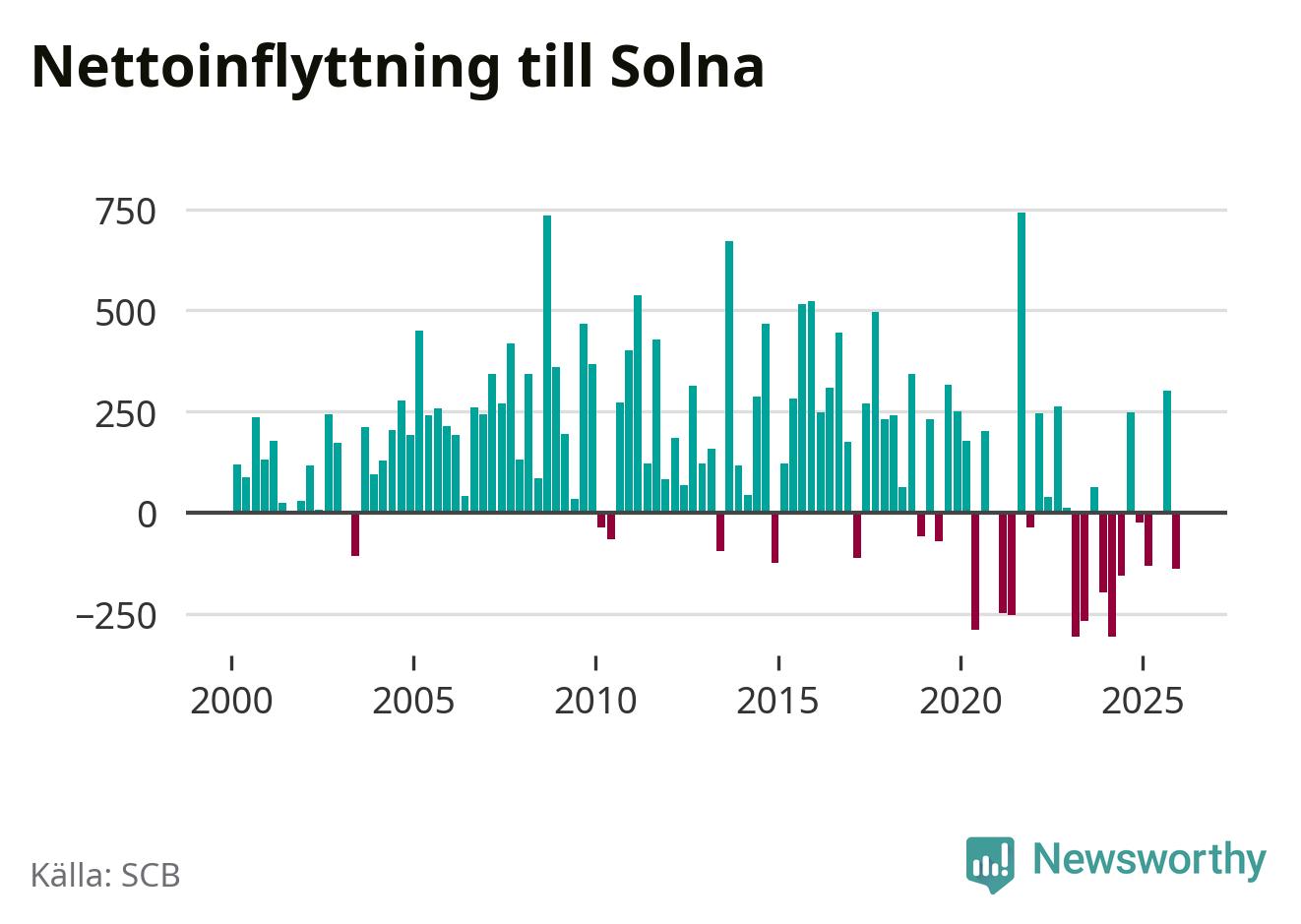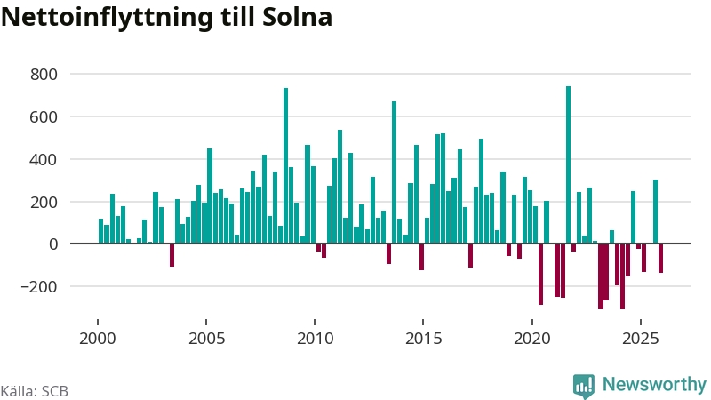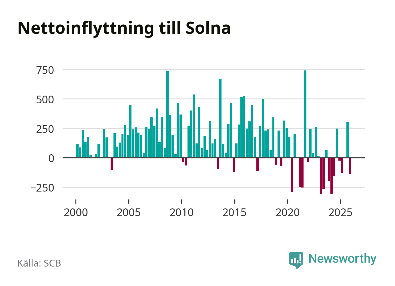 Under fjärde kvartalet 2025 flyttade 2 481 personer till kommunen medan 2 620 personer flyttade därifrån. Sedan seklets början har Solna oftast haft ett positivt flyttnetto.