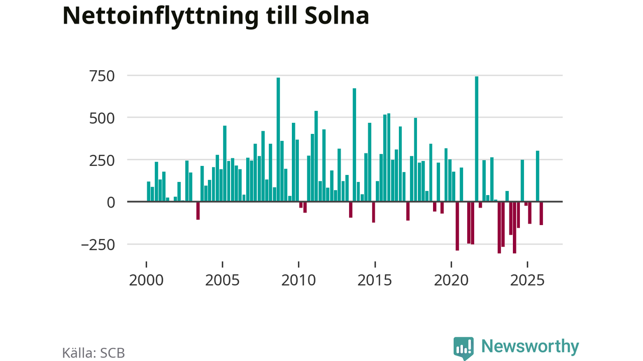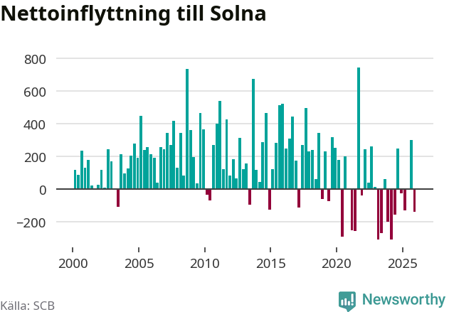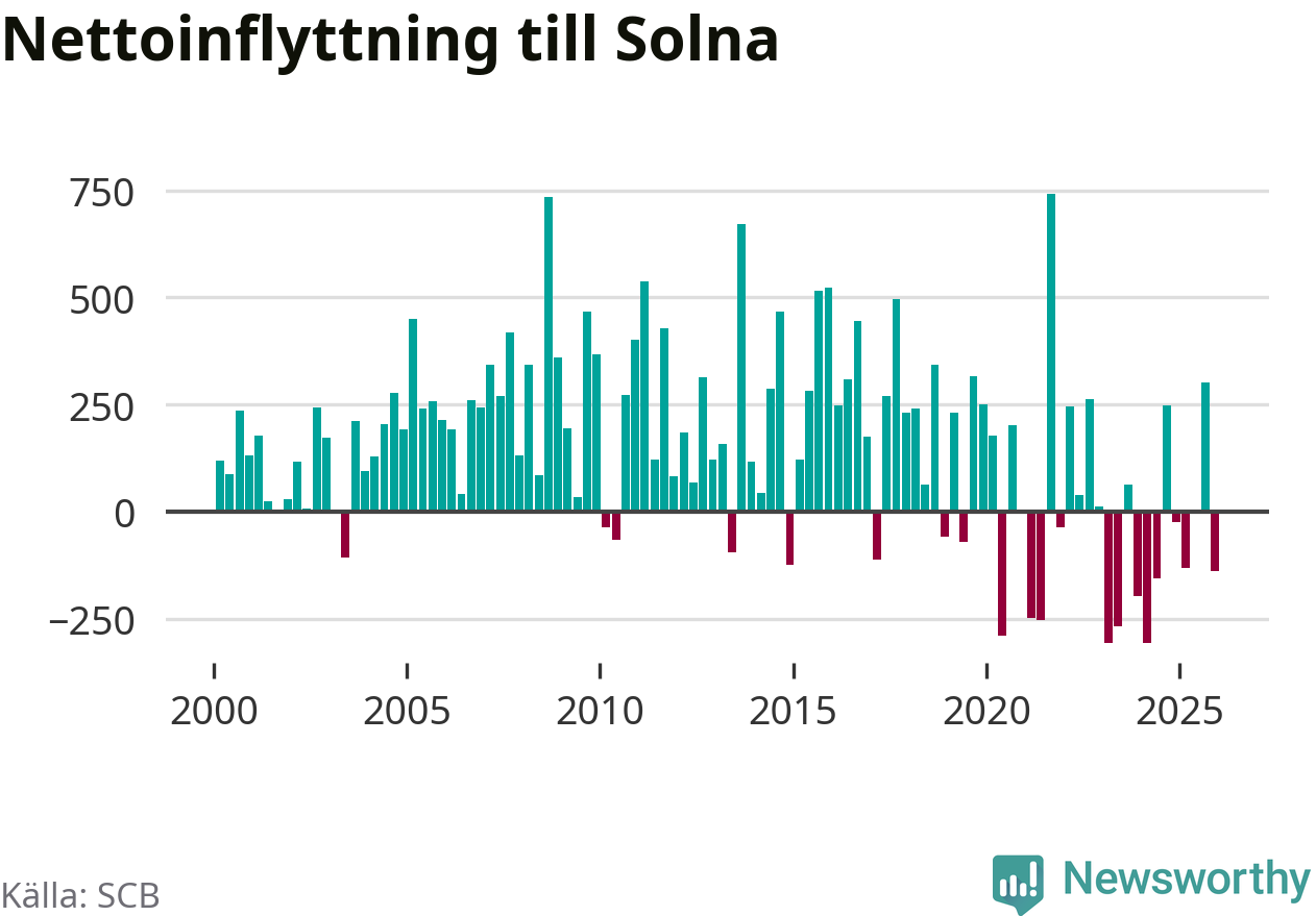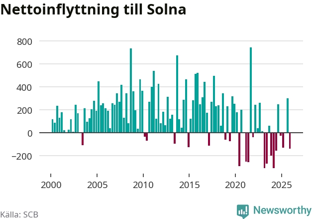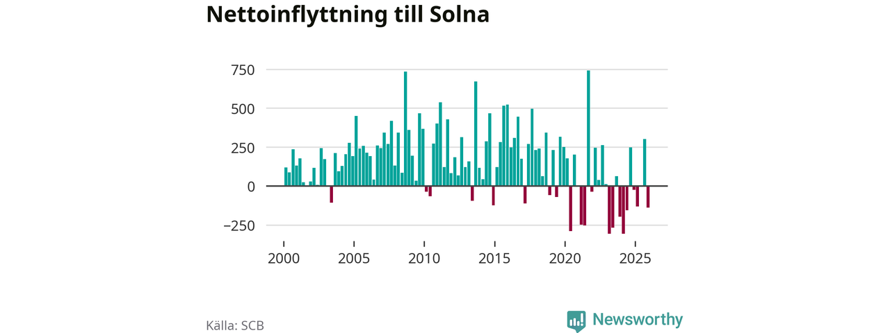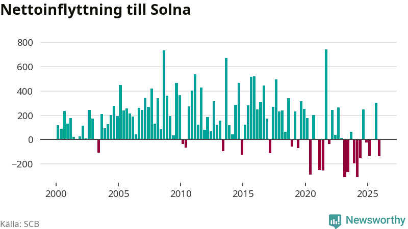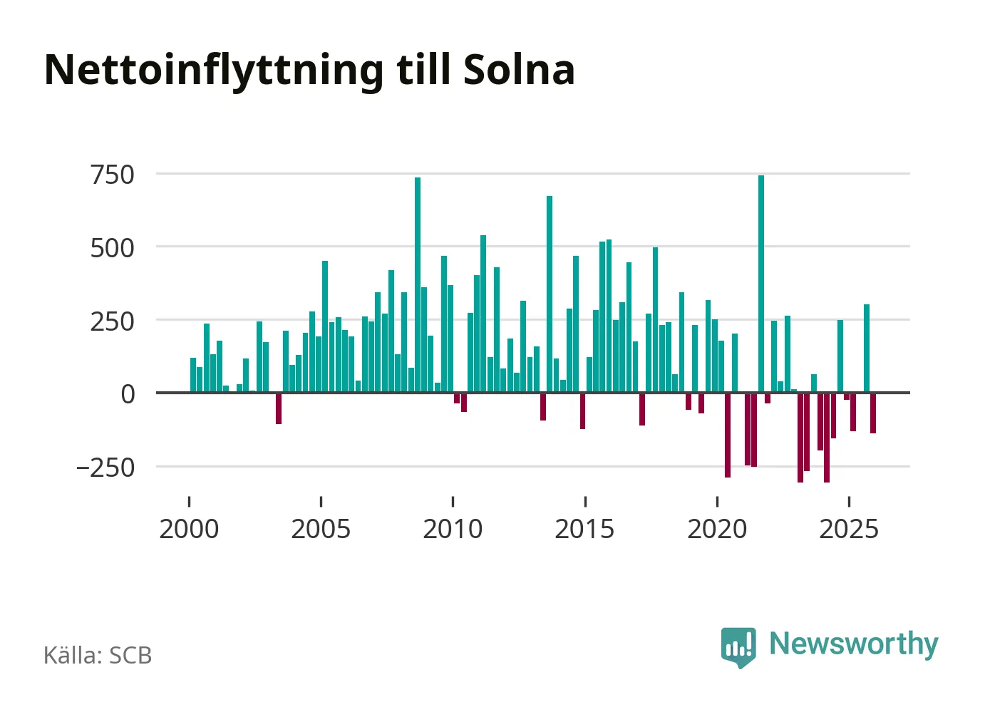 Under fjärde kvartalet 2025 flyttade 2 481 personer till kommunen medan 2 620 personer flyttade därifrån. Sedan seklets början har Solna oftast haft ett positivt flyttnetto.