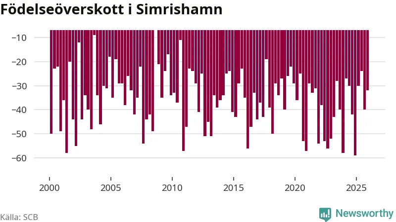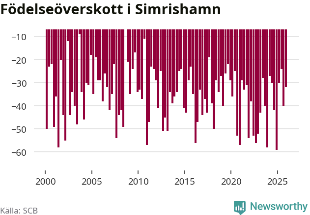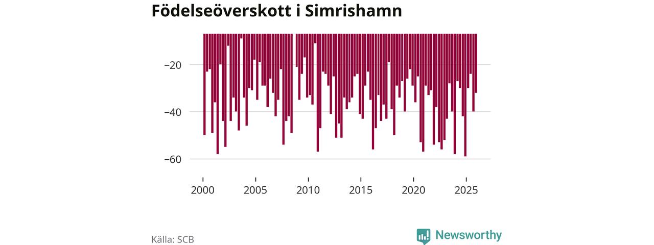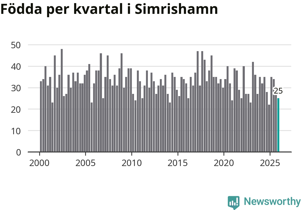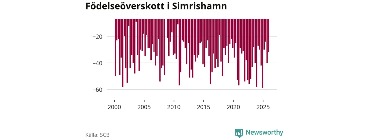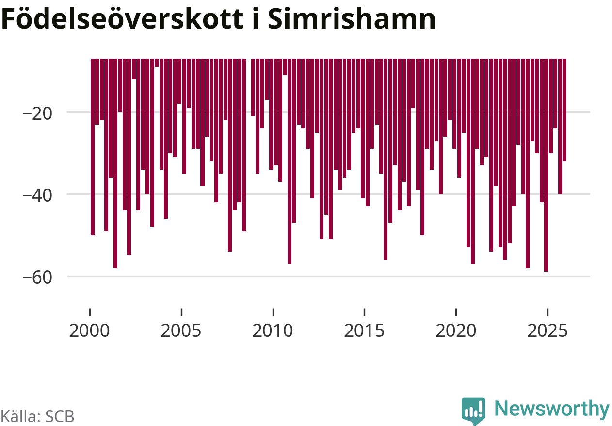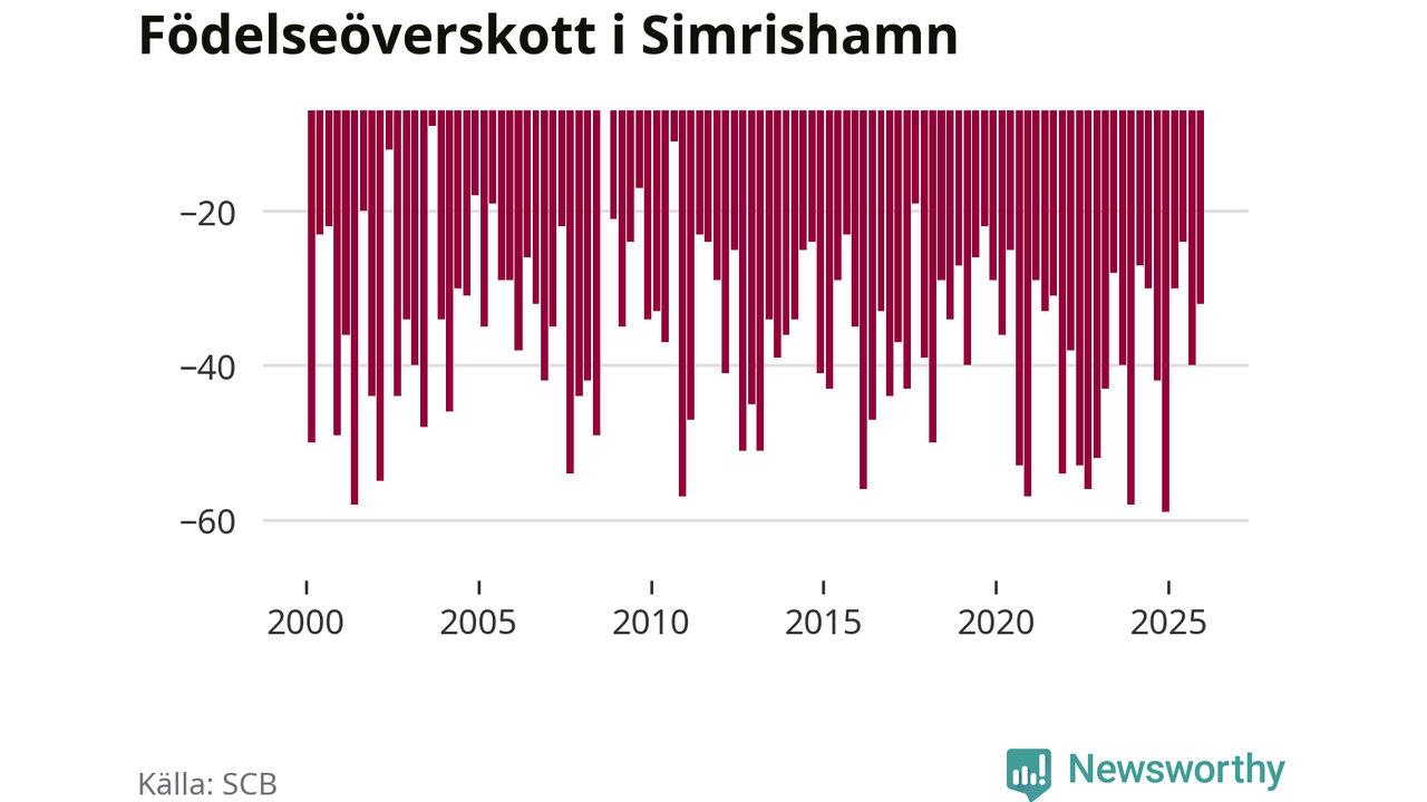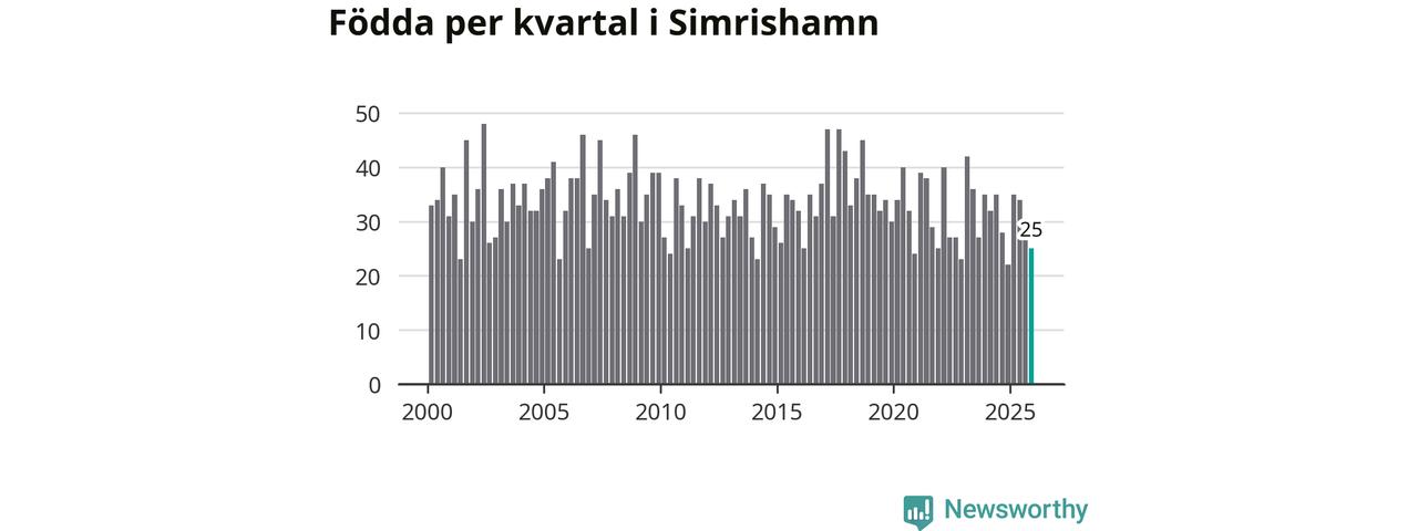 Enligt SCB:s siffror föddes 25 barn i Simrishamn under det senaste kvartalet. Samtidigt avled 57 personer. Simrishamn hade alltså ett negativt födelsenetto, vilket kommunen historiskt sett i princip alltid har haft.