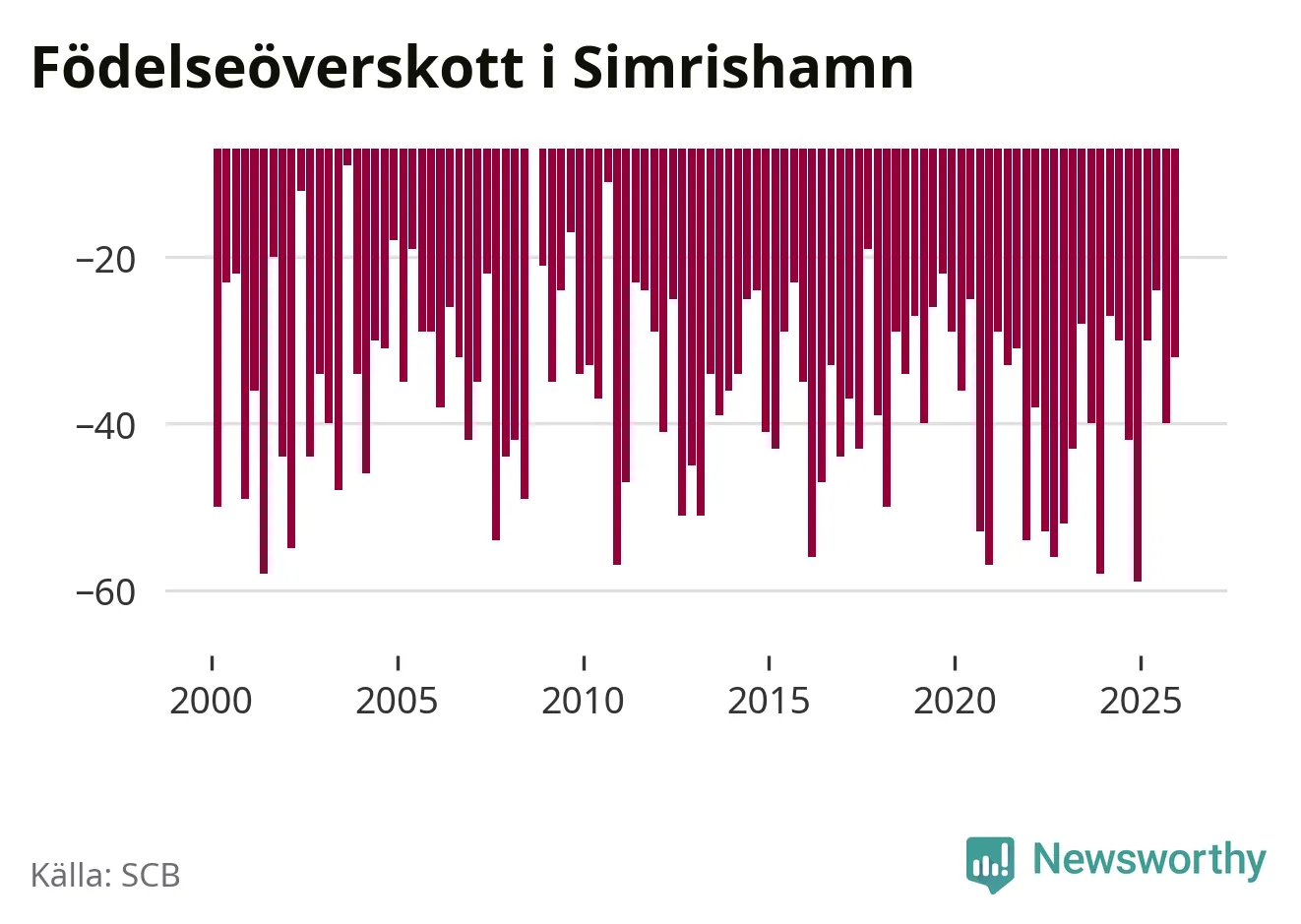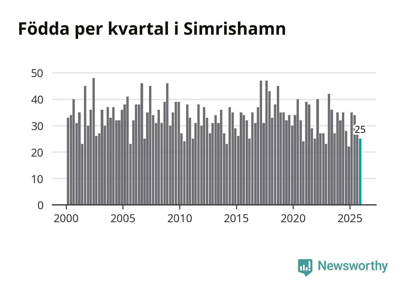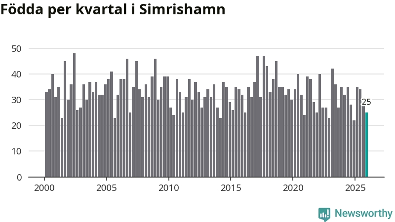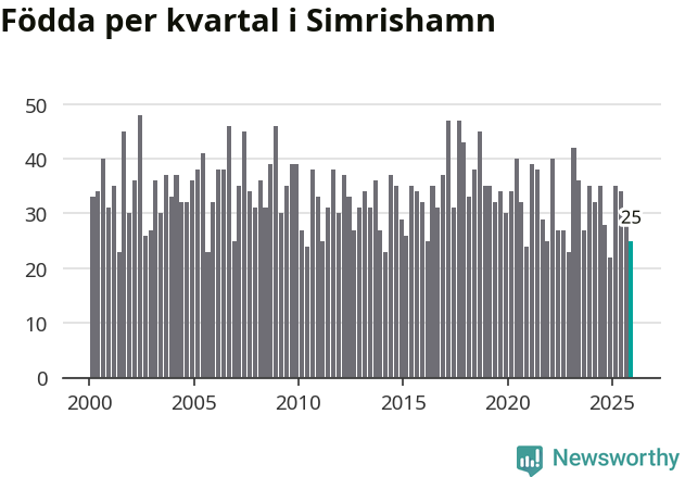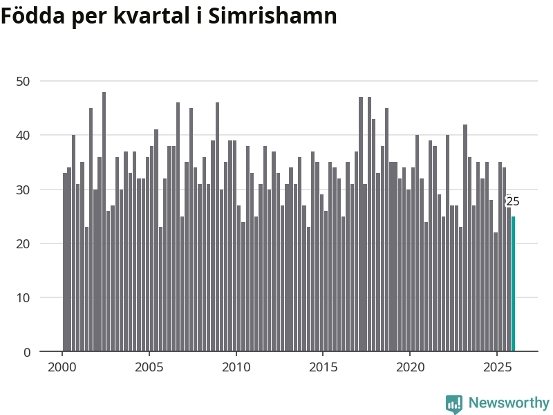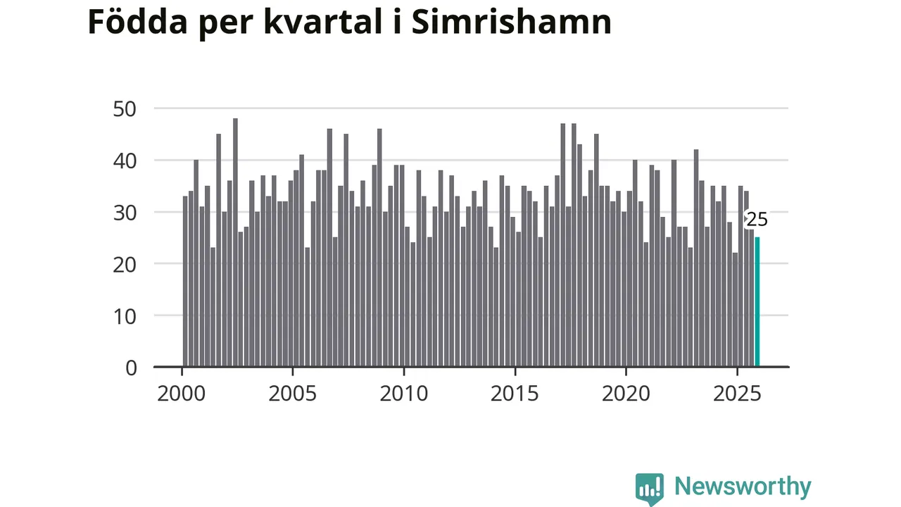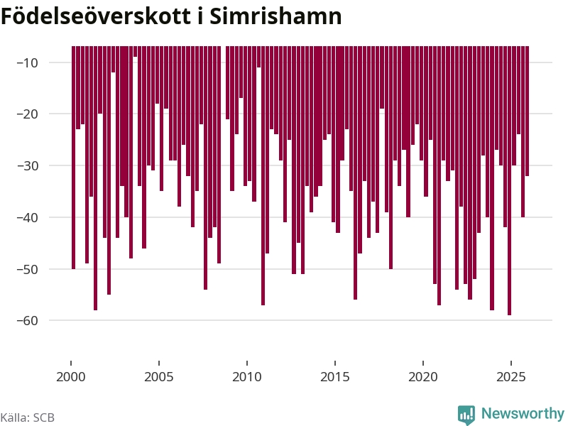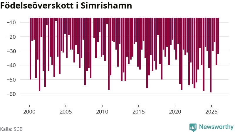 Enligt SCB:s siffror föddes 25 barn i Simrishamn under det senaste kvartalet. Samtidigt avled 57 personer. Simrishamn hade alltså ett negativt födelsenetto, vilket kommunen historiskt sett i princip alltid har haft.
