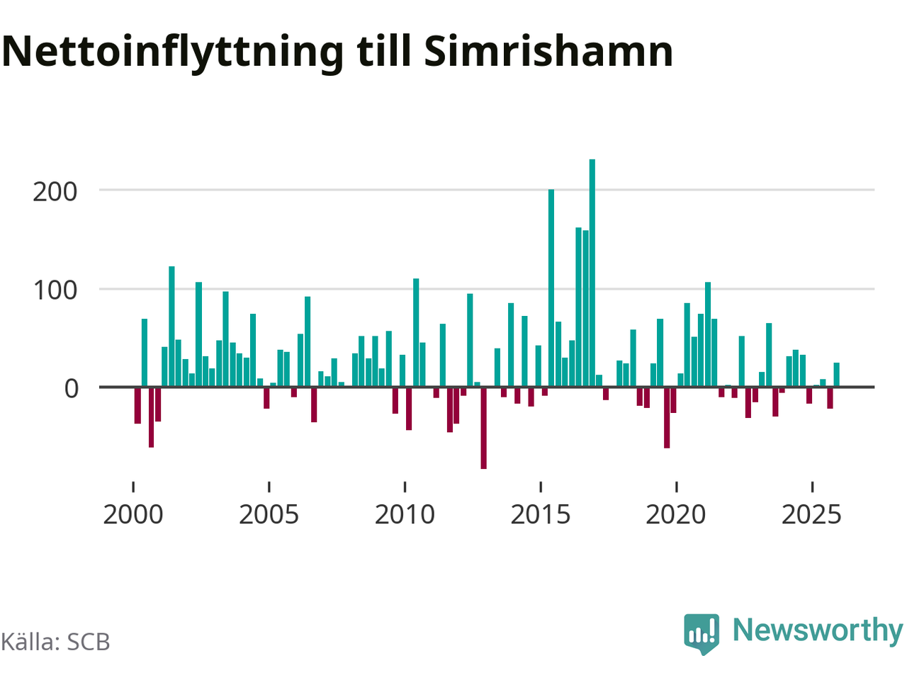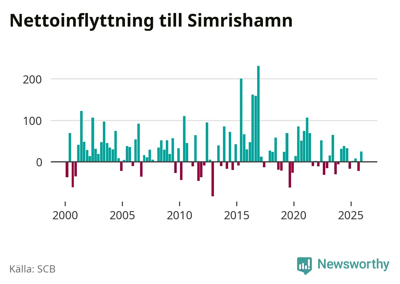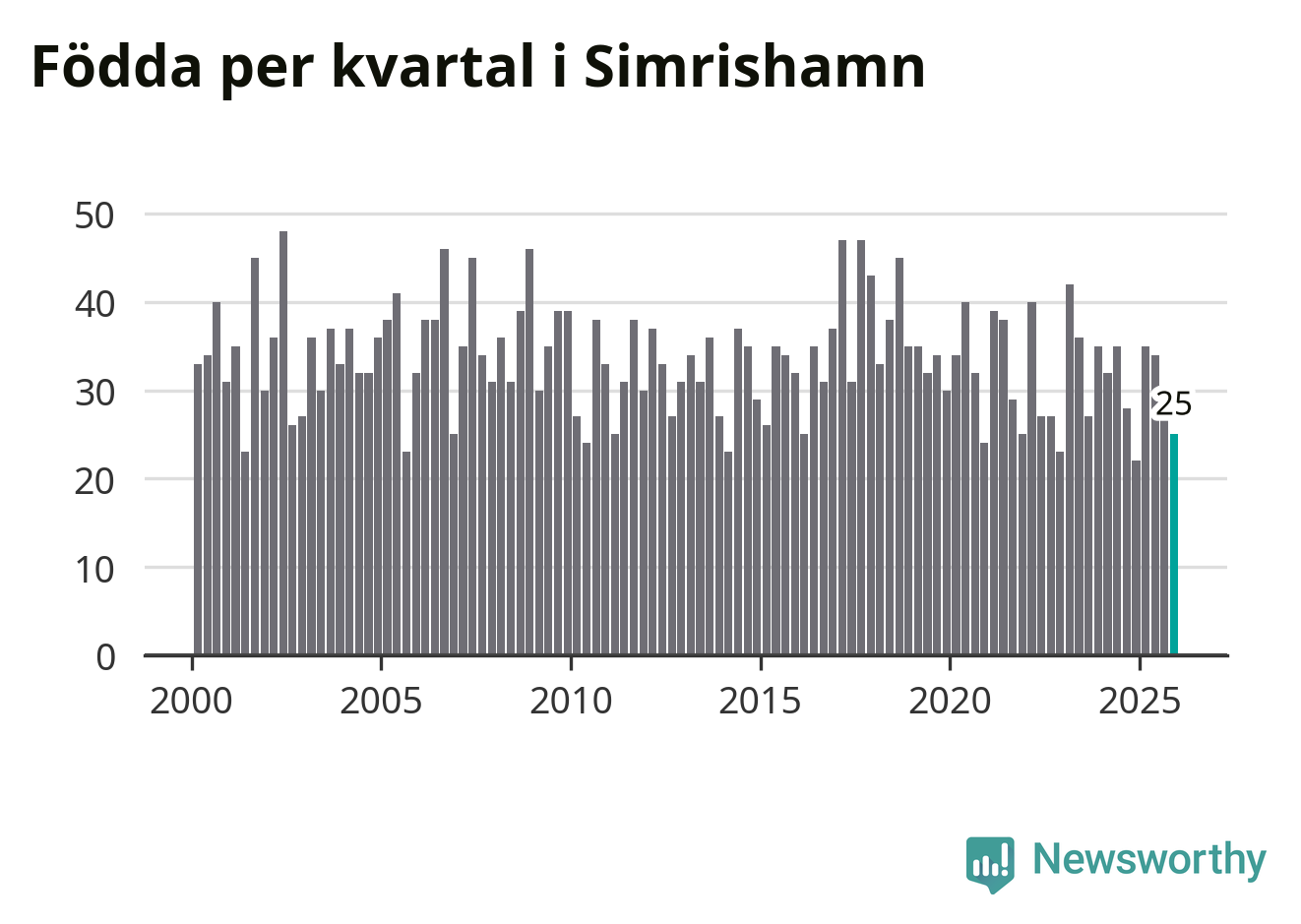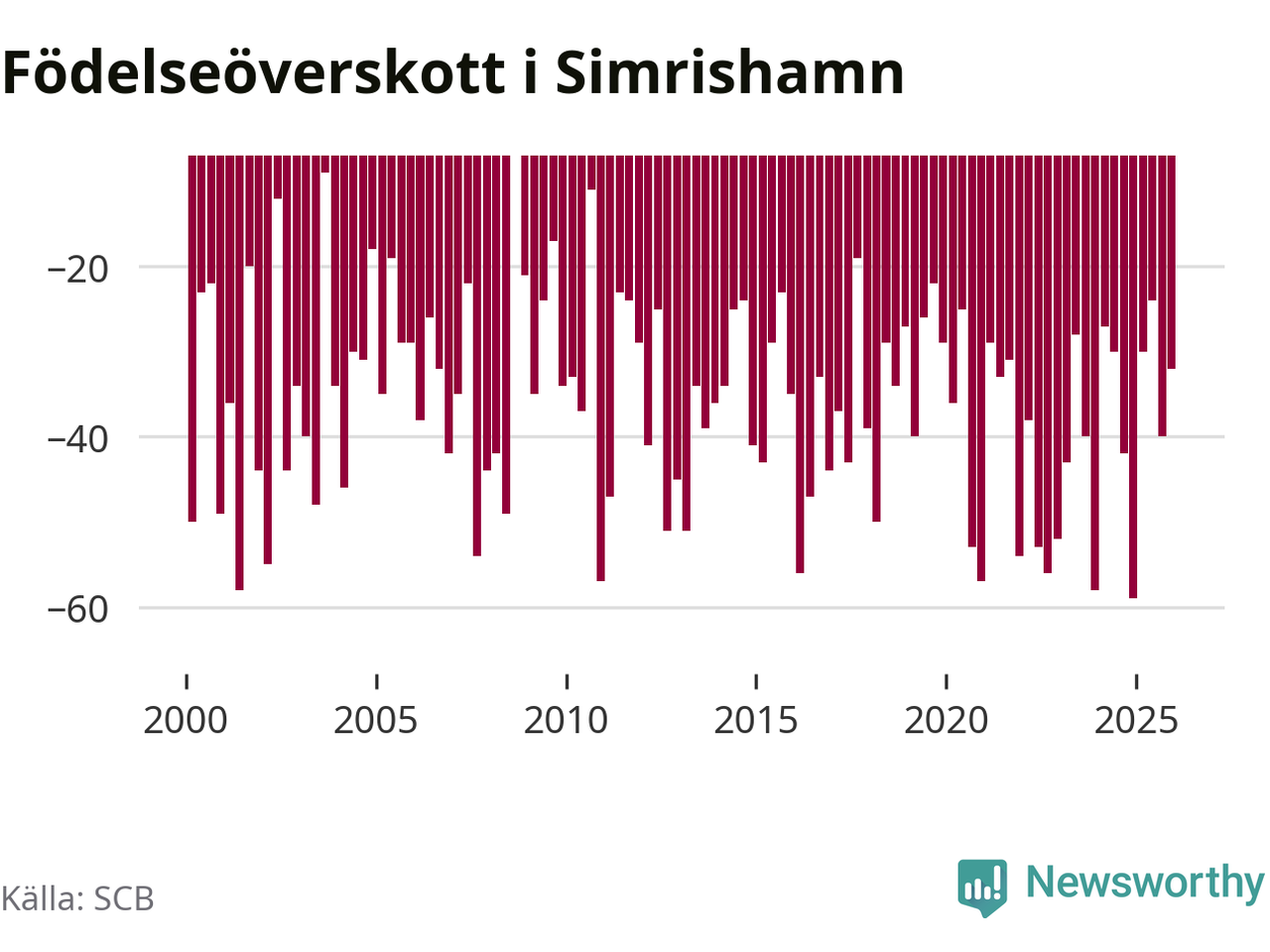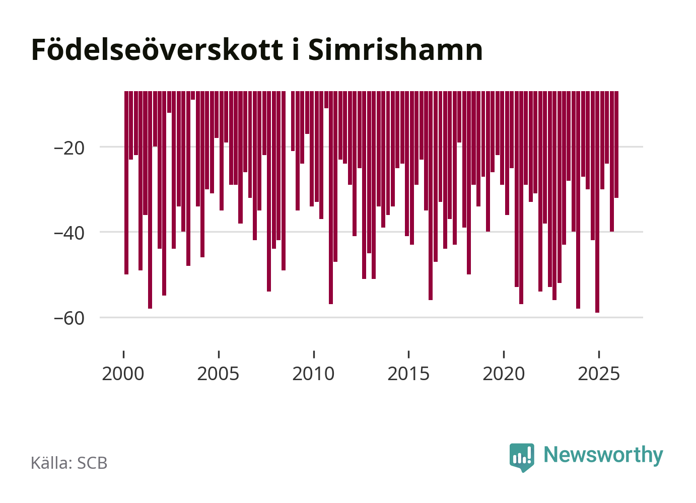 Enligt SCB:s siffror föddes 25 barn i Simrishamn under det senaste kvartalet. Samtidigt avled 57 personer. Simrishamn hade alltså ett negativt födelsenetto, vilket kommunen historiskt sett i princip alltid har haft.
