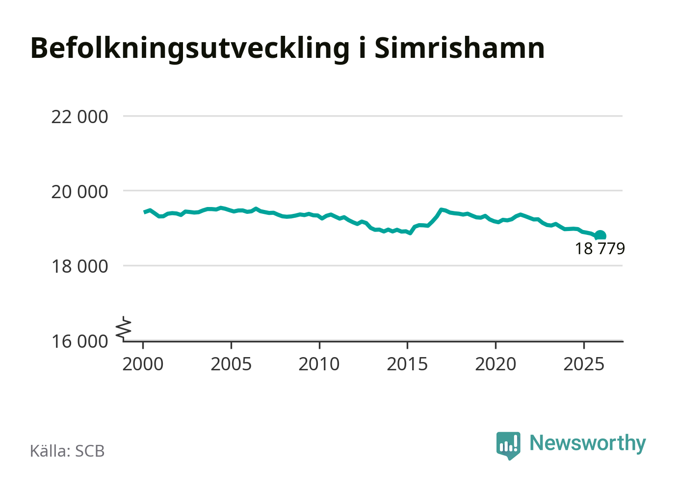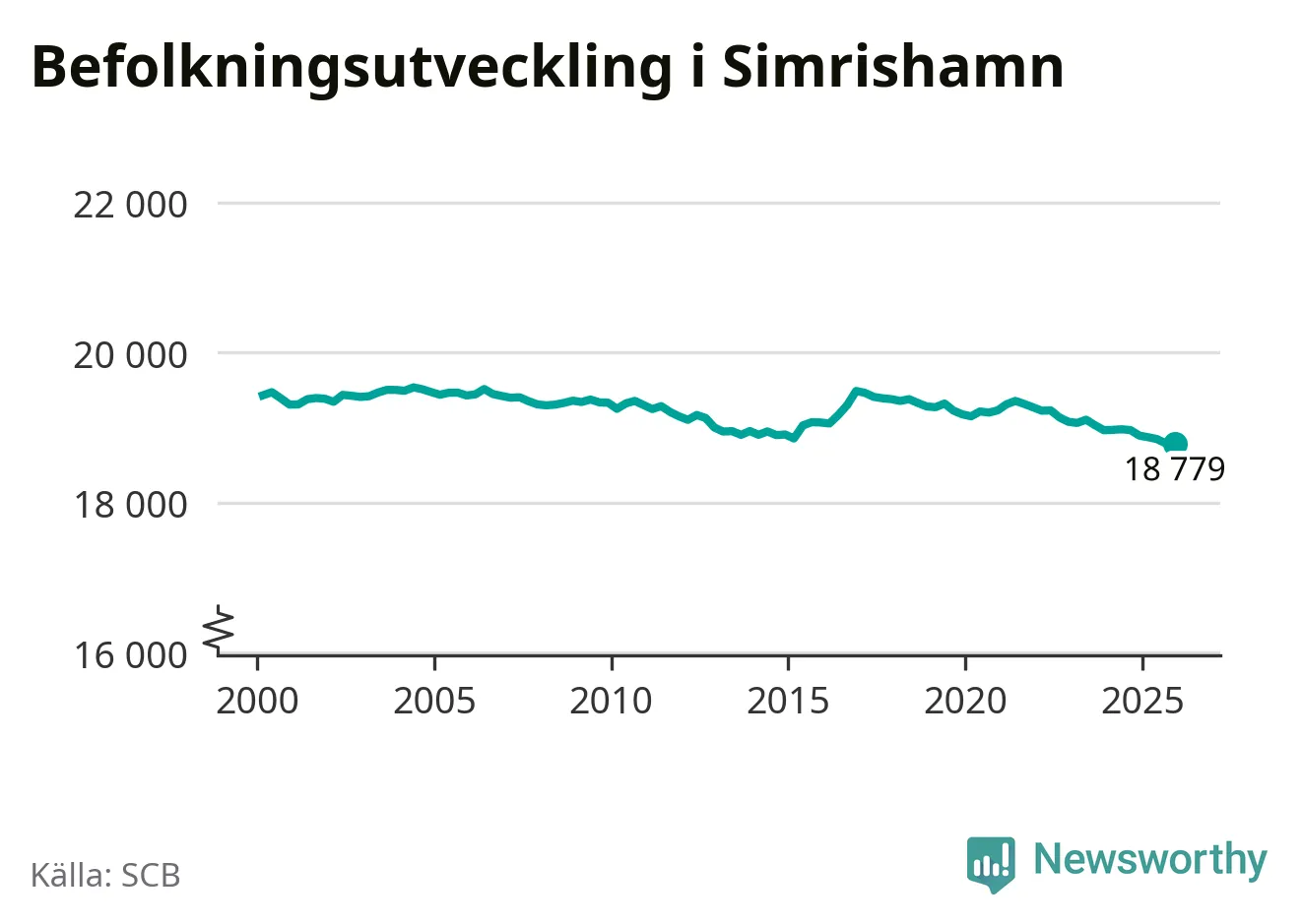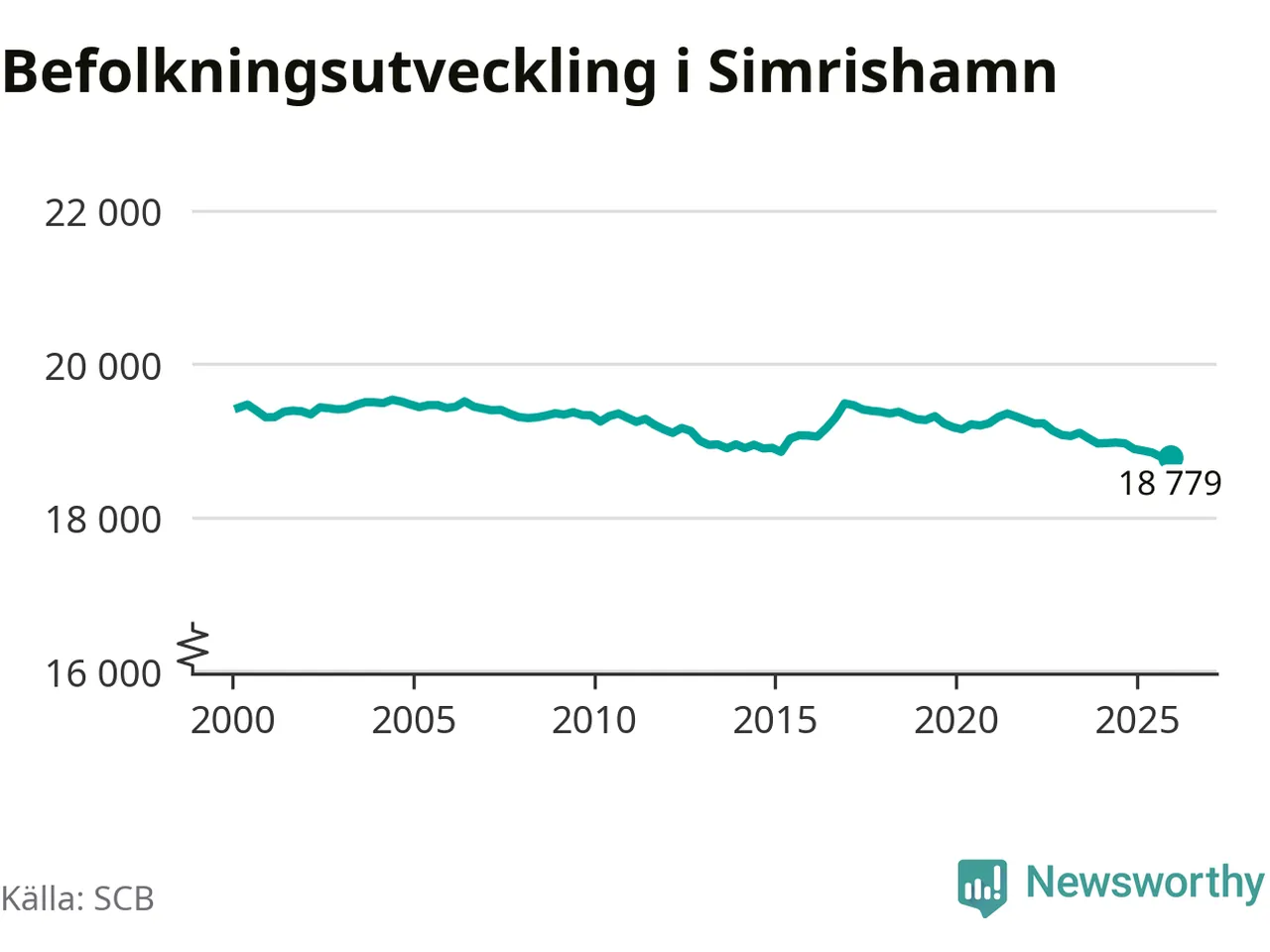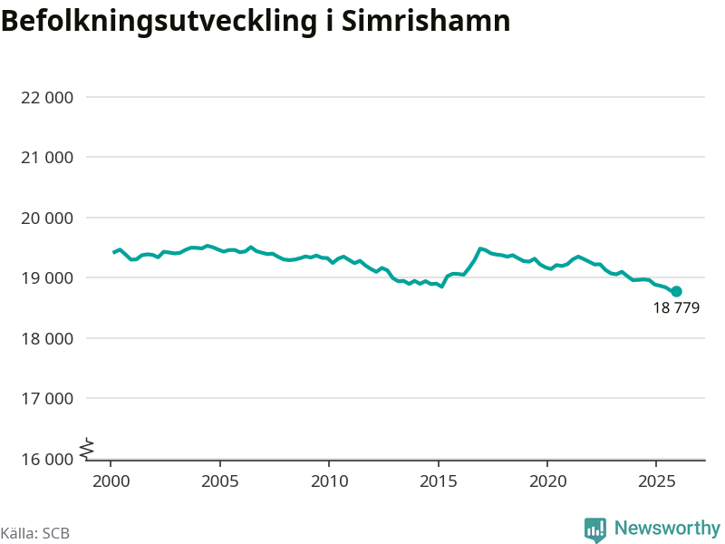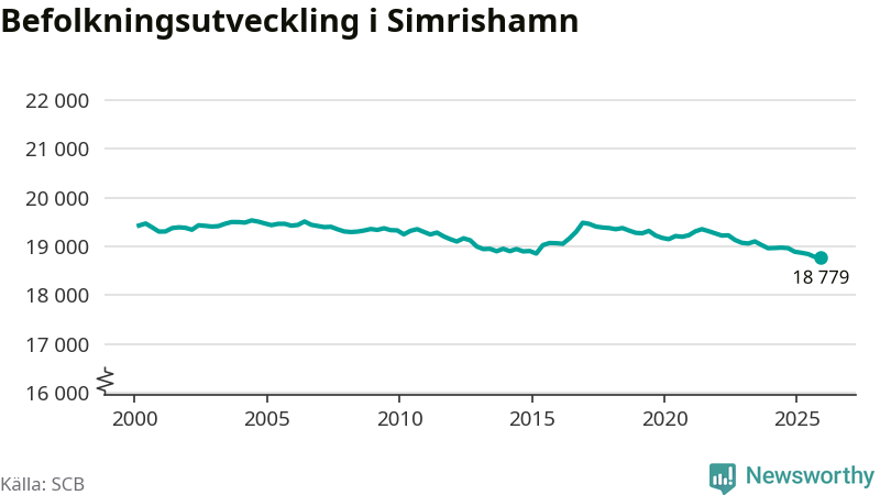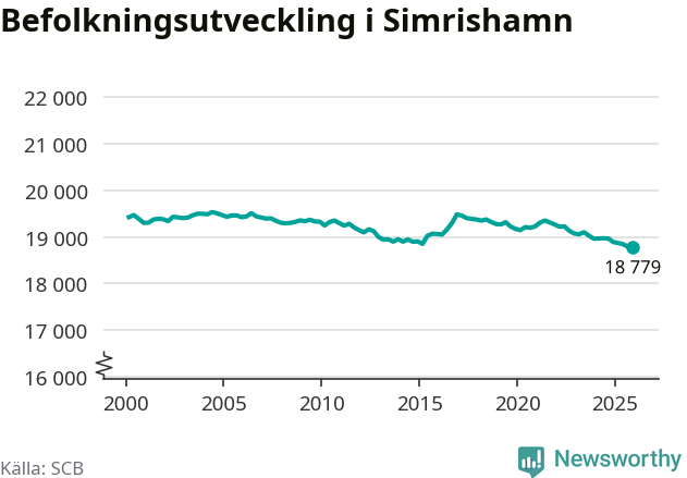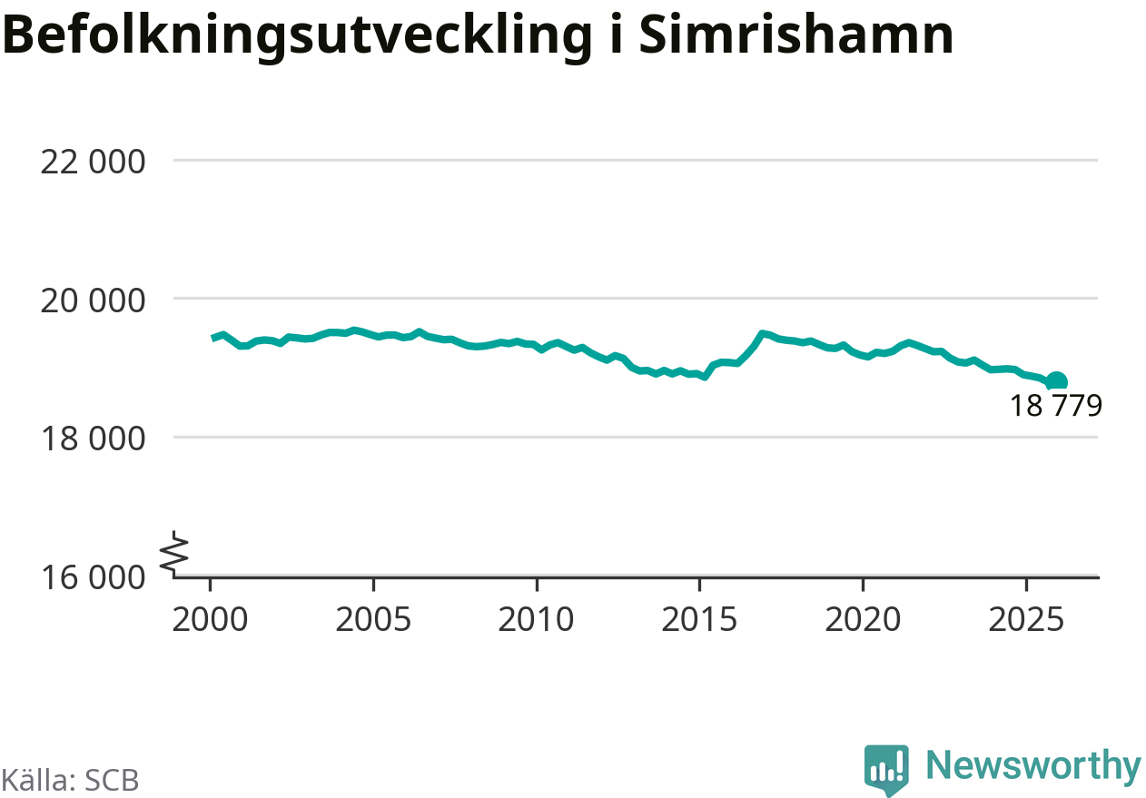 Jämfört med för ett år sedan har befolkningen i Simrishamn minskat med ungefär 110 personer – vilket motsvarar en nedgång på 0,6 procent. Sedan millennieskiftet har folkmängden minskat med runt 650 personer, eller tre procent.