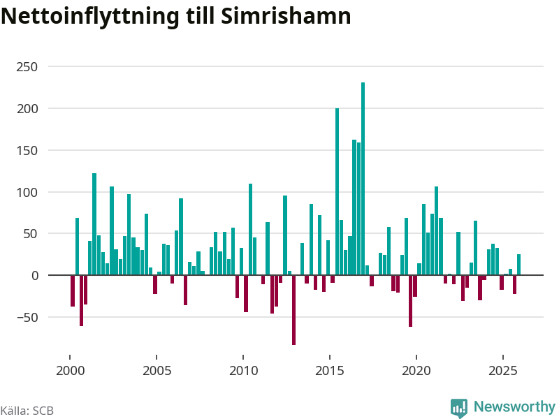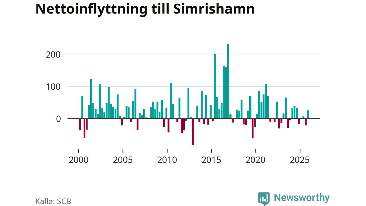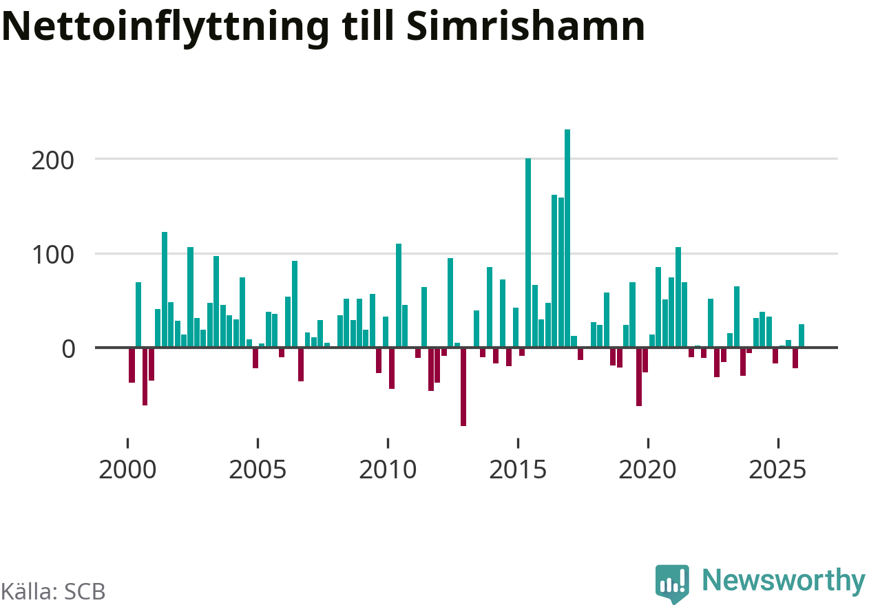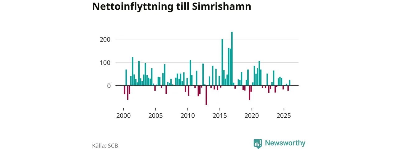 Under fjärde kvartalet 2025 flyttade 267 personer till kommunen medan 242 personer flyttade därifrån. Sedan seklets början har Simrishamn oftast haft ett positivt flyttnetto, inklusive det senaste kvartalet.