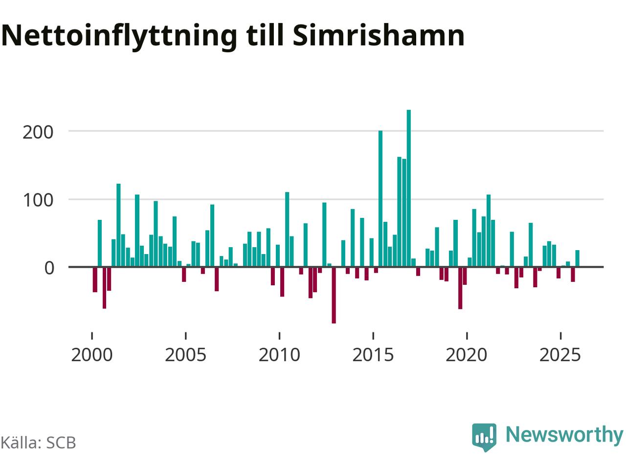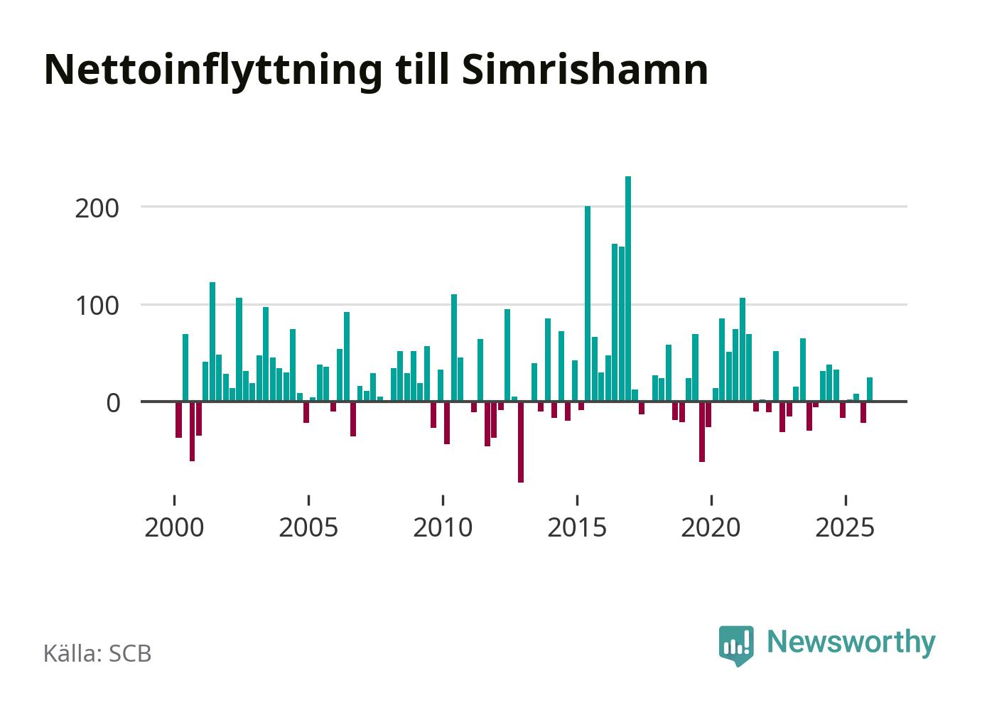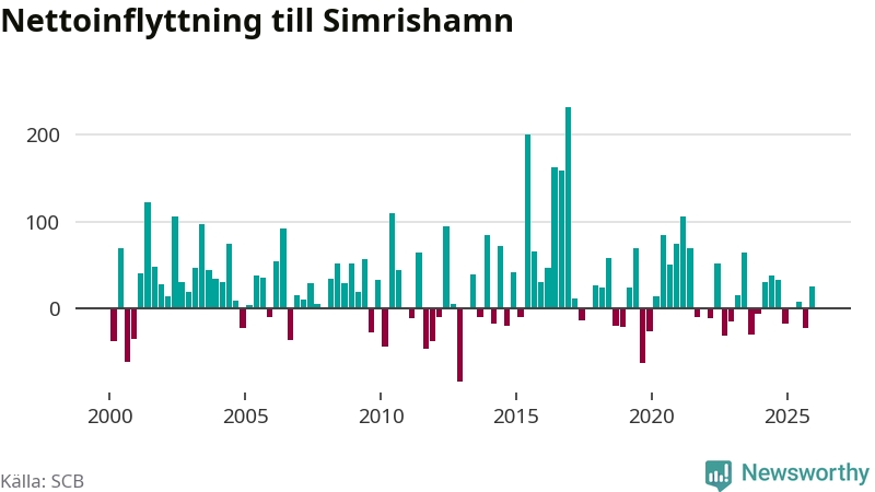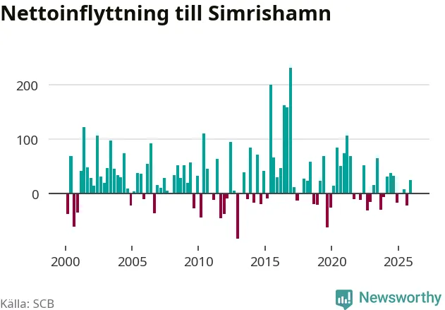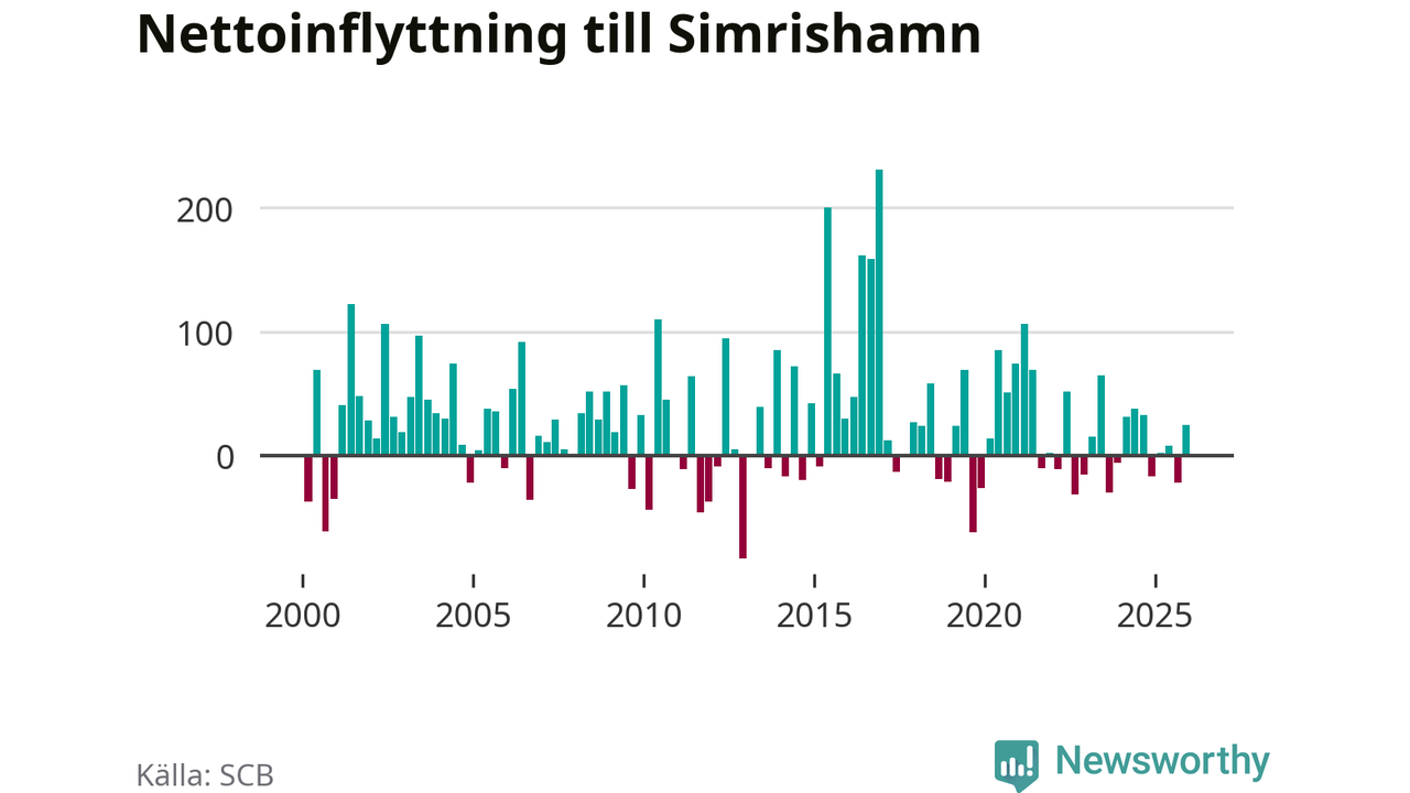Under fjärde kvartalet 2025 flyttade 267 personer till kommunen medan 242 personer flyttade därifrån. Sedan seklets början har Simrishamn oftast haft ett positivt flyttnetto, inklusive det senaste kvartalet.