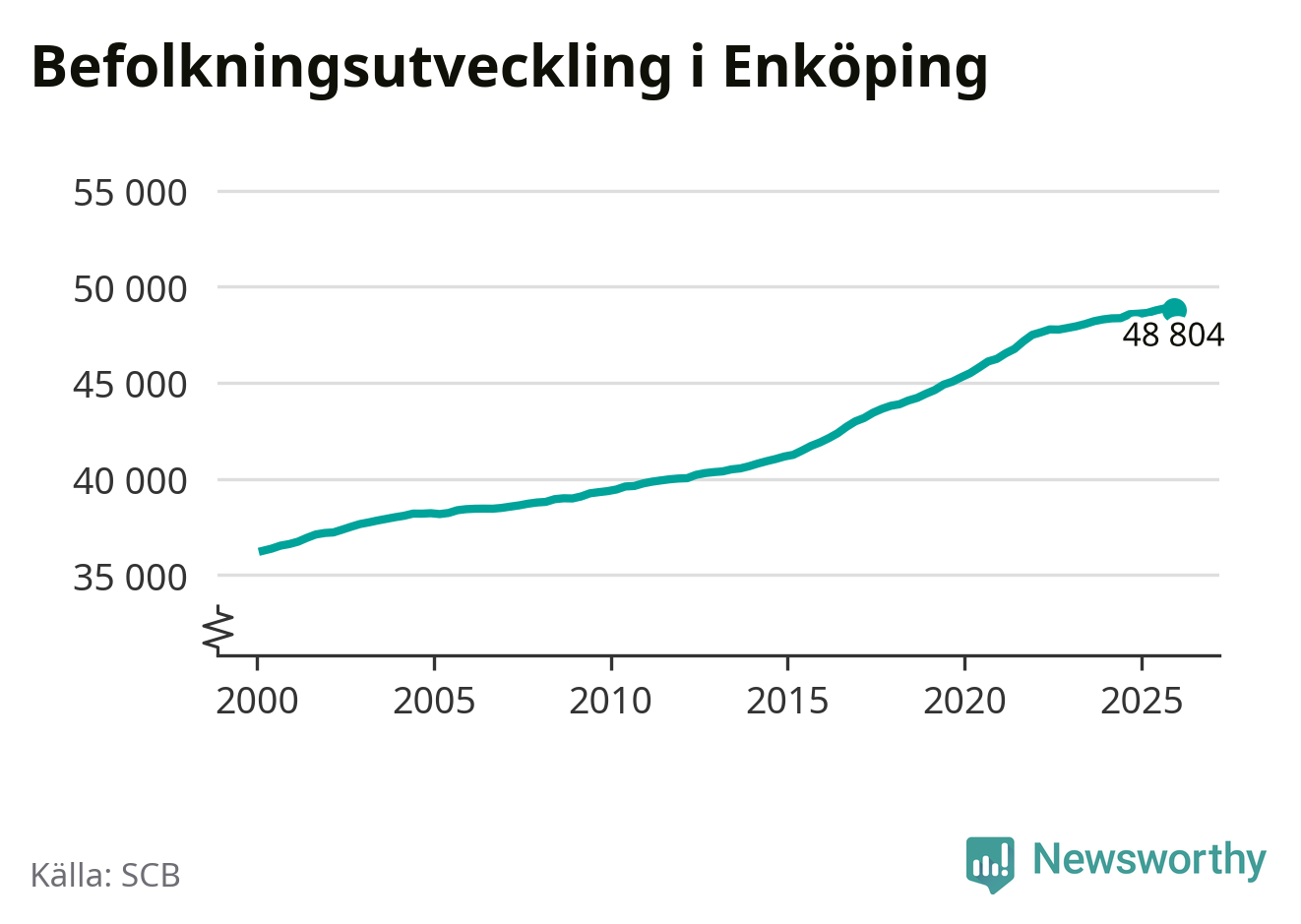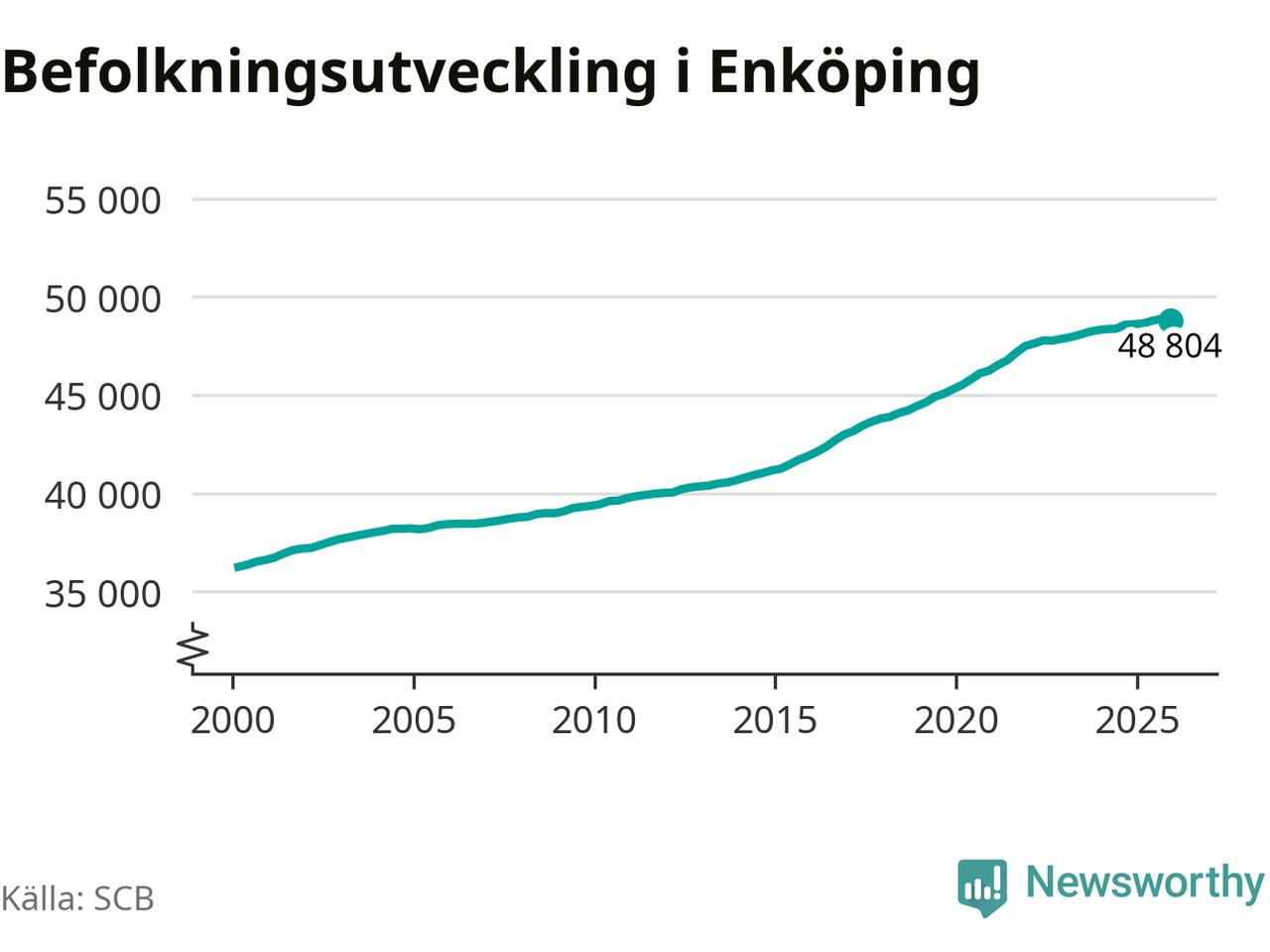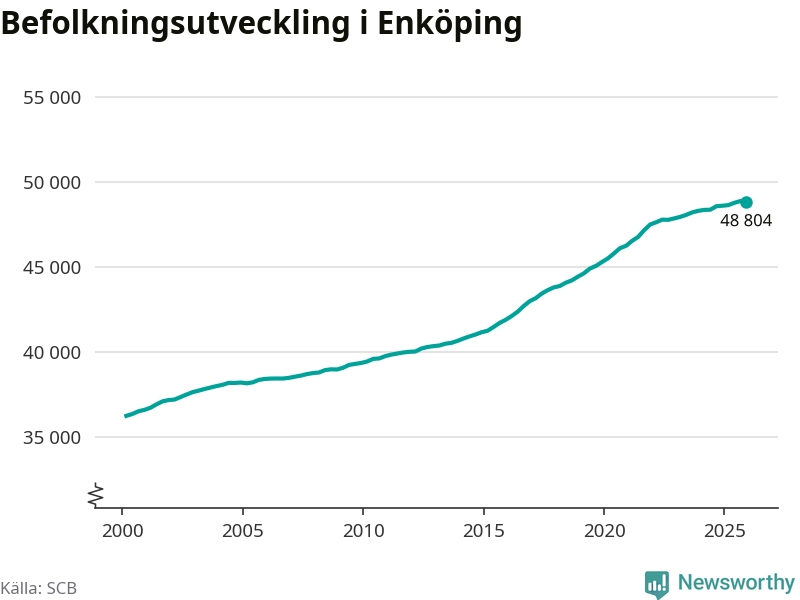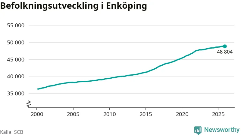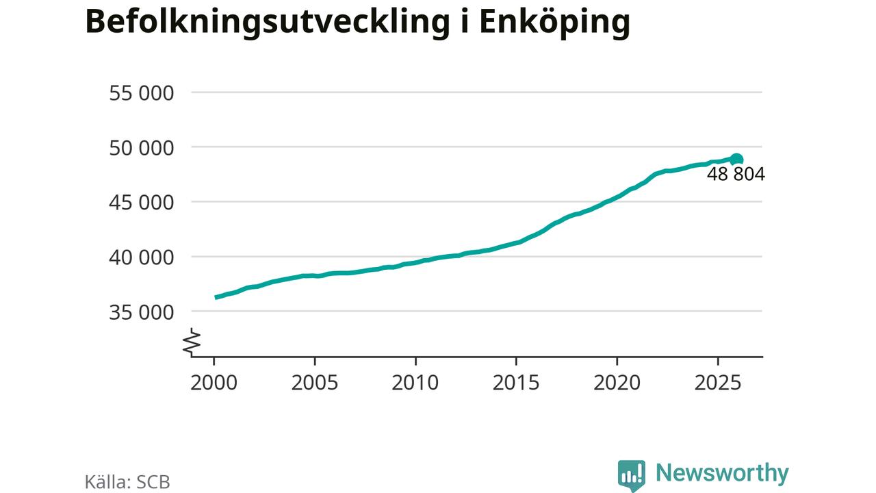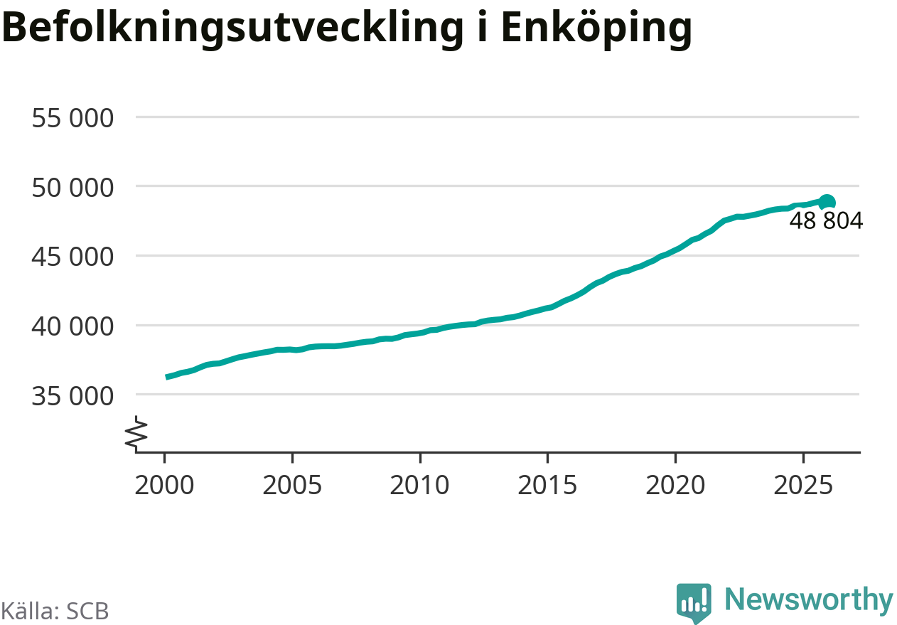 Jämfört med för ett år sedan har befolkningen i Enköping ökat med ungefär 210 personer. Sedan millennieskiftet har folkmängden ökat med runt 12 550 personer, eller 35 procent.