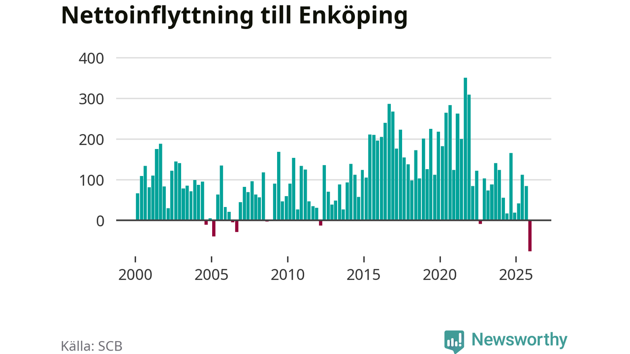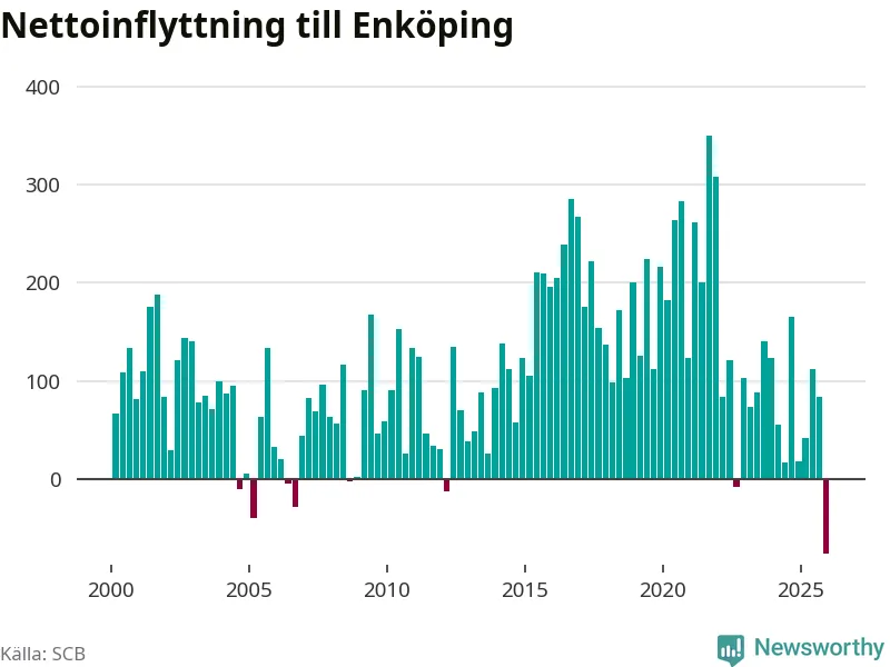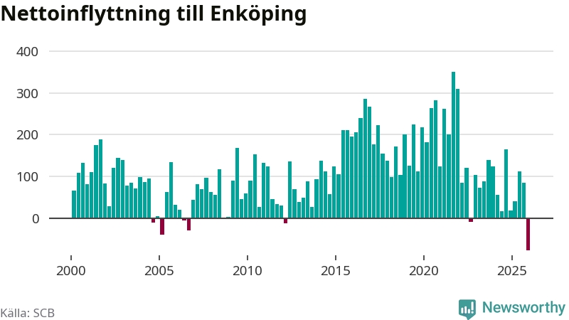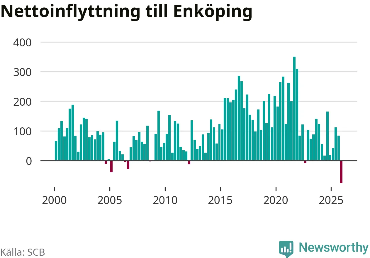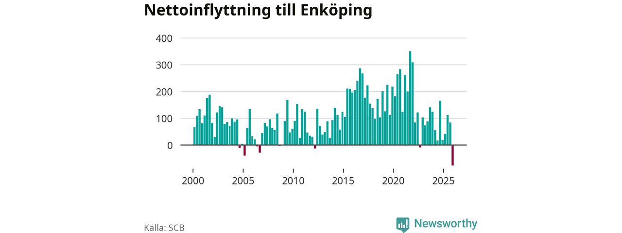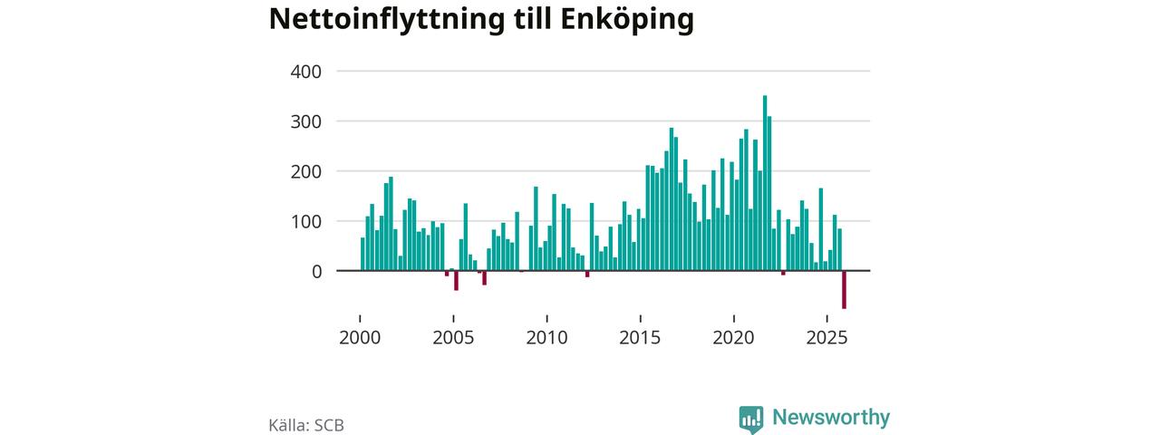 Under fjärde kvartalet 2025 flyttade 570 personer till kommunen medan 647 personer flyttade därifrån. Det är historiskt sett en stor utflyttning under ett kvartal. Det ger den största nettoutflyttningen under ett kvartal sedan åtminstone år 2000. Sedan seklets början har Enköping haft ett positivt flyttnetto under nästan alla kvartal.