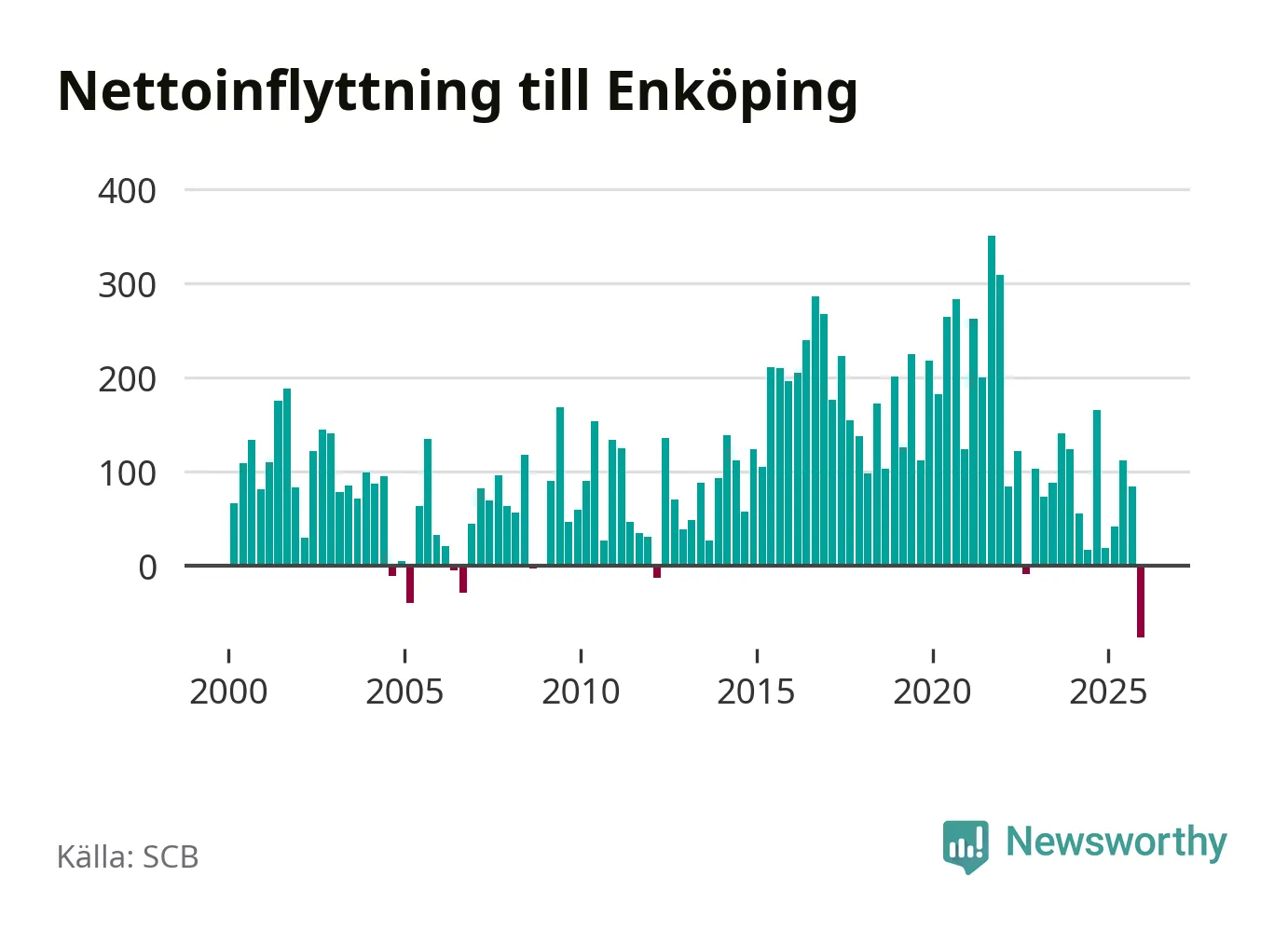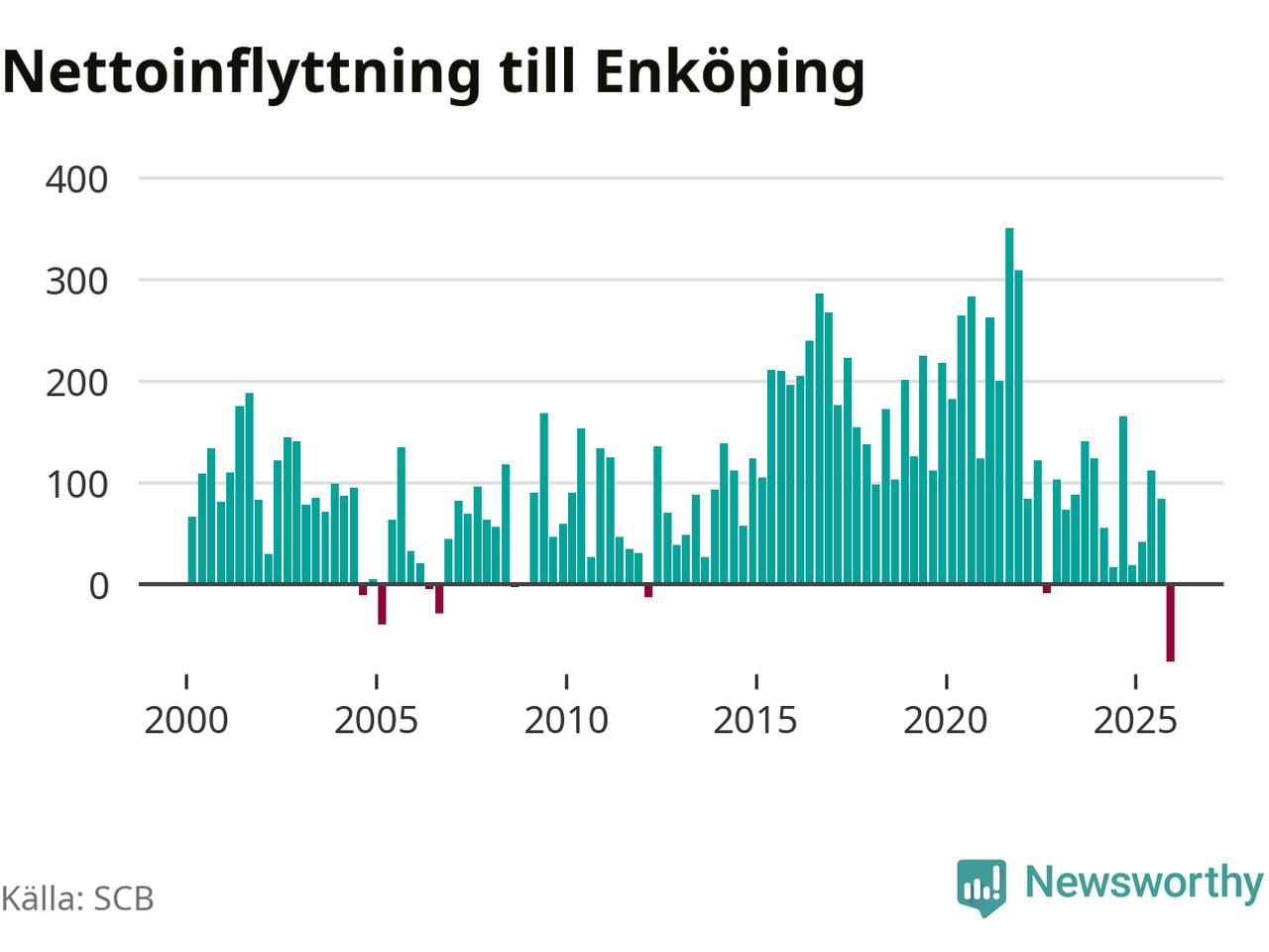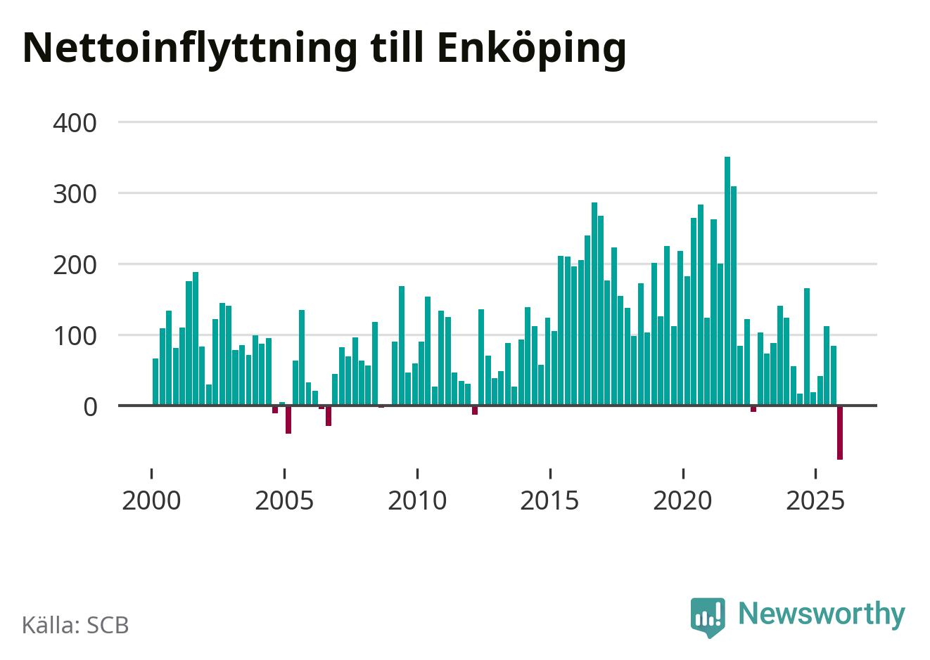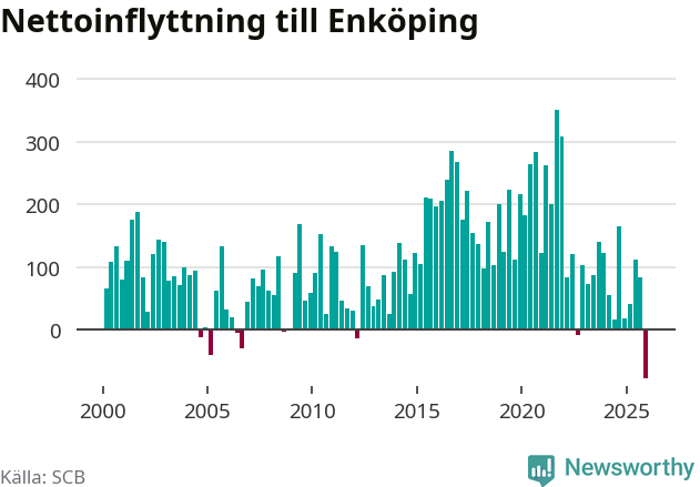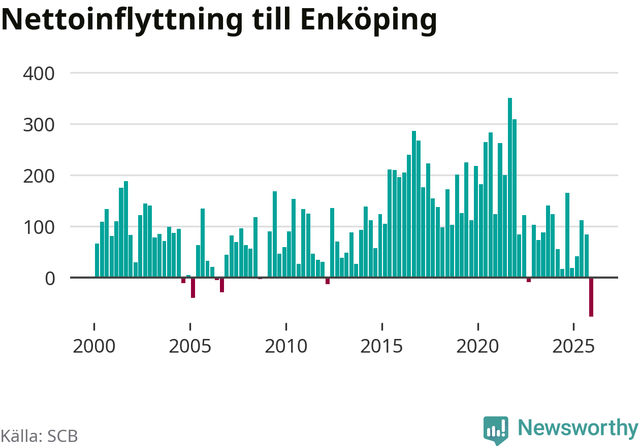 Under fjärde kvartalet 2025 flyttade 570 personer till kommunen medan 647 personer flyttade därifrån. Det är historiskt sett en stor utflyttning under ett kvartal. Det ger den största nettoutflyttningen under ett kvartal sedan åtminstone år 2000. Sedan seklets början har Enköping haft ett positivt flyttnetto under nästan alla kvartal.