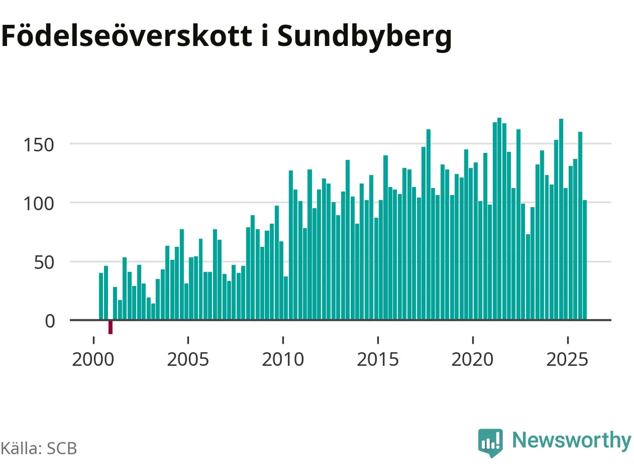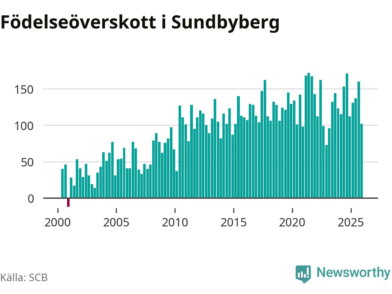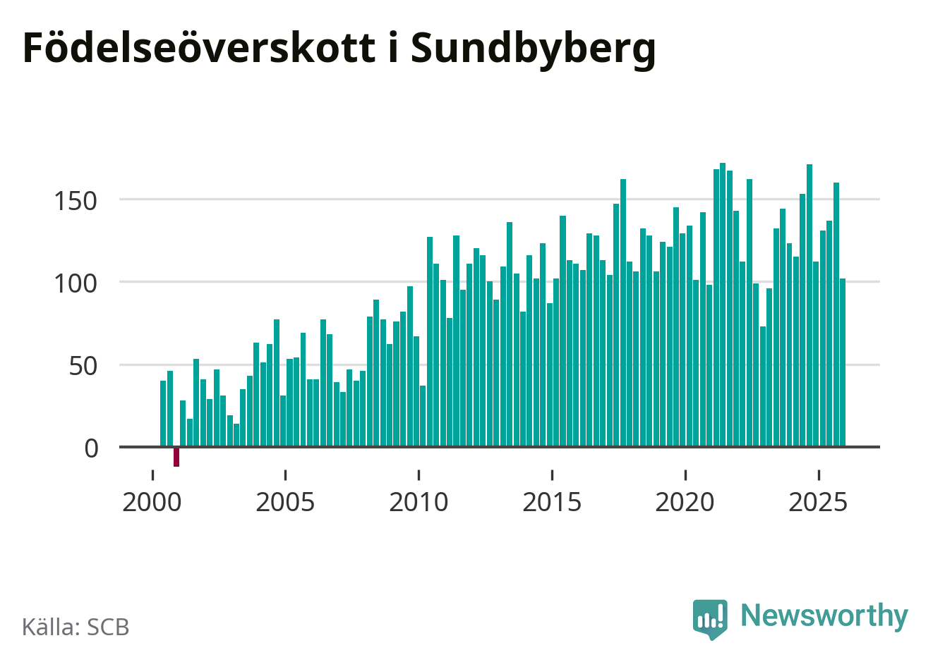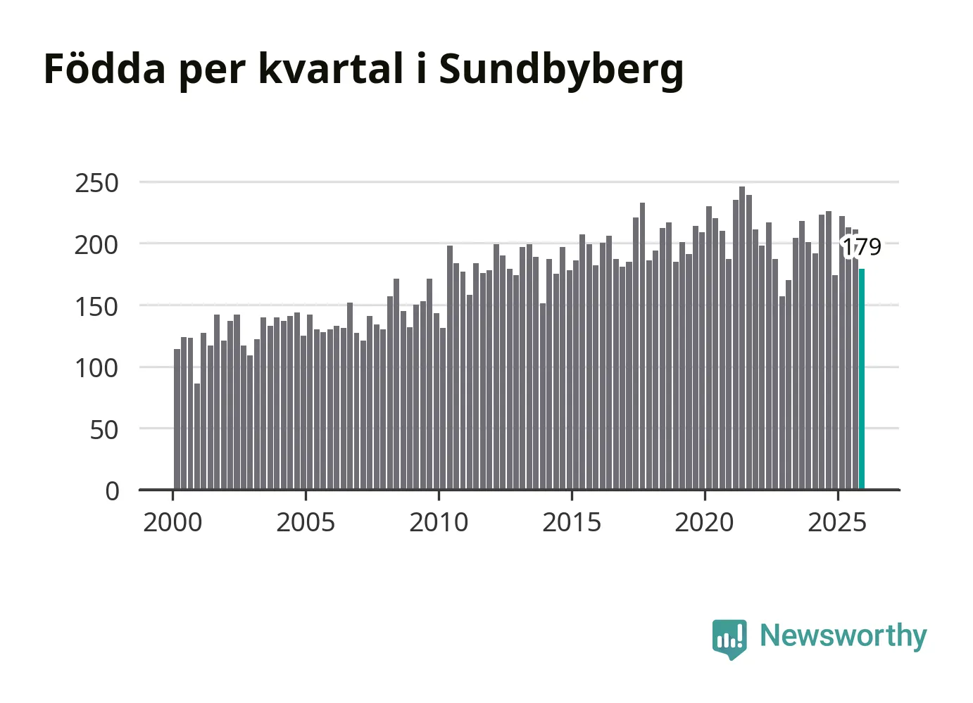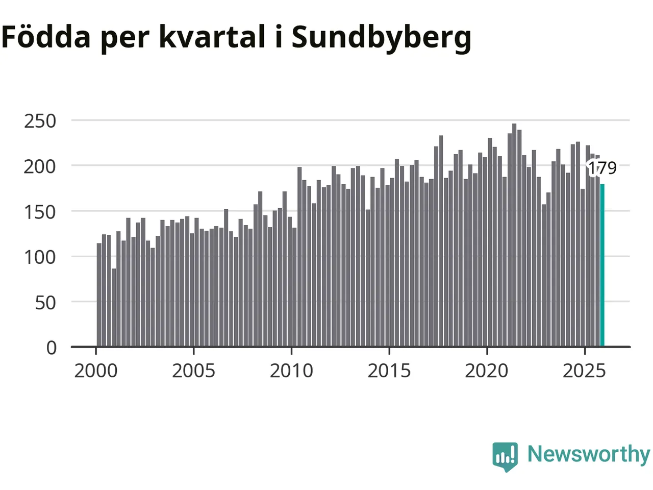 Enligt SCB:s siffror föddes 179 barn i Sundbyberg under det senaste kvartalet. Samtidigt avled 77 personer. Sundbyberg hade alltså ett positivt födelsenetto, vilket kommunen historiskt sett i princip alltid har haft.