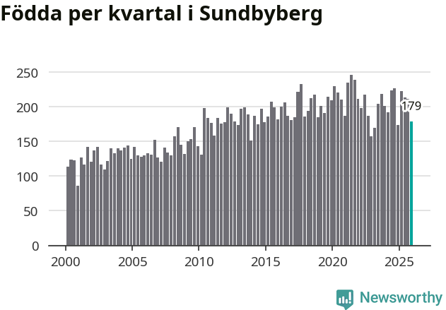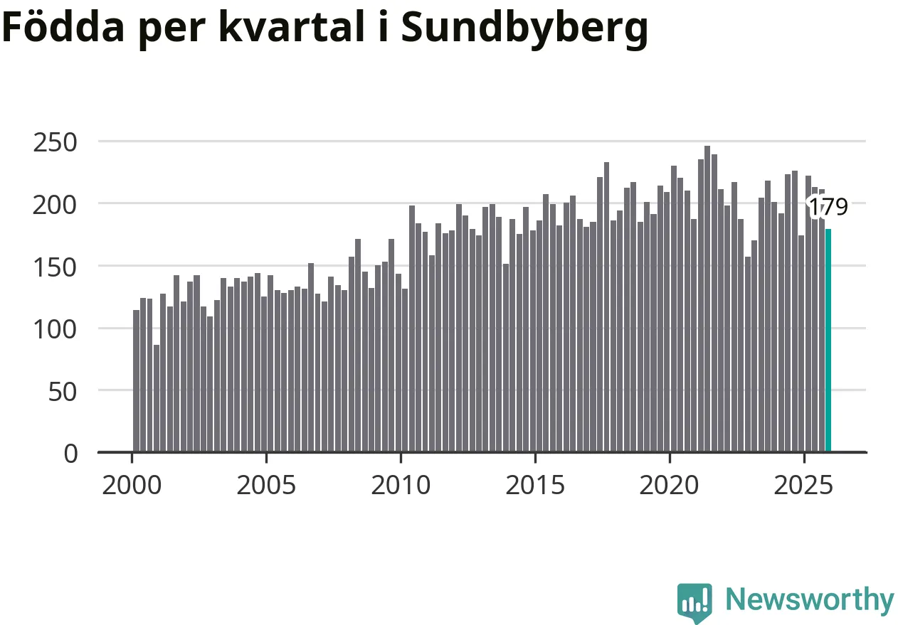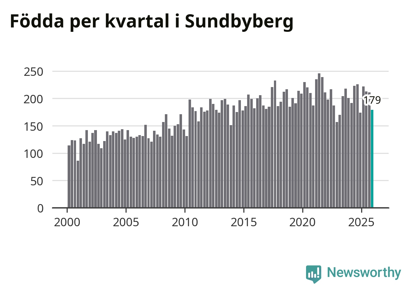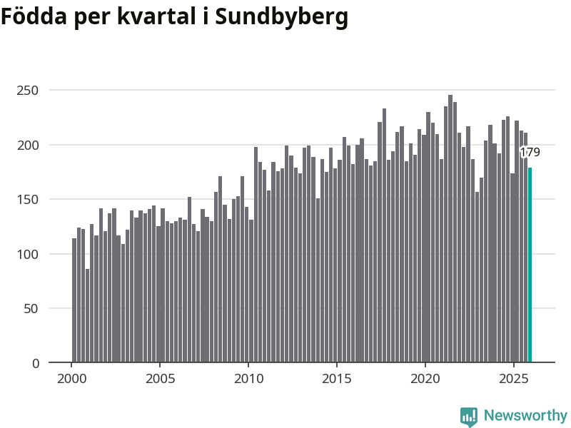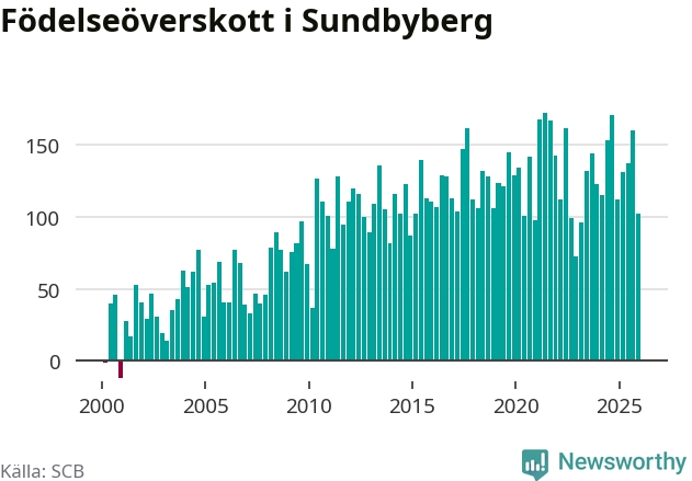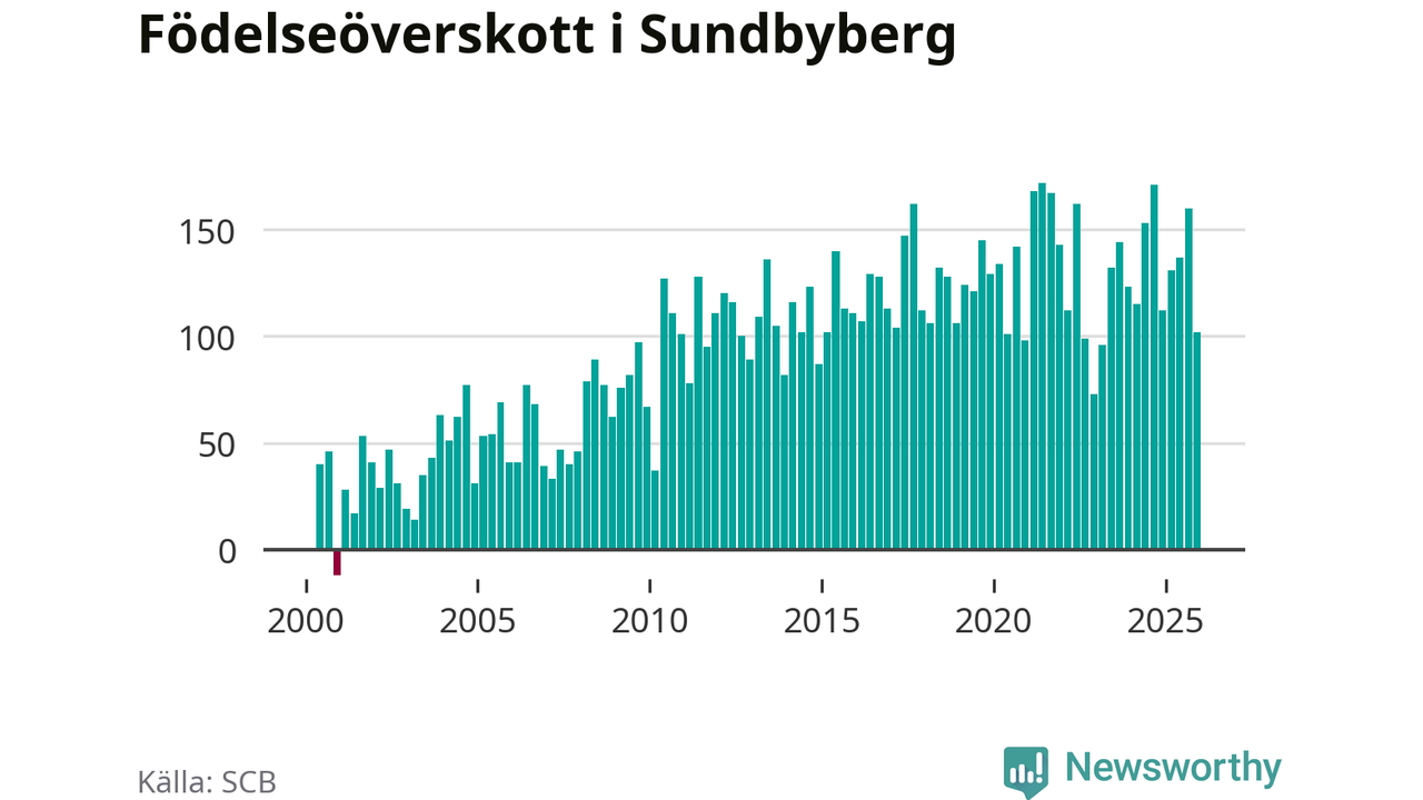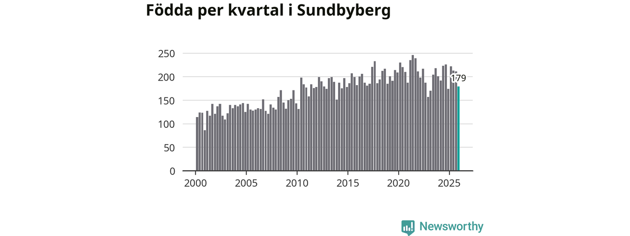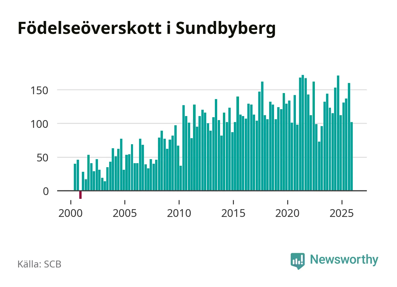 Enligt SCB:s siffror föddes 179 barn i Sundbyberg under det senaste kvartalet. Samtidigt avled 77 personer. Sundbyberg hade alltså ett positivt födelsenetto, vilket kommunen historiskt sett i princip alltid har haft.