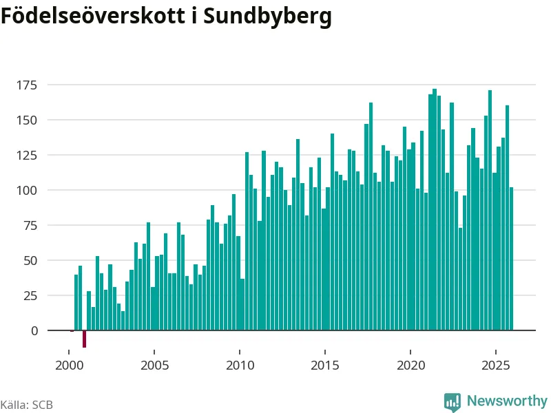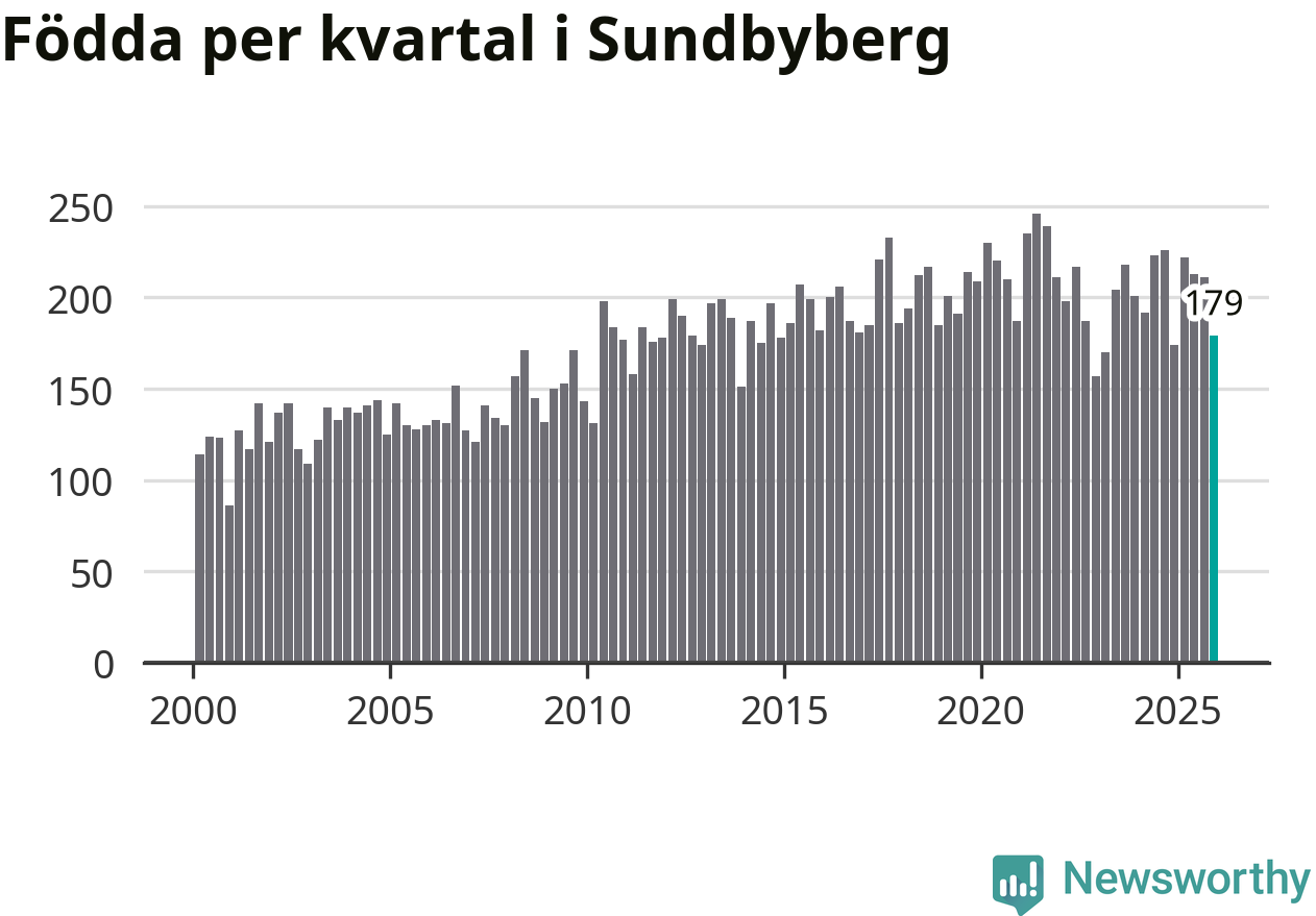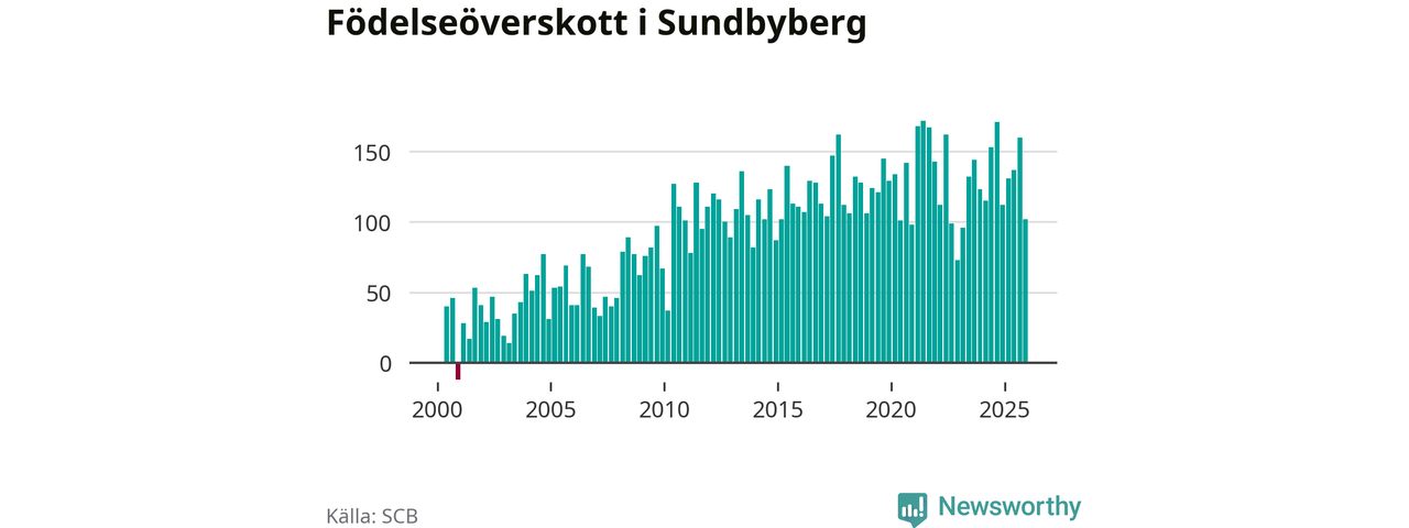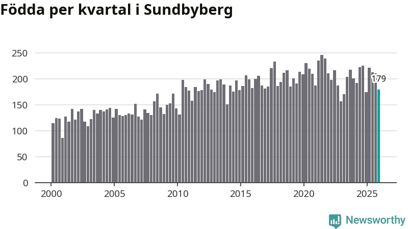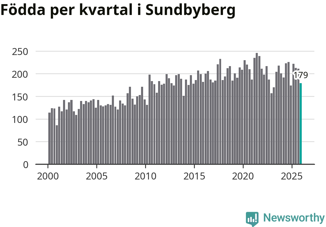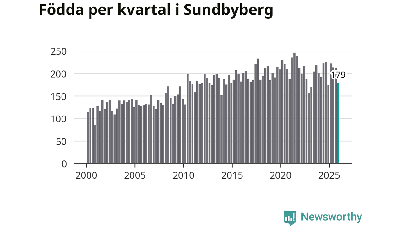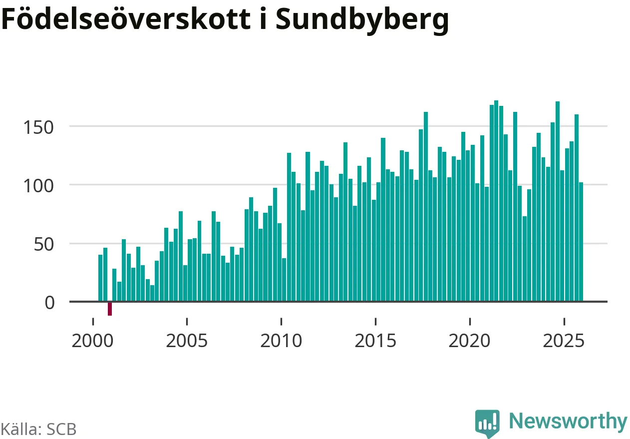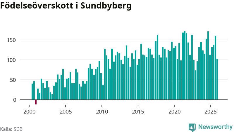 Enligt SCB:s siffror föddes 179 barn i Sundbyberg under det senaste kvartalet. Samtidigt avled 77 personer. Sundbyberg hade alltså ett positivt födelsenetto, vilket kommunen historiskt sett i princip alltid har haft.