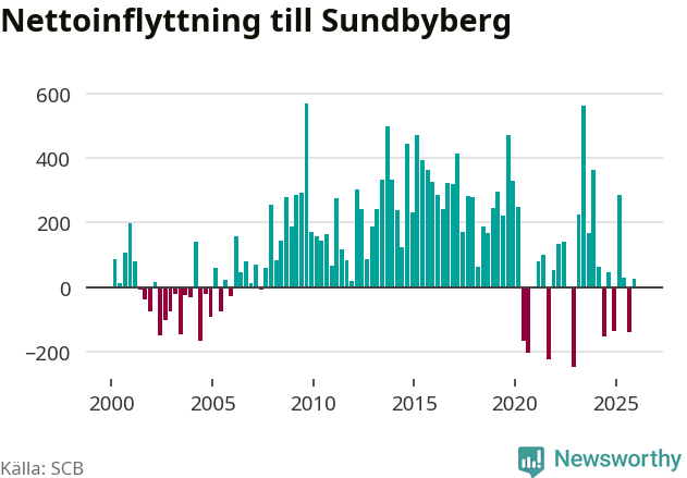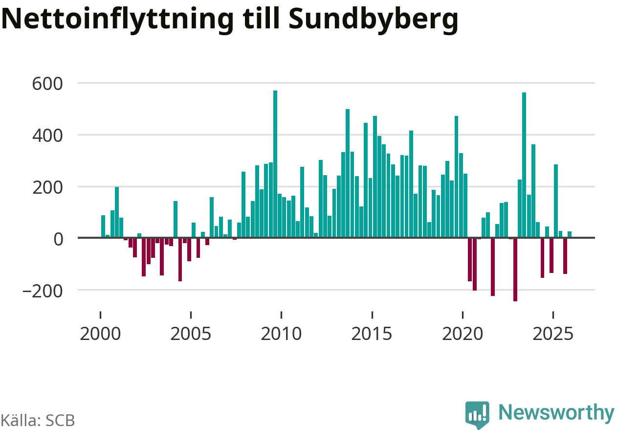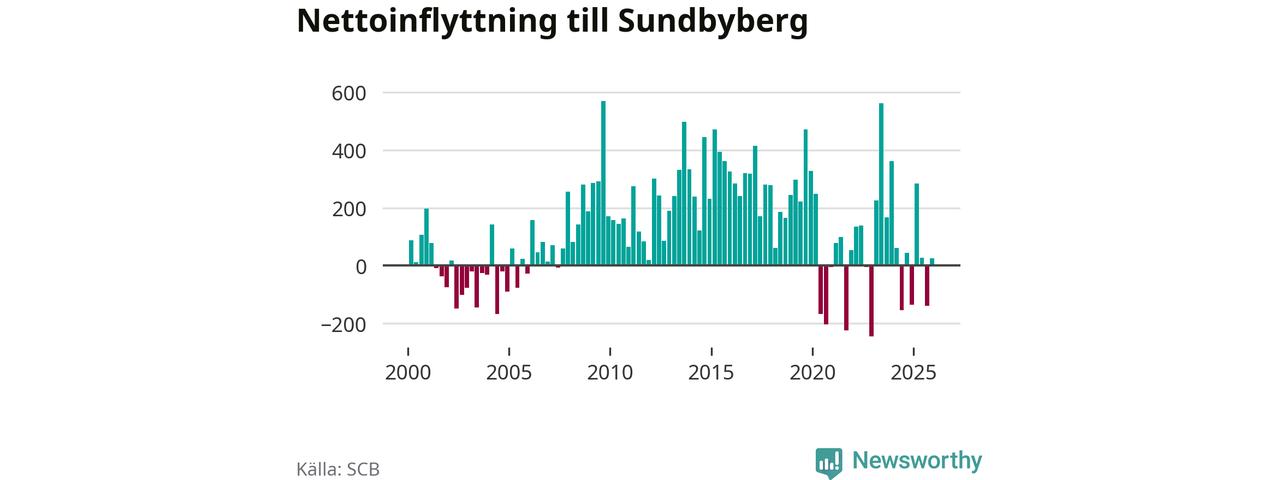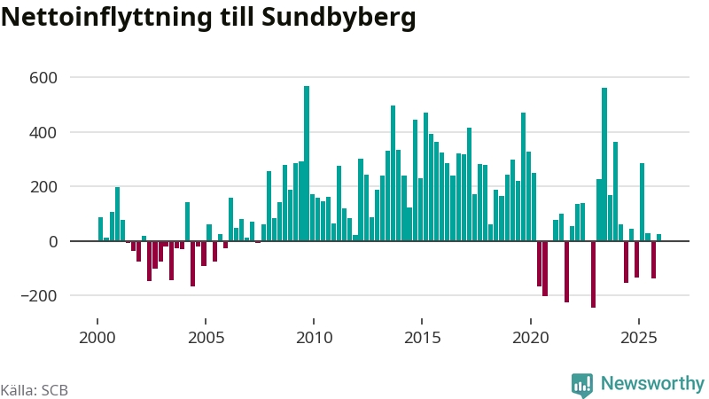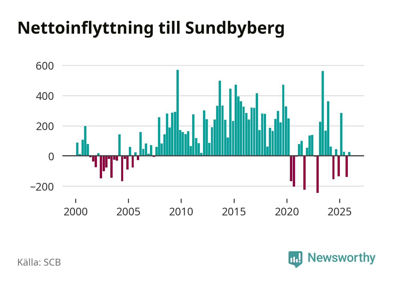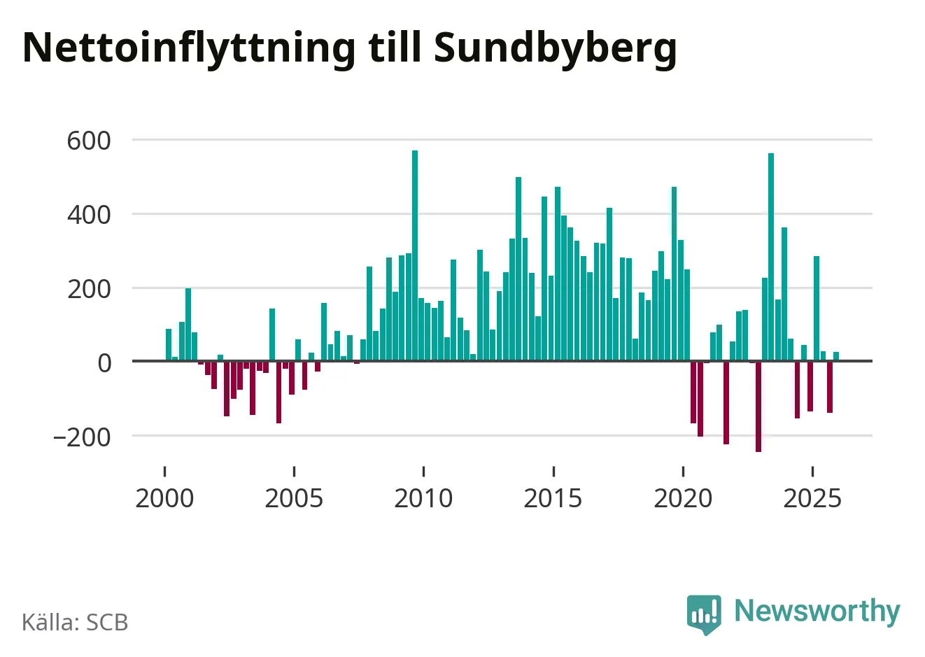 Under fjärde kvartalet 2025 flyttade 1 774 personer till kommunen medan 1 749 personer flyttade därifrån. Sedan seklets början har Sundbyberg oftast haft ett positivt flyttnetto, inklusive det senaste kvartalet.