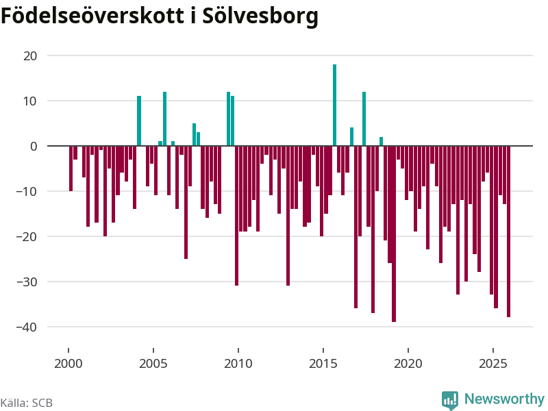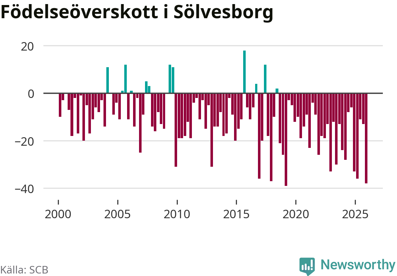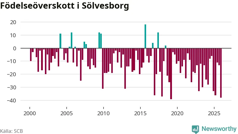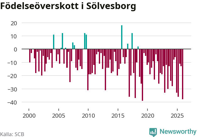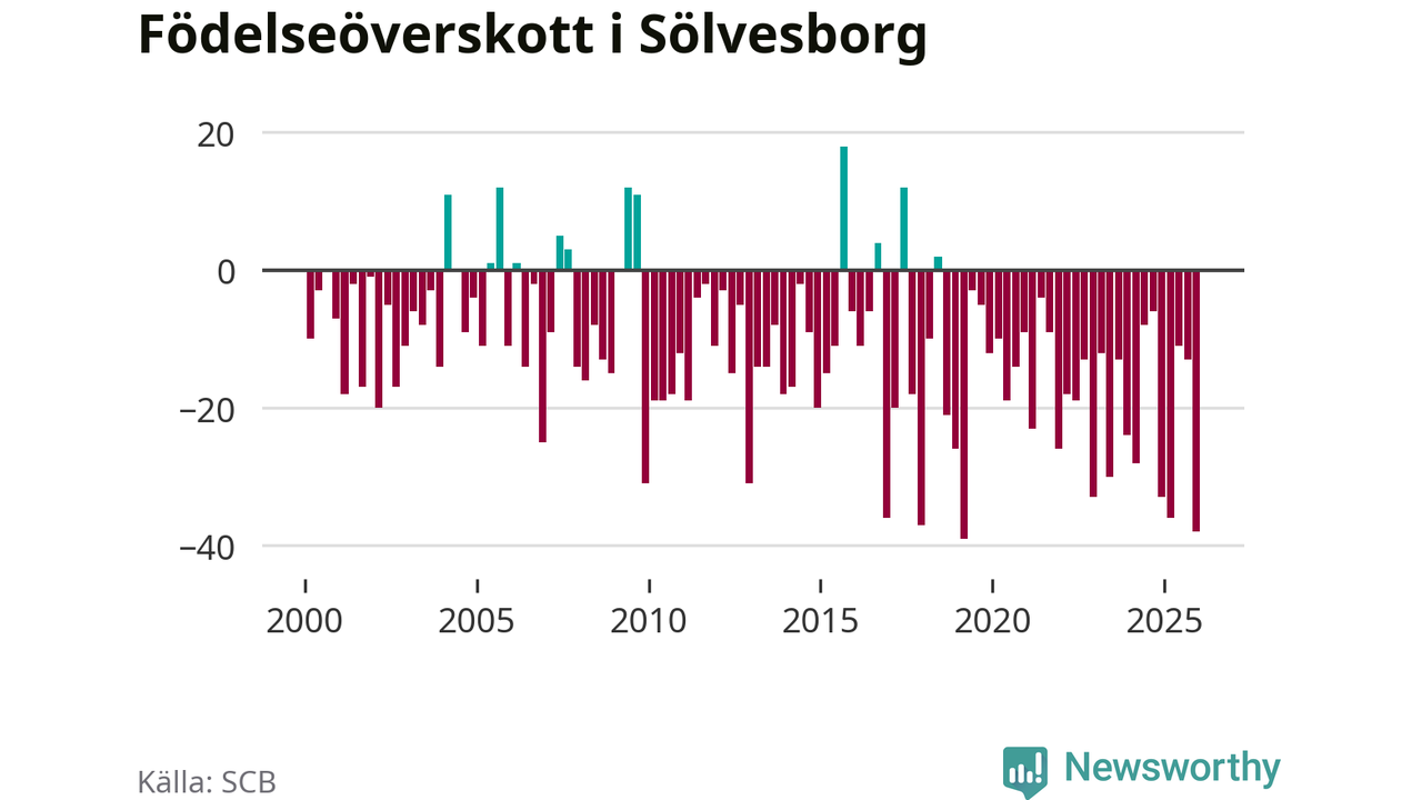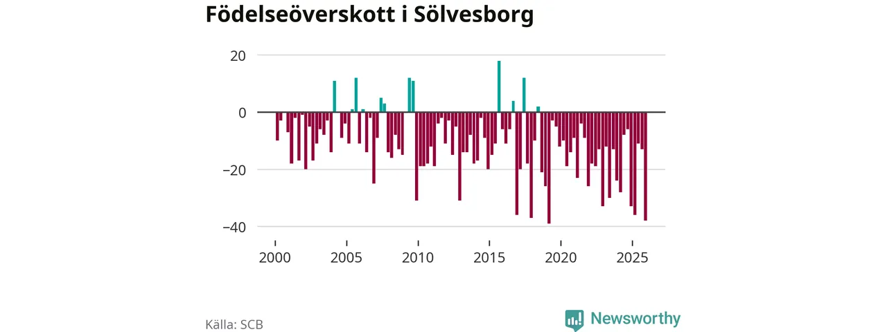 Enligt SCB:s siffror föddes 21 barn i Sölvesborg under det senaste kvartalet. Det är det lägsta födelsetal som registrerats i kommunen under 2000-talet. Det finns en osäkerhet här, eftersom SCB lägger på ett slumpmässigt brus på alla siffror. Klart är i alla fall att det rör sig om historiskt låga nivåer. Samtidigt avled 59 personer. Sölvesborg hade alltså ett negativt födelsenetto, vilket kommunen historiskt sett nästan alltid har haft.