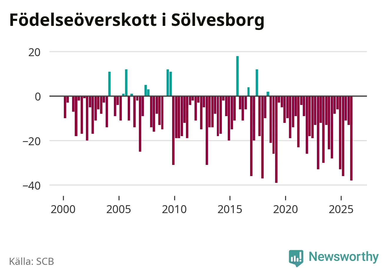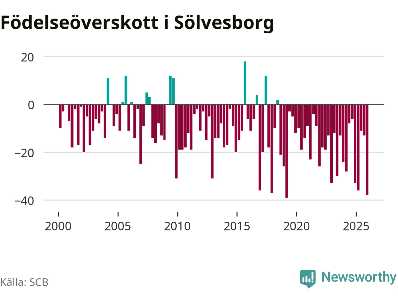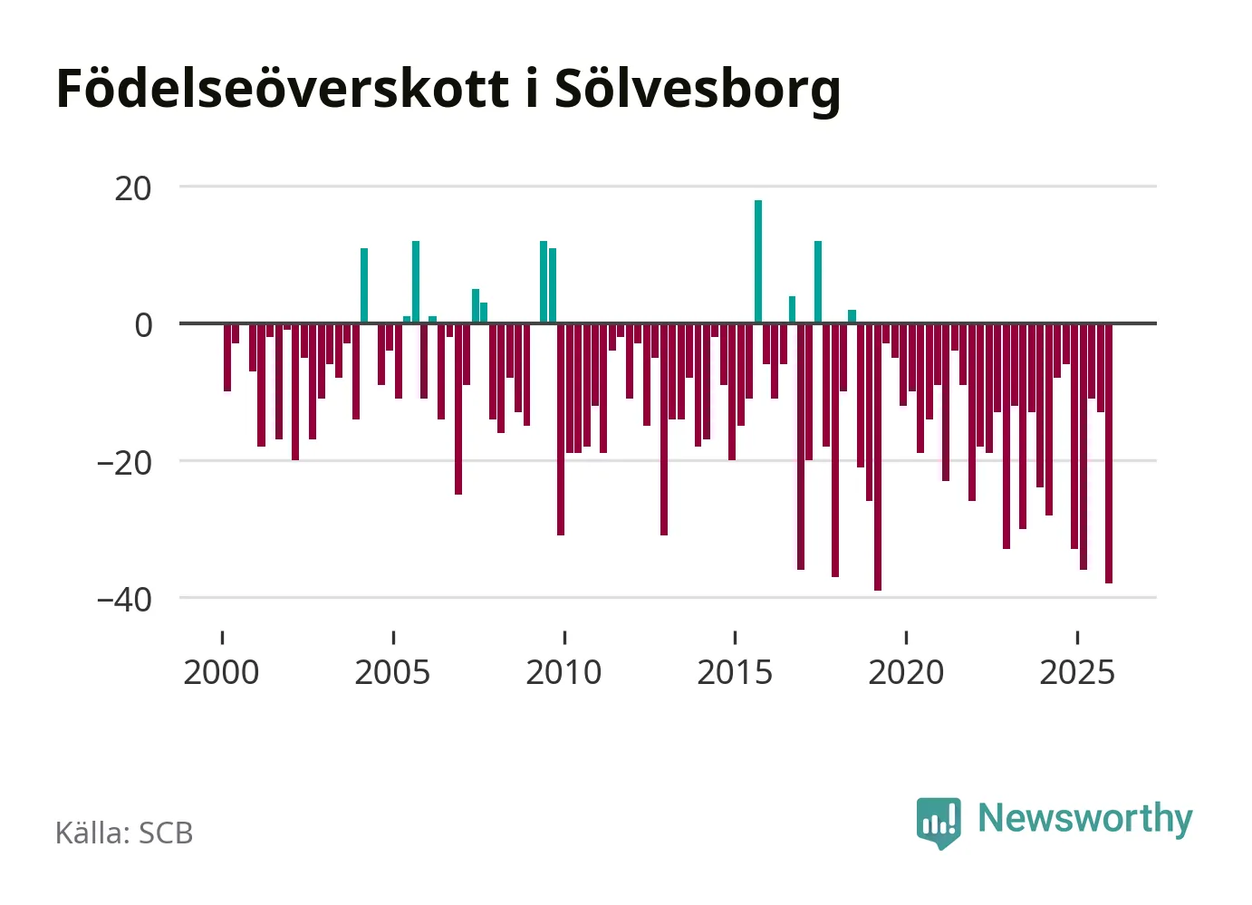 Enligt SCB:s siffror föddes 21 barn i Sölvesborg under det senaste kvartalet. Det är det lägsta födelsetal som registrerats i kommunen under 2000-talet. Det finns en osäkerhet här, eftersom SCB lägger på ett slumpmässigt brus på alla siffror. Klart är i alla fall att det rör sig om historiskt låga nivåer. Samtidigt avled 59 personer. Sölvesborg hade alltså ett negativt födelsenetto, vilket kommunen historiskt sett nästan alltid har haft.