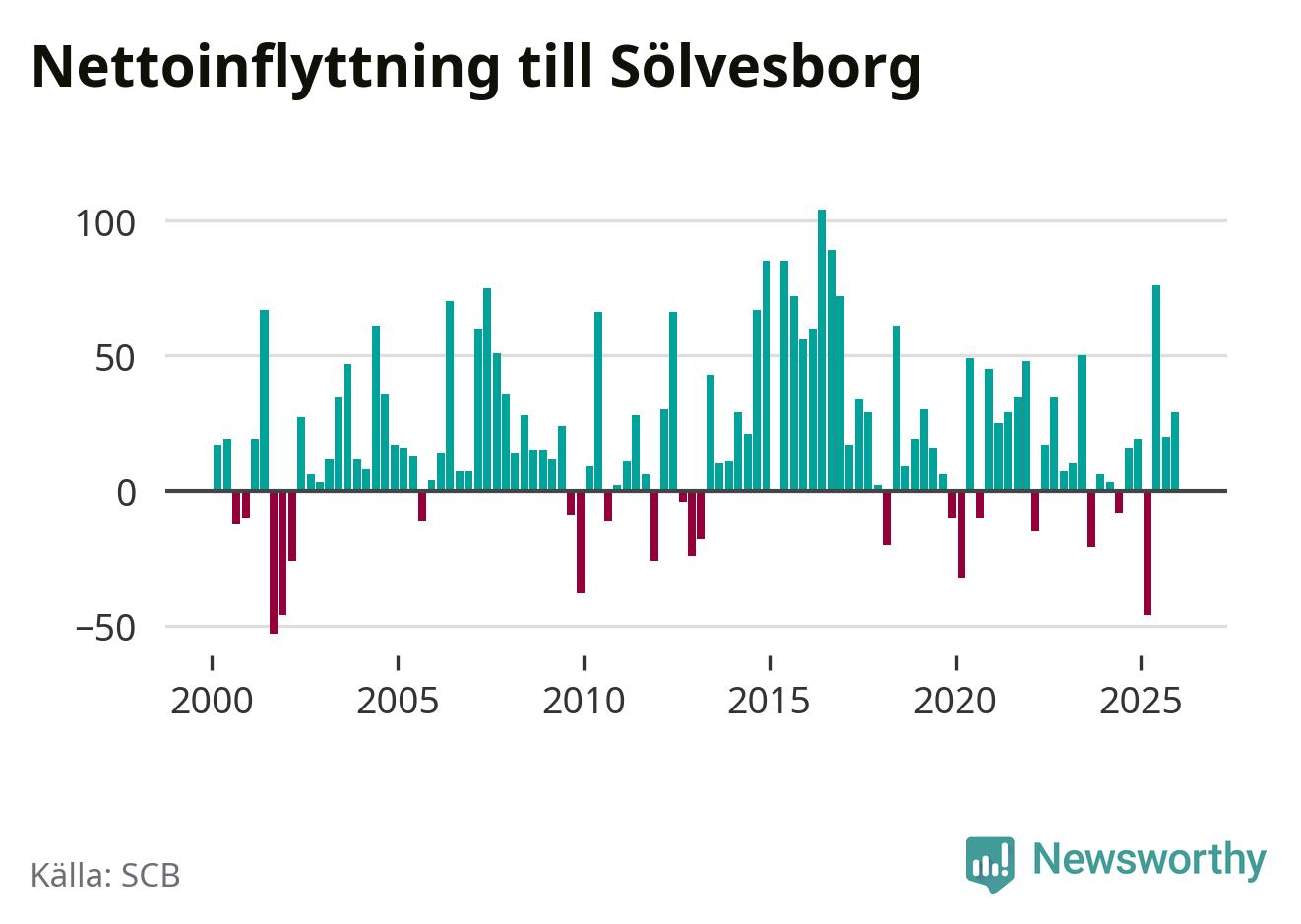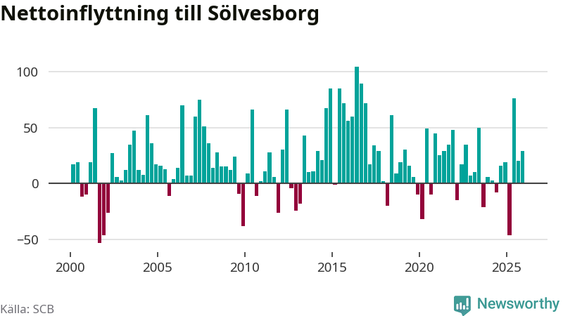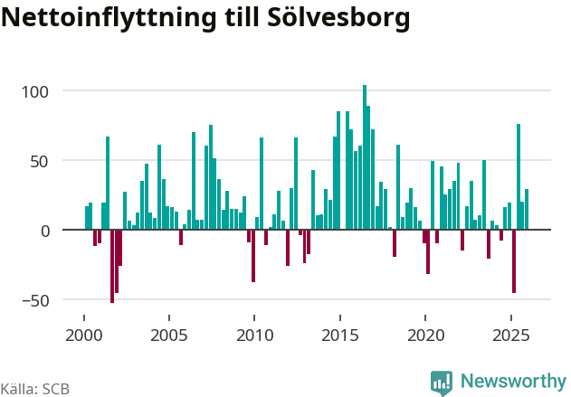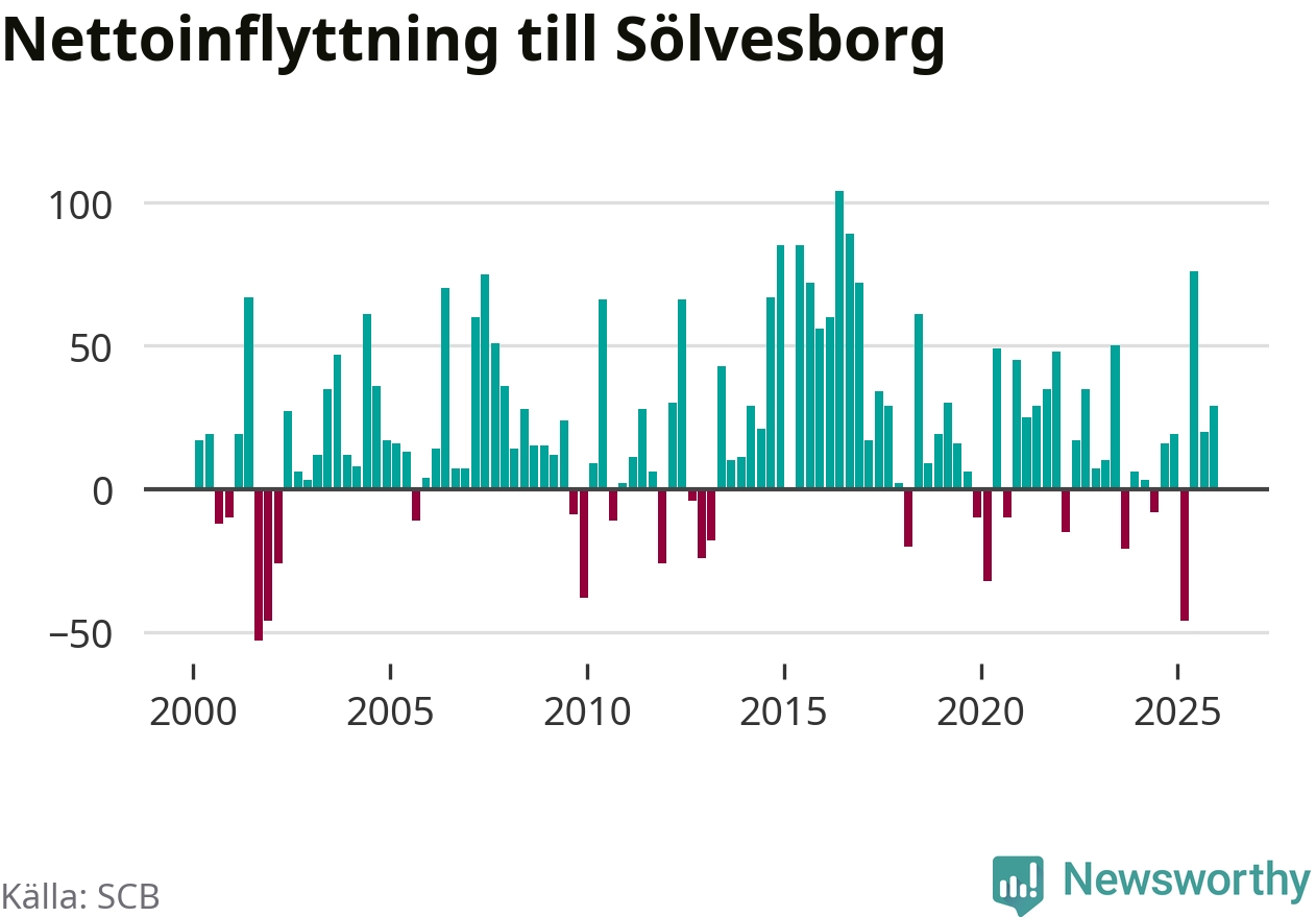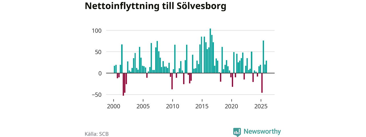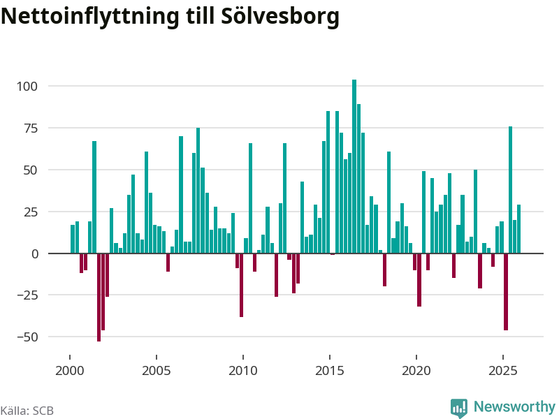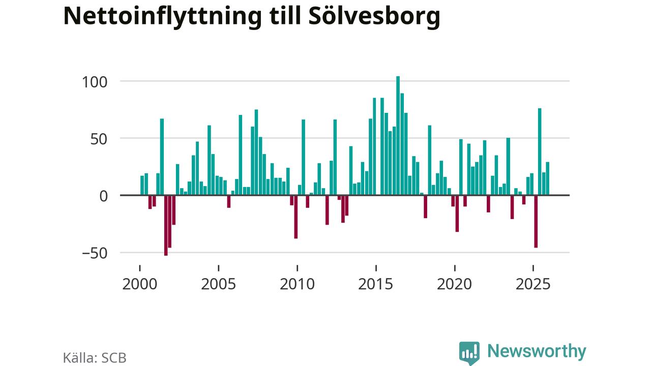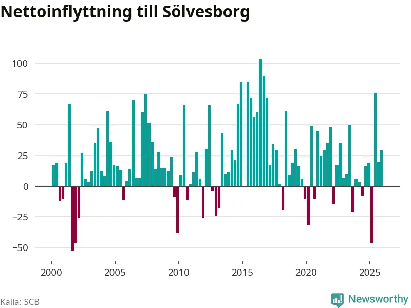 Under fjärde kvartalet 2025 flyttade 215 personer till kommunen medan 186 personer flyttade därifrån. Sedan seklets början har Sölvesborg haft ett positivt flyttnetto under nästan alla kvartal, inklusive det senaste kvartalet.