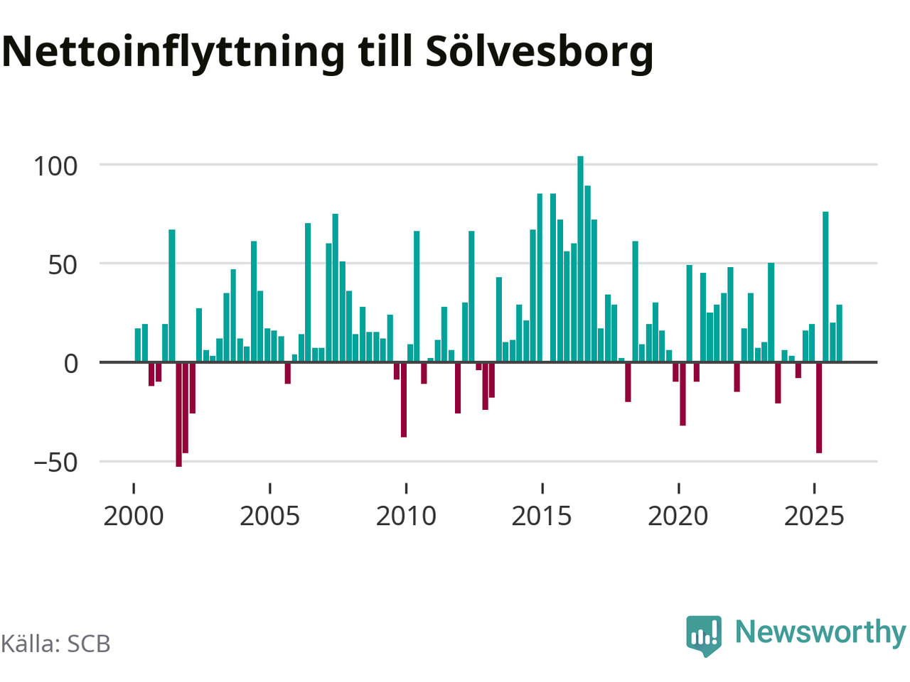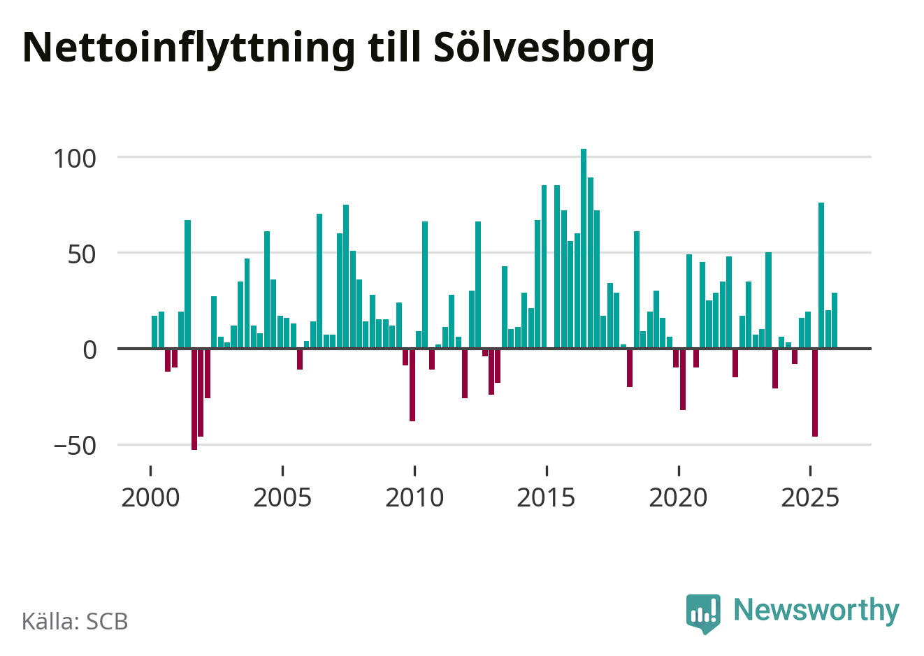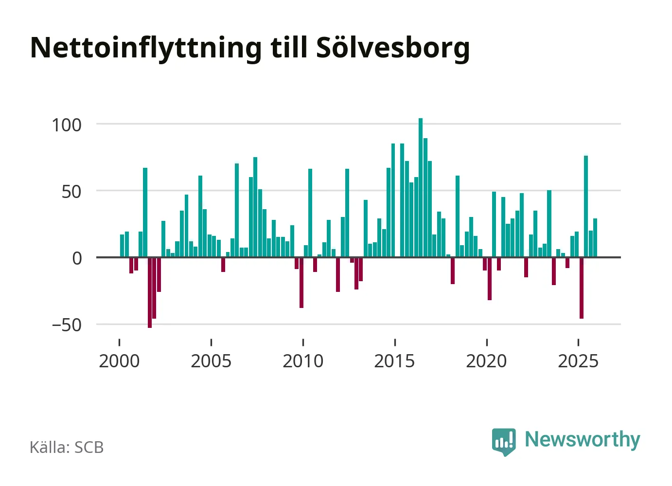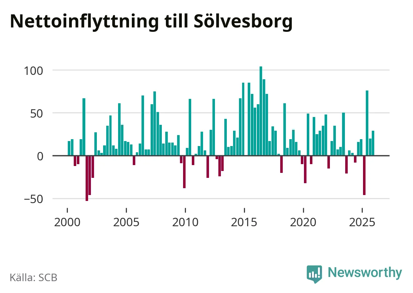 Under fjärde kvartalet 2025 flyttade 215 personer till kommunen medan 186 personer flyttade därifrån. Sedan seklets början har Sölvesborg haft ett positivt flyttnetto under nästan alla kvartal, inklusive det senaste kvartalet.
