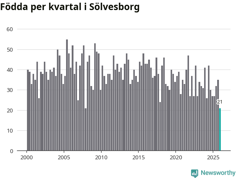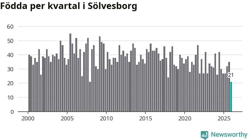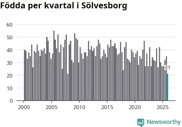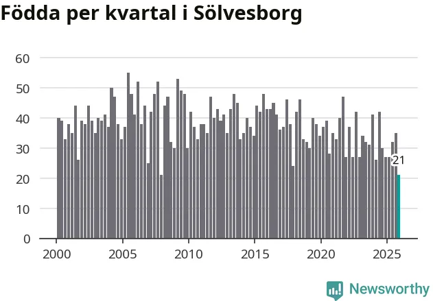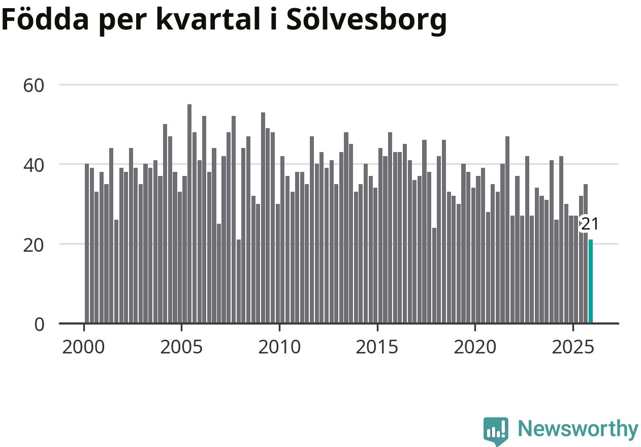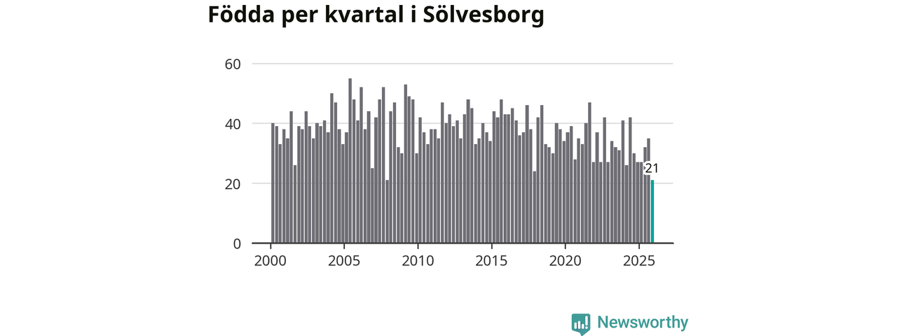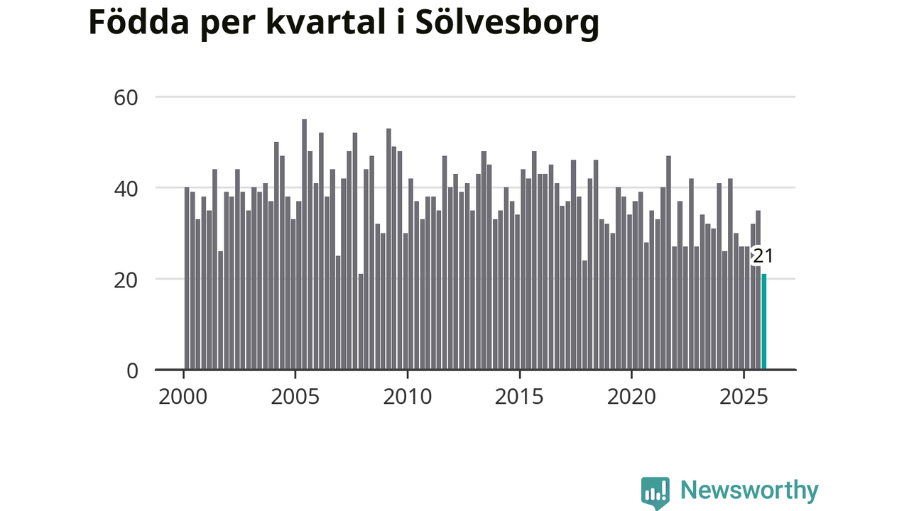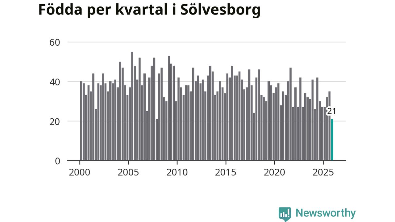 21 barn föddes i Sölvesborgs kommun under fjärde kvartalet 2025. Det är en av de lägsta sifforna hittills det här seklet. Det visar SCB:s senaste befolkningsstatistik.