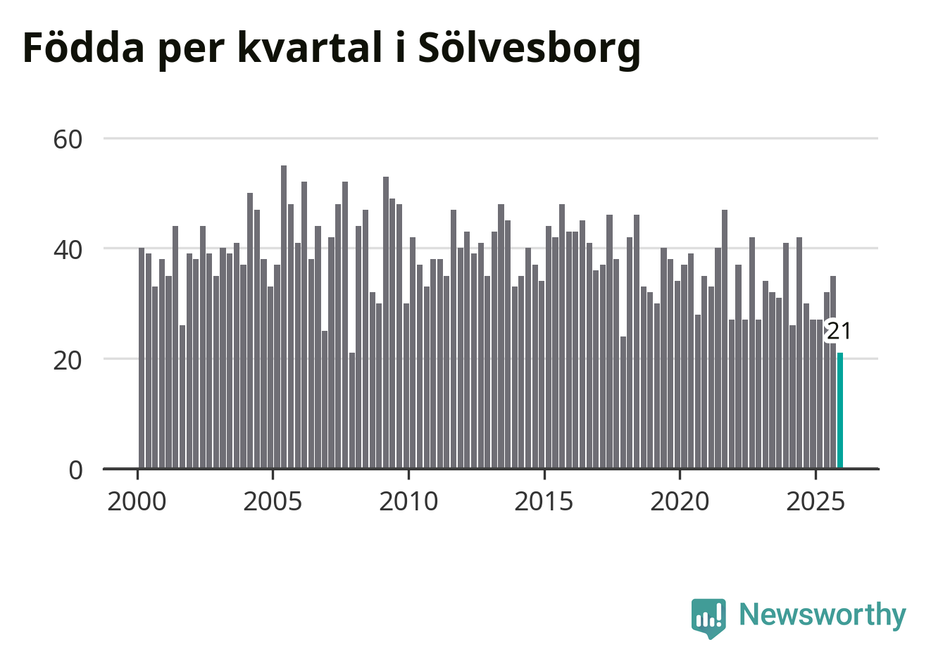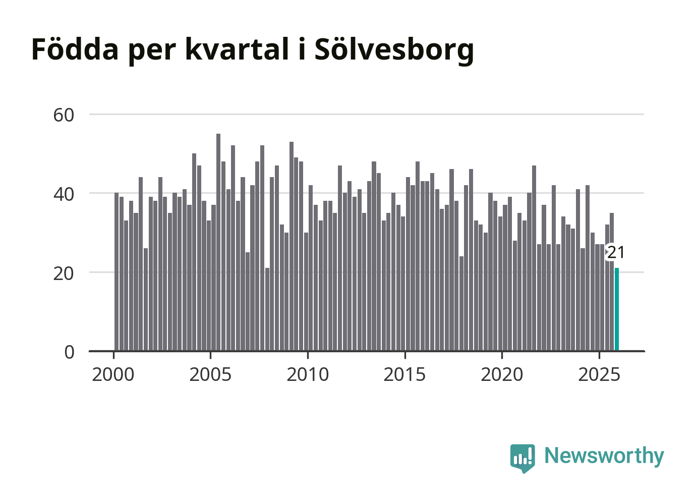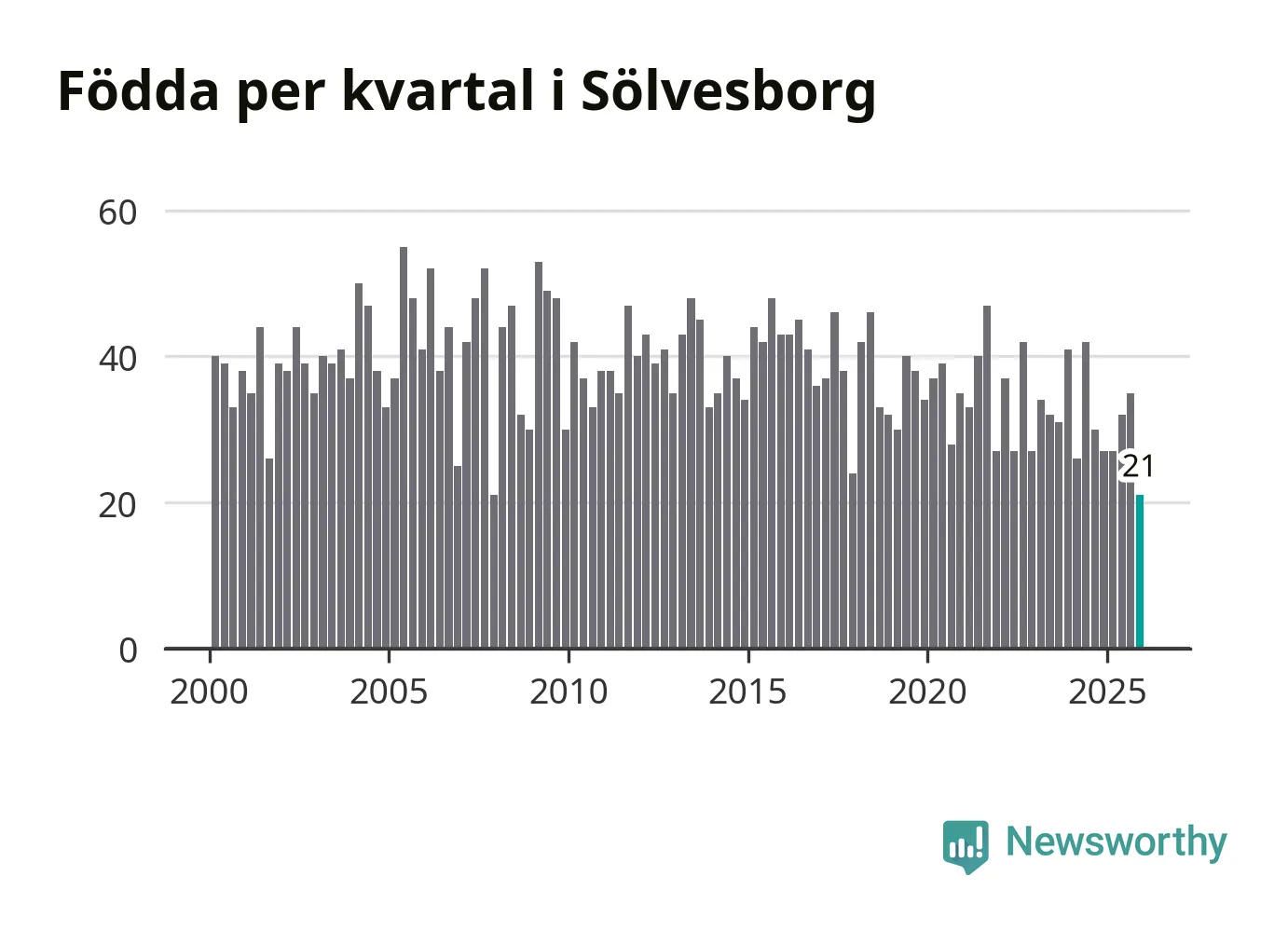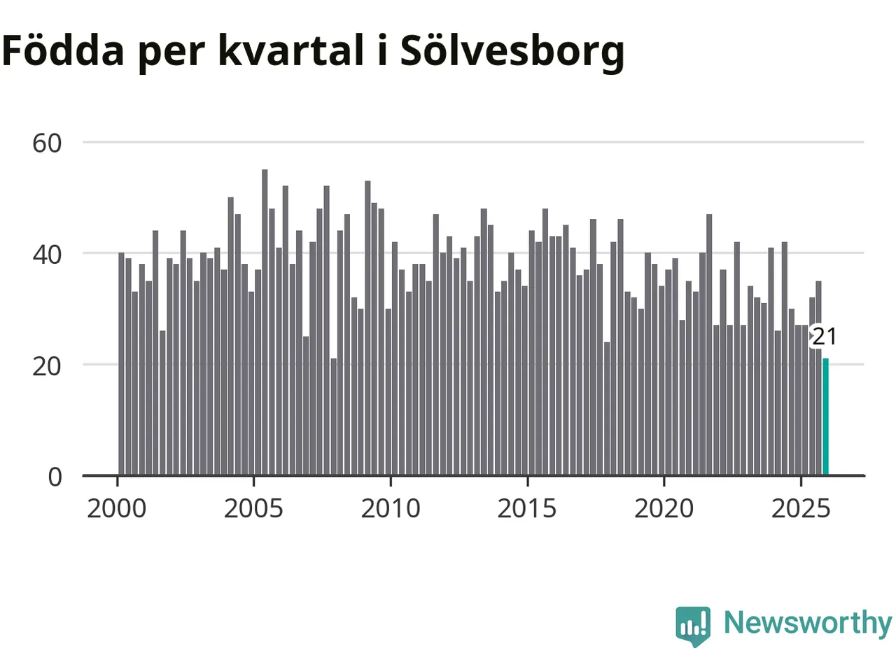 21 barn föddes i Sölvesborgs kommun under fjärde kvartalet 2025. Det är en av de lägsta sifforna hittills det här seklet. Det visar SCB:s senaste befolkningsstatistik.