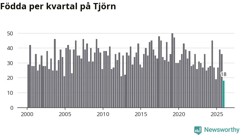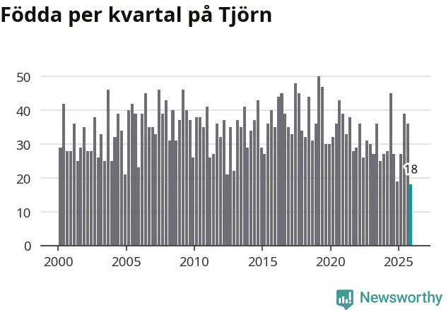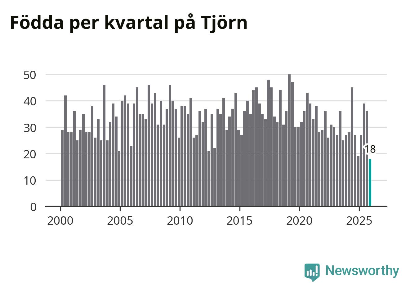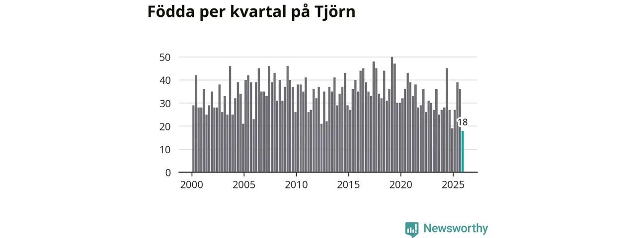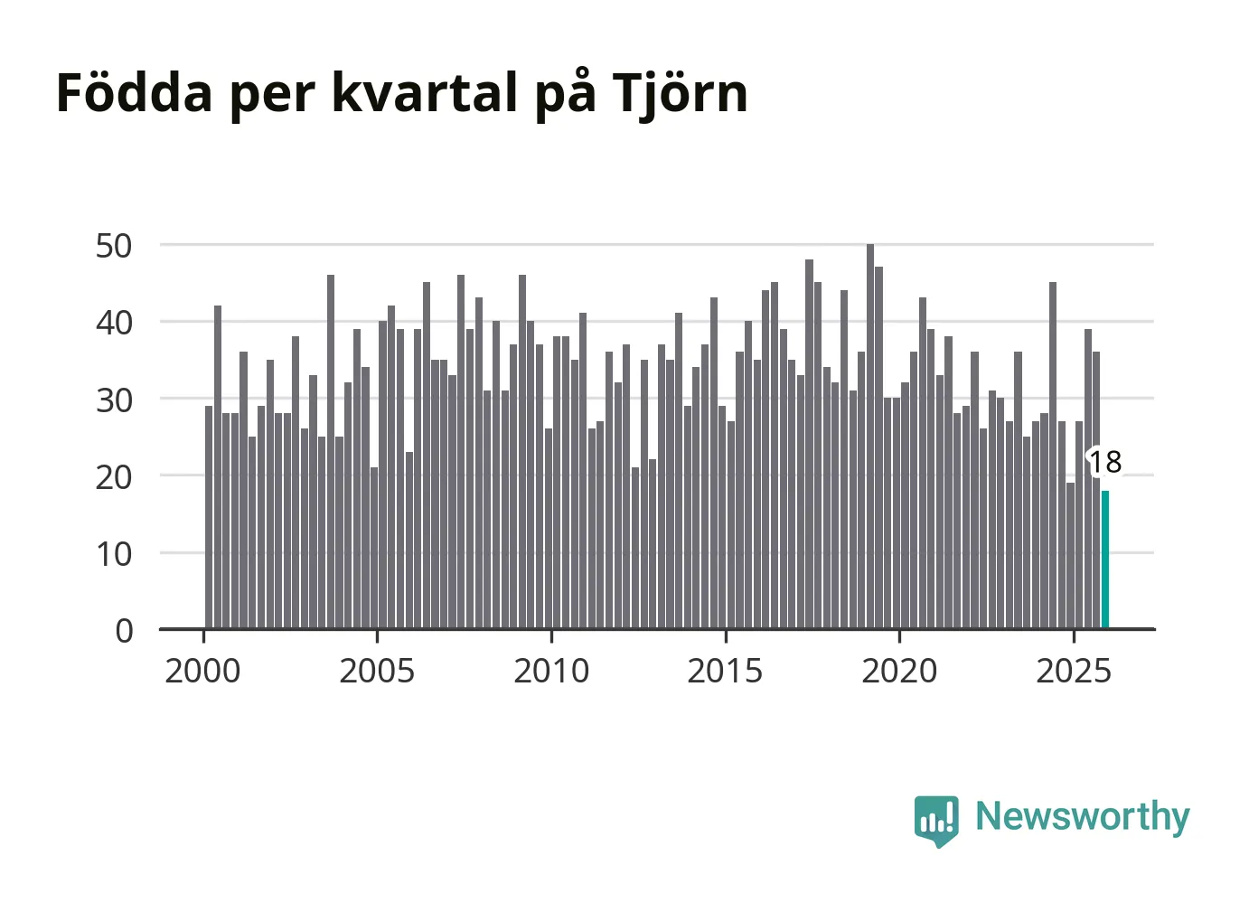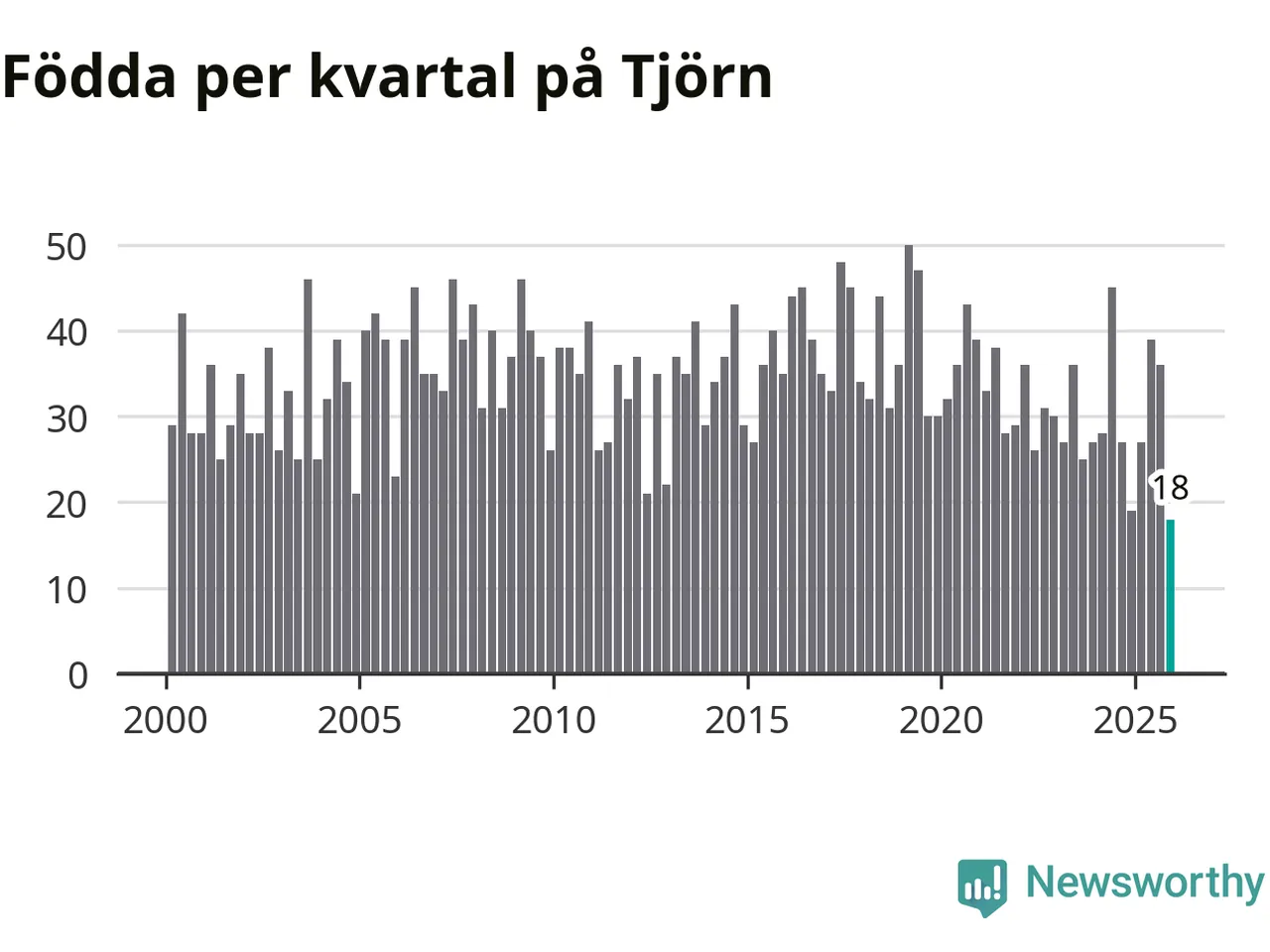 Enligt SCB:s siffror föddes 18 barn på Tjörn under det senaste kvartalet. Det är det lägsta födelsetal som registrerats i kommunen under 2000-talet. Det finns en osäkerhet här, eftersom SCB lägger på ett slumpmässigt brus på alla siffror. Klart är i alla fall att det rör sig om historiskt låga nivåer. Samtidigt avled 42 personer. Tjörn hade alltså ett negativt födelsenetto, vilket kommunen historiskt sett oftast har haft.