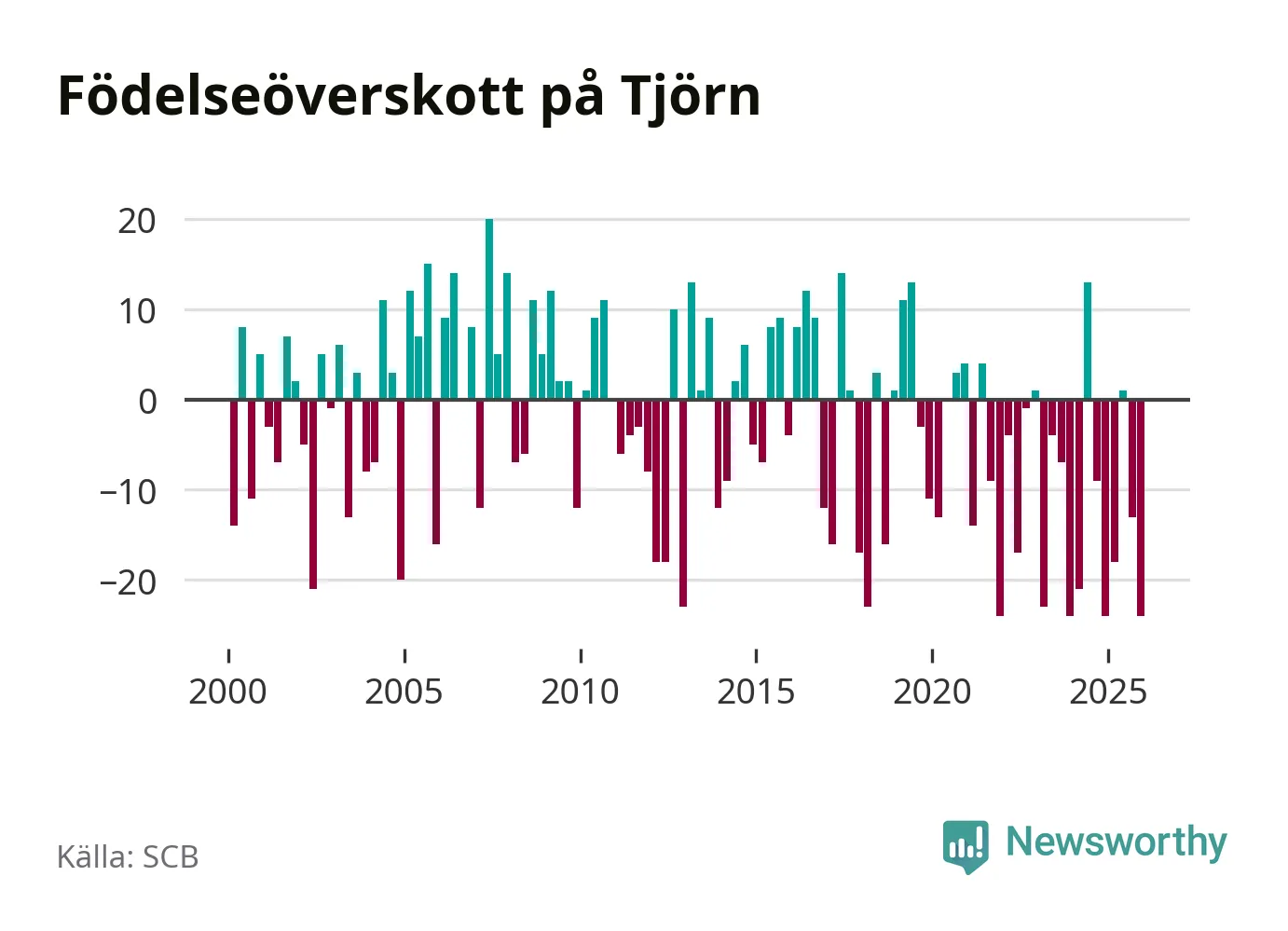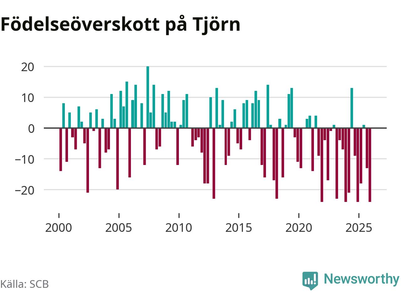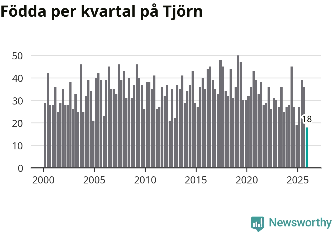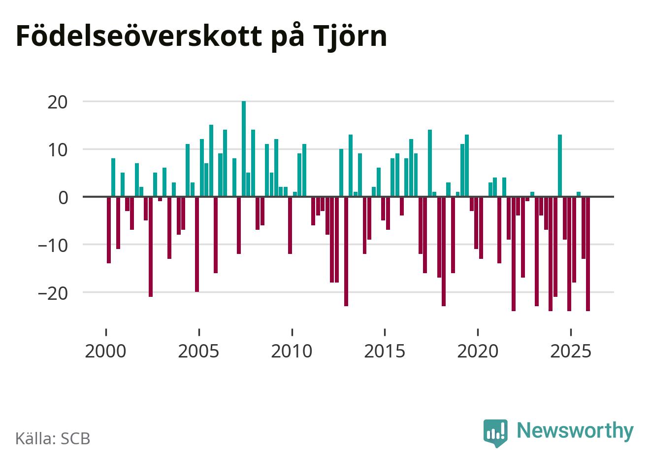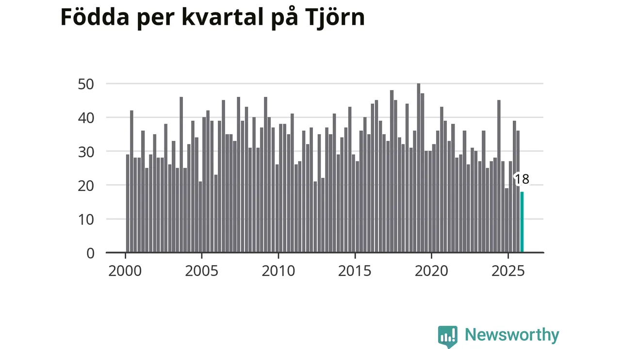 Enligt SCB:s siffror föddes 18 barn på Tjörn under det senaste kvartalet. Det är det lägsta födelsetal som registrerats i kommunen under 2000-talet. Det finns en osäkerhet här, eftersom SCB lägger på ett slumpmässigt brus på alla siffror. Klart är i alla fall att det rör sig om historiskt låga nivåer. Samtidigt avled 42 personer. Tjörn hade alltså ett negativt födelsenetto, vilket kommunen historiskt sett oftast har haft.