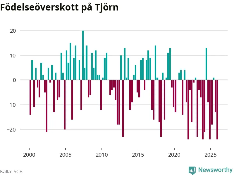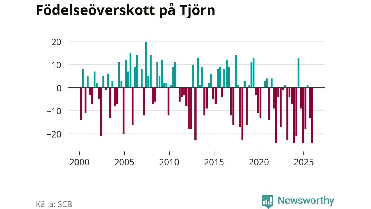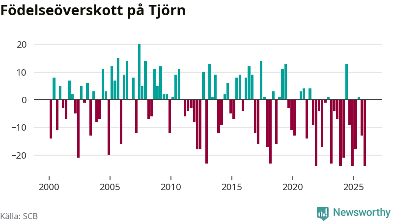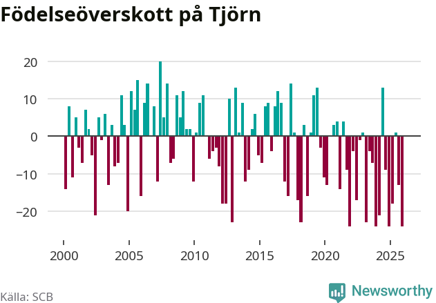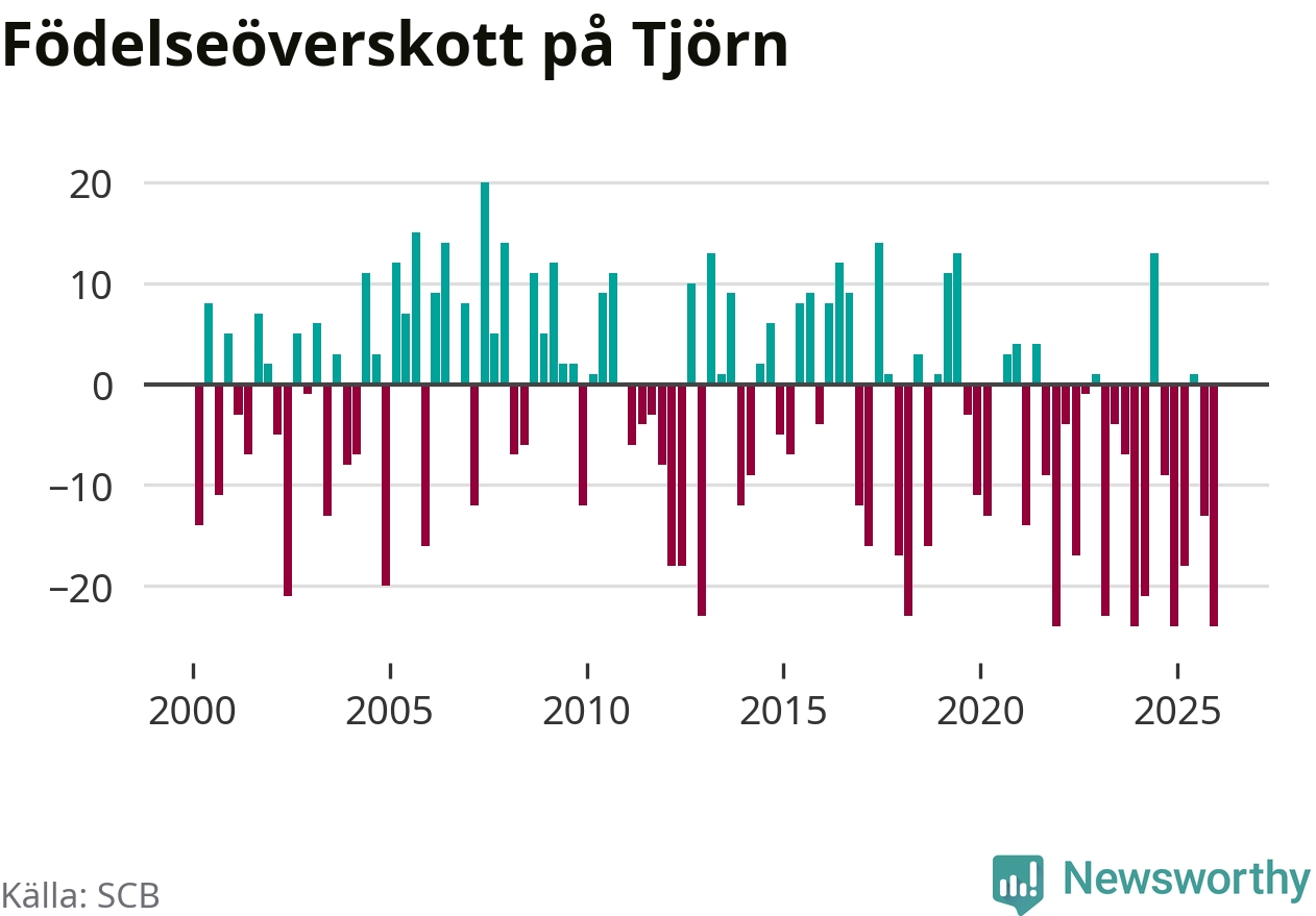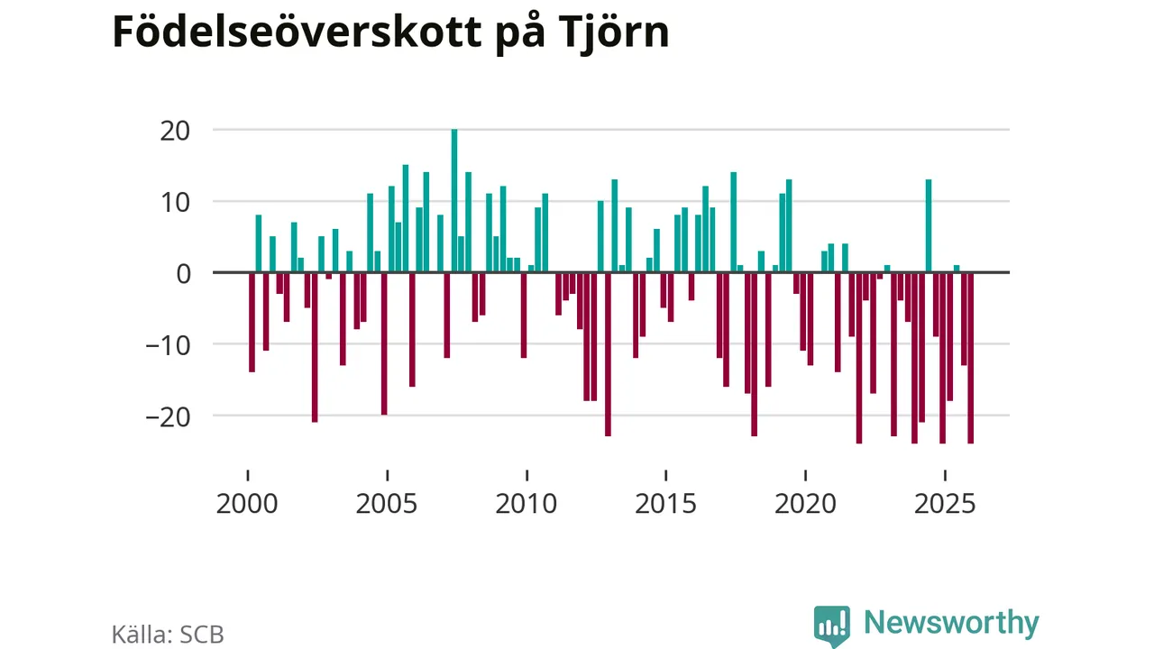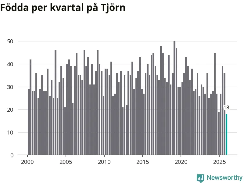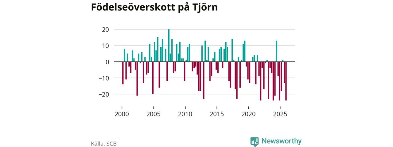Enligt SCB:s siffror föddes 18 barn på Tjörn under det senaste kvartalet. Det är det lägsta födelsetal som registrerats i kommunen under 2000-talet. Det finns en osäkerhet här, eftersom SCB lägger på ett slumpmässigt brus på alla siffror. Klart är i alla fall att det rör sig om historiskt låga nivåer. Samtidigt avled 42 personer. Tjörn hade alltså ett negativt födelsenetto, vilket kommunen historiskt sett oftast har haft.