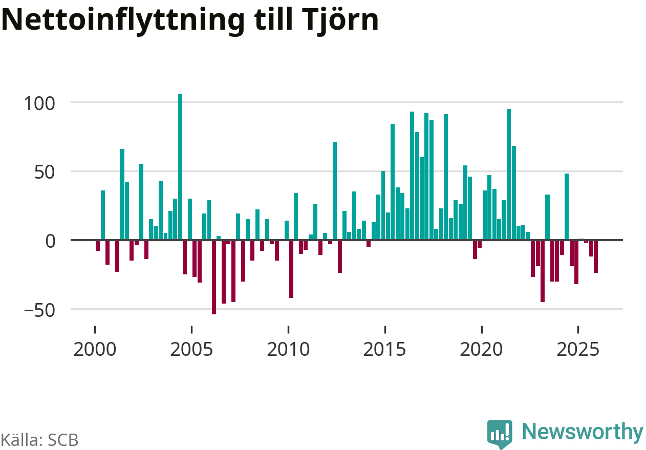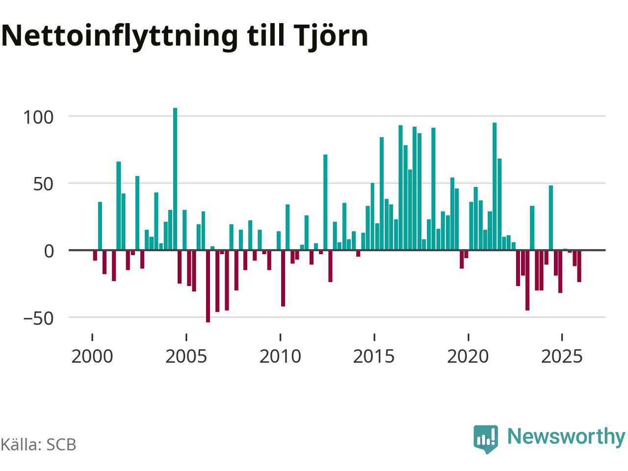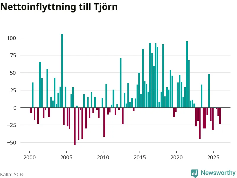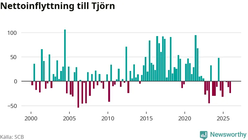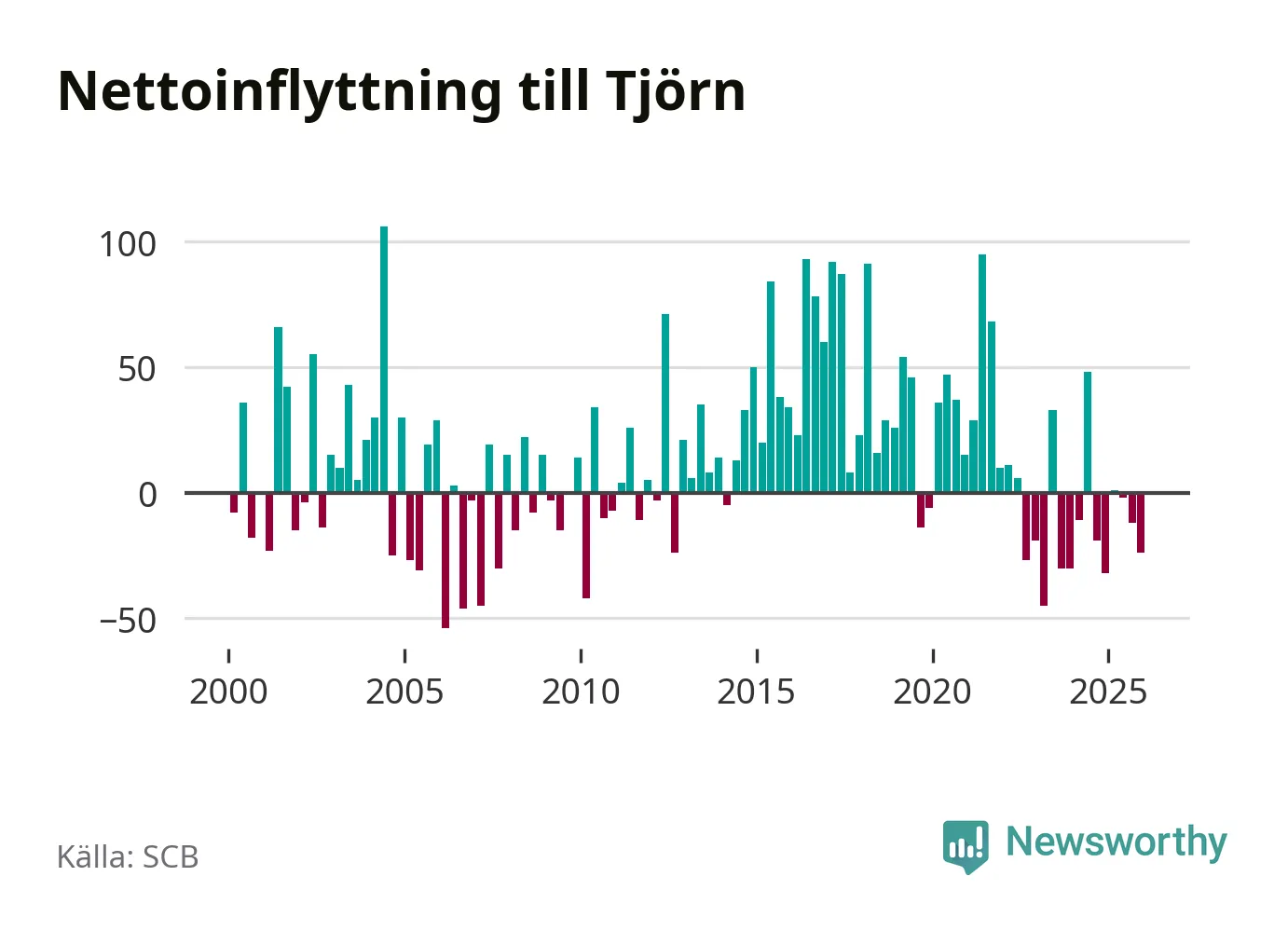 Under fjärde kvartalet 2025 flyttade 162 personer till kommunen medan 186 personer flyttade därifrån. Sedan seklets början har Tjörn oftast haft ett positivt flyttnetto.