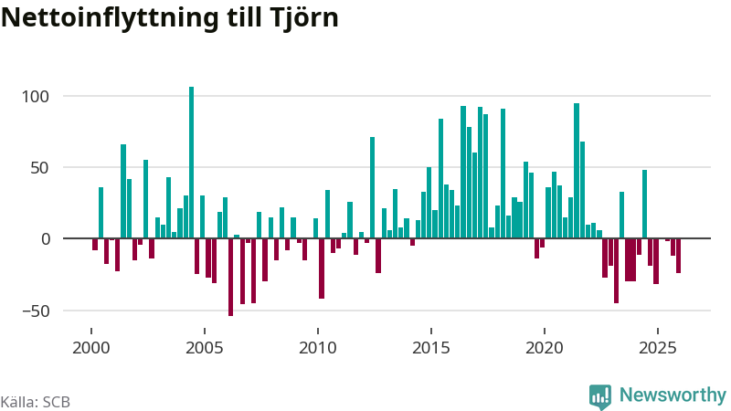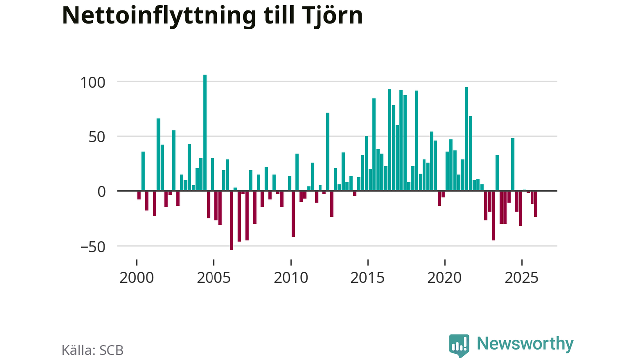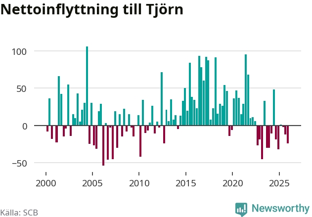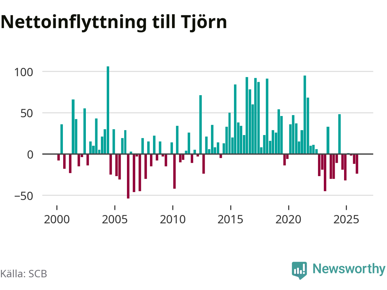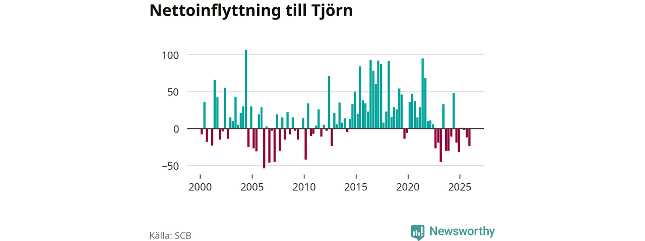 Under fjärde kvartalet 2025 flyttade 162 personer till kommunen medan 186 personer flyttade därifrån. Sedan seklets början har Tjörn oftast haft ett positivt flyttnetto.