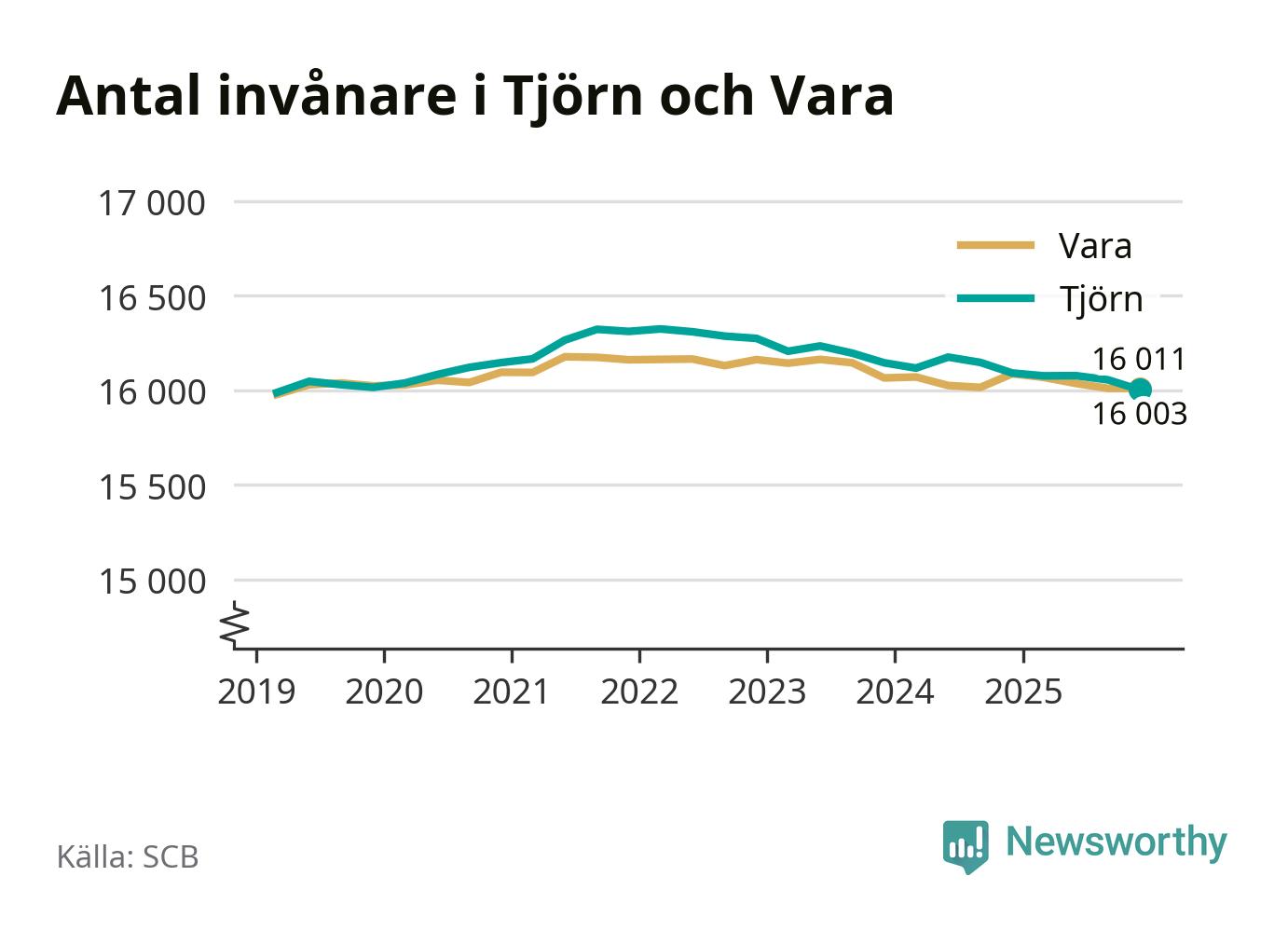Tjörn är nu i princip lika stort som Vara kommun, skillnaden är så liten att den kan bero på den slumpmässiga justering som SCB gör av befolkningssiffrorna. Tjörns kommun har varit den större kommunen sedan 2025.
