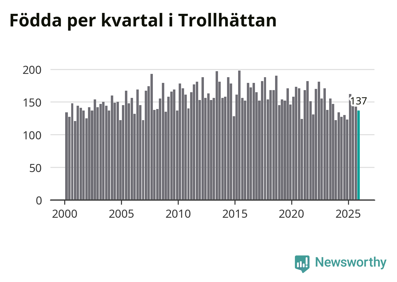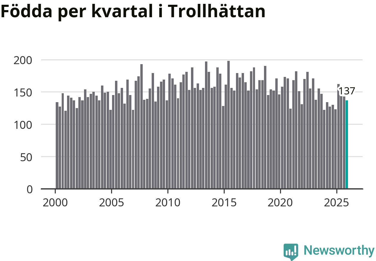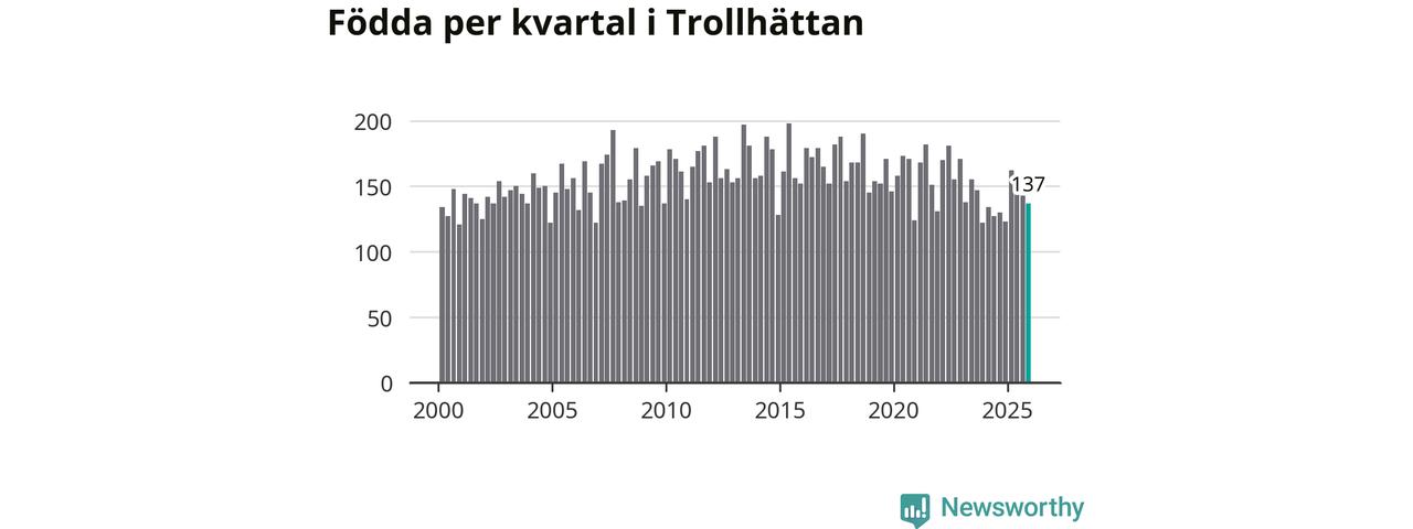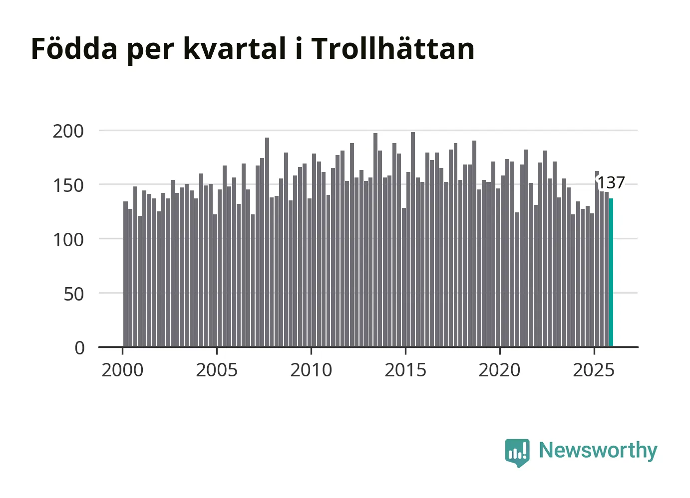 Enligt SCB:s siffror föddes 137 barn i Trollhättan under det senaste kvartalet. Samtidigt avled 145 personer. Trollhättan hade alltså ett negativt födelsenetto under fjärde kvartalet. Historiskt har dock födelsenettot nästan alltid varit positivt.