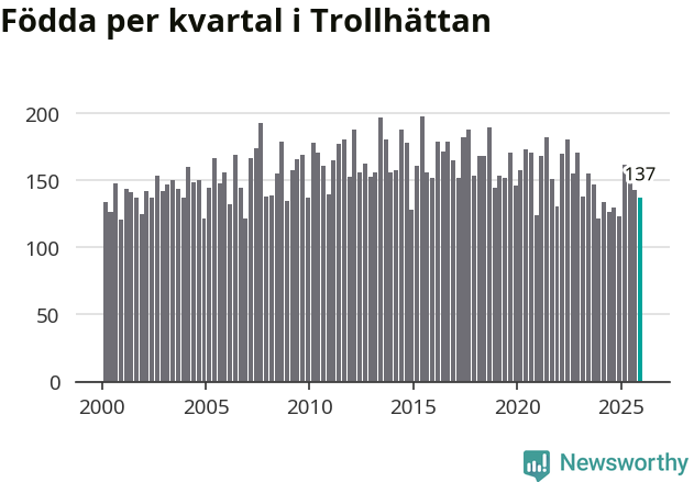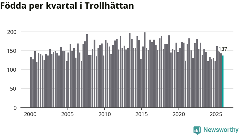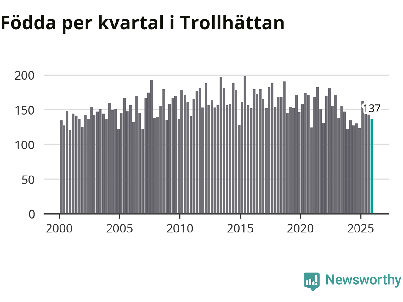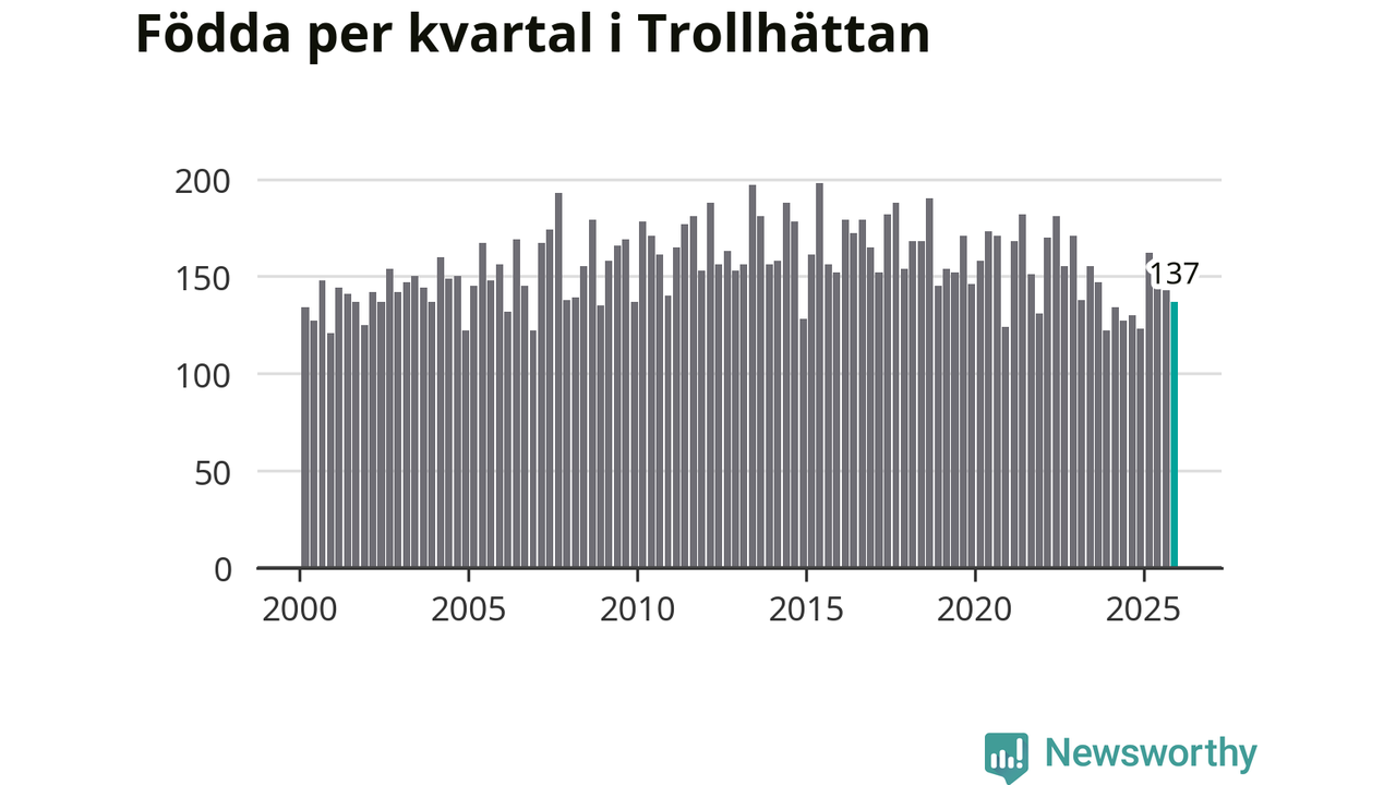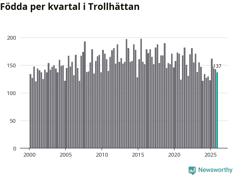 Enligt SCB:s siffror föddes 137 barn i Trollhättan under det senaste kvartalet. Samtidigt avled 145 personer. Trollhättan hade alltså ett negativt födelsenetto under fjärde kvartalet. Historiskt har dock födelsenettot nästan alltid varit positivt.