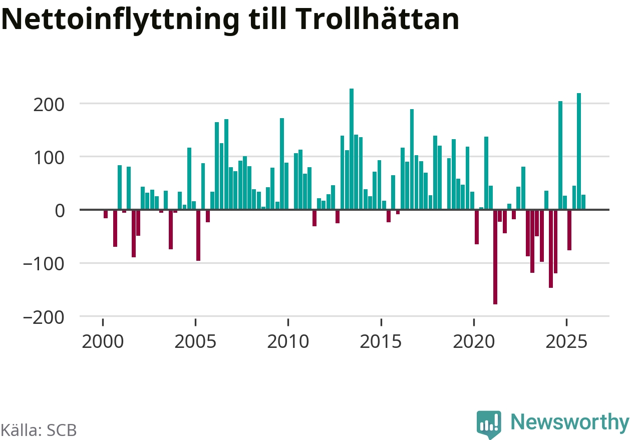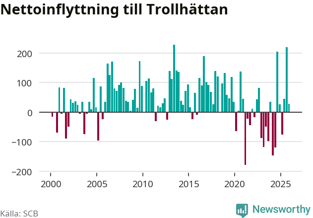 Under fjärde kvartalet 2025 flyttade 650 personer till kommunen medan 622 personer flyttade därifrån. Sedan seklets början har Trollhättan oftast haft ett positivt flyttnetto, inklusive det senaste kvartalet.