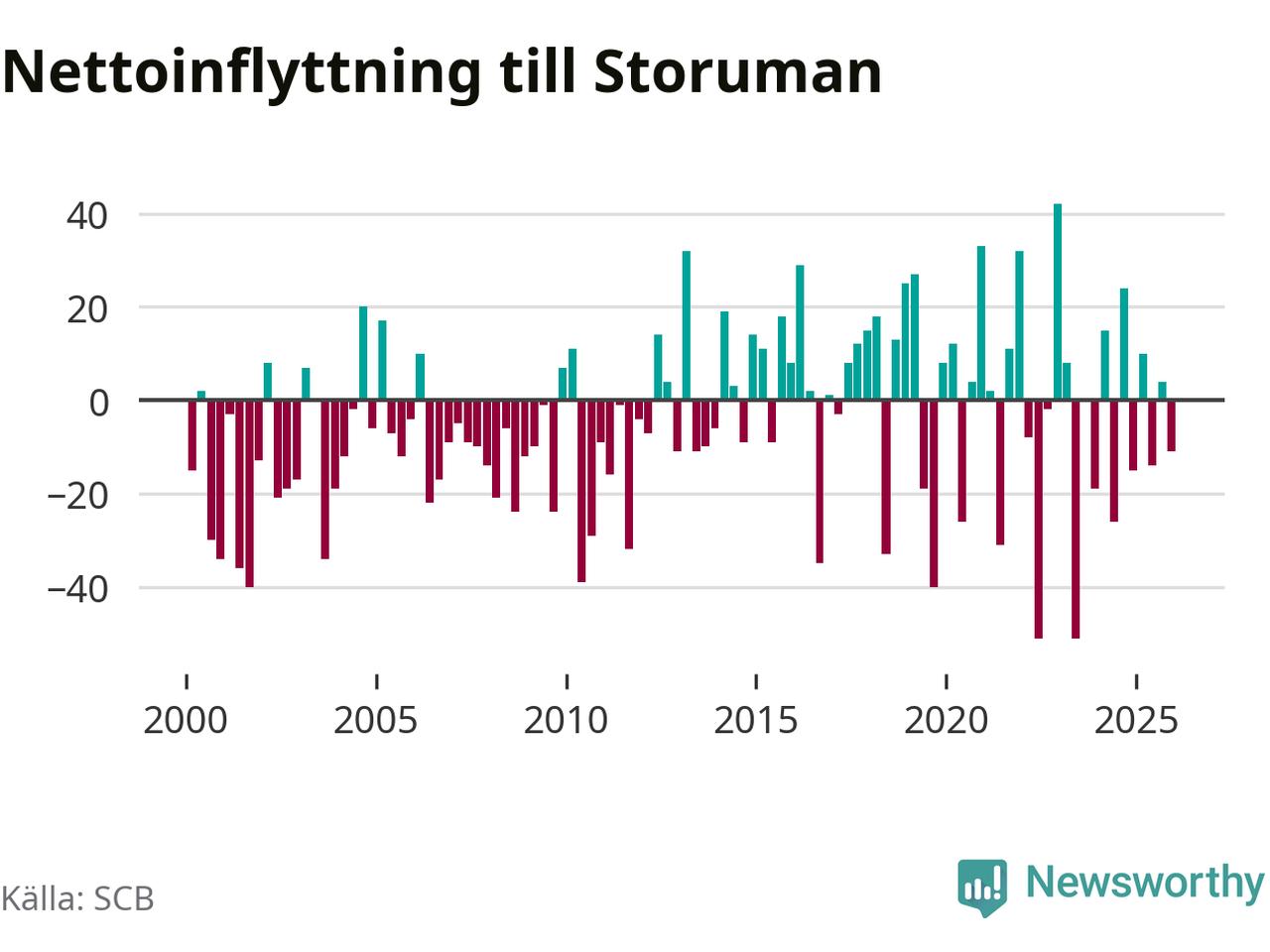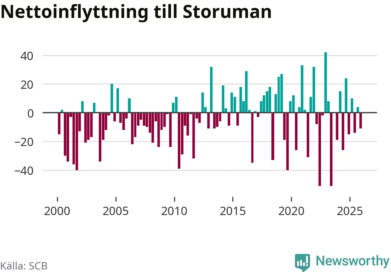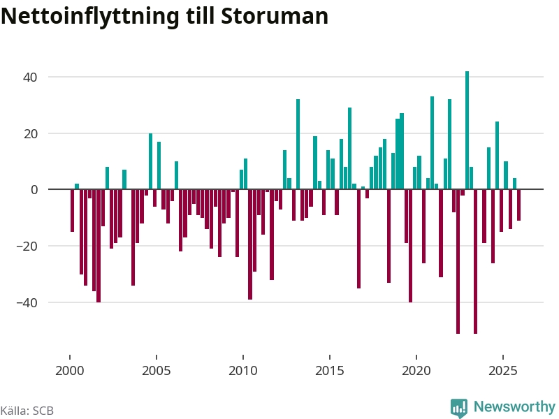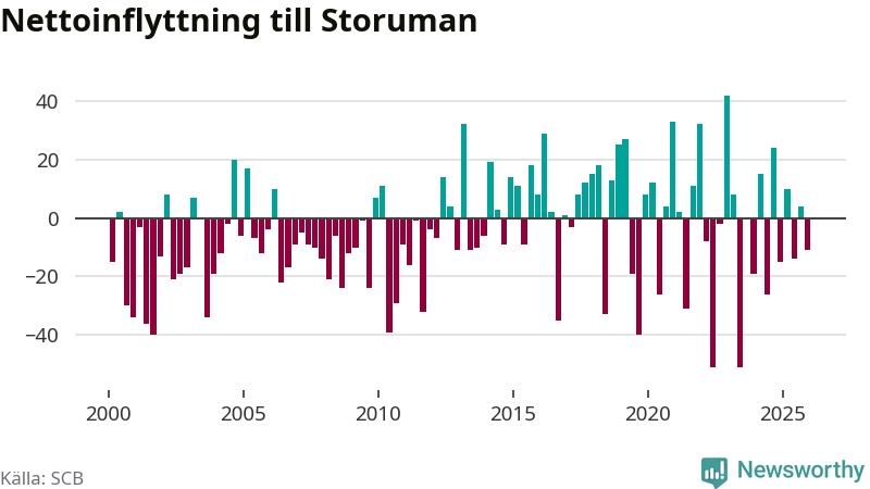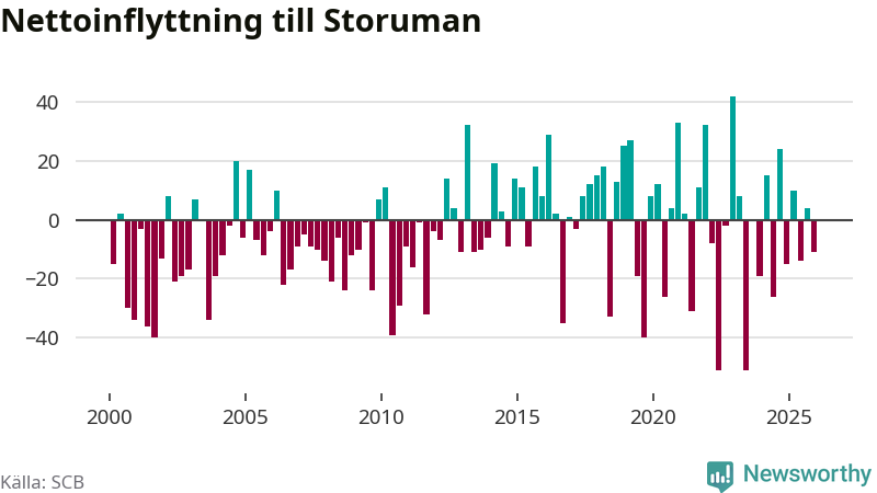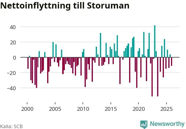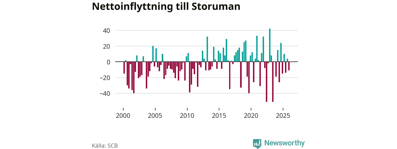 Under fjärde kvartalet 2025 flyttade 59 personer till kommunen medan 70 personer flyttade därifrån. Sedan seklets början har Storuman oftast haft ett positivt flyttnetto.