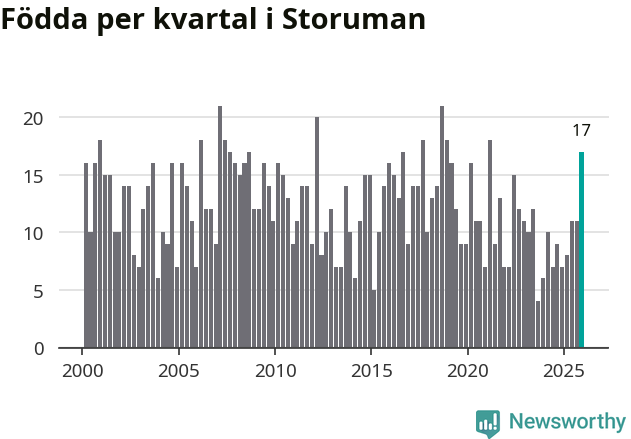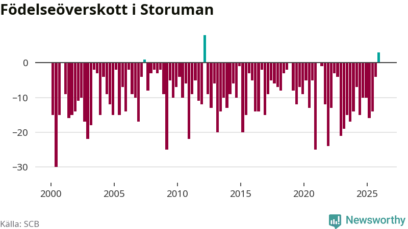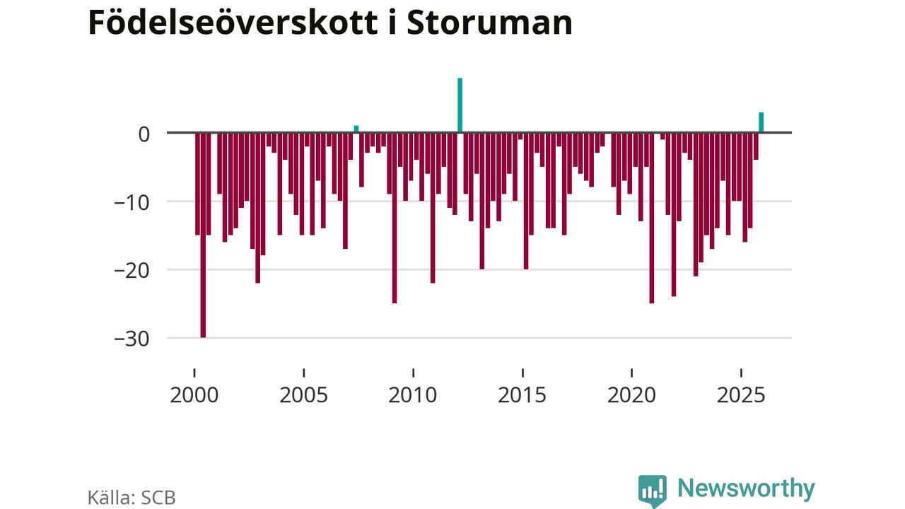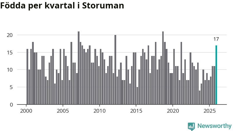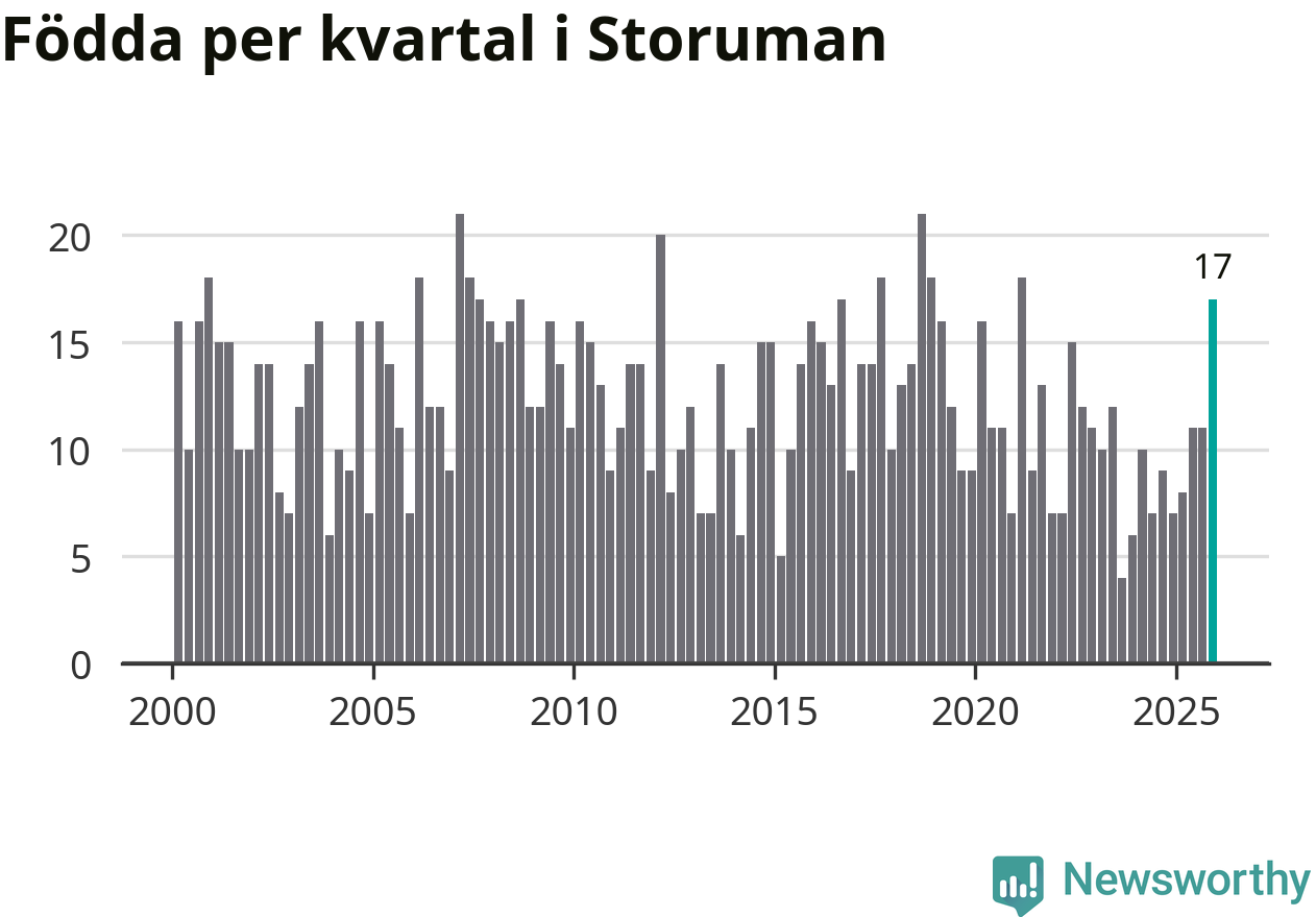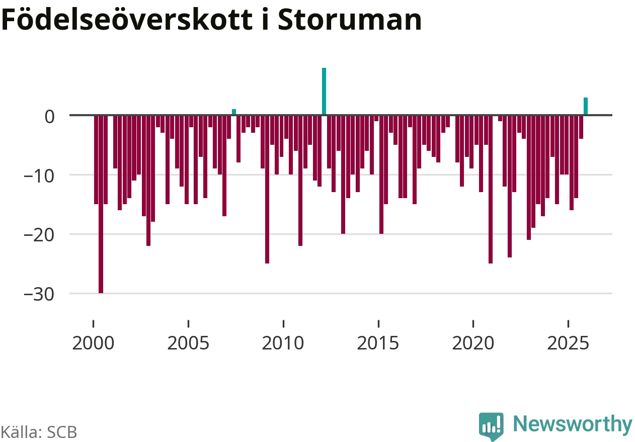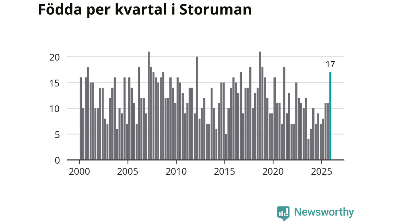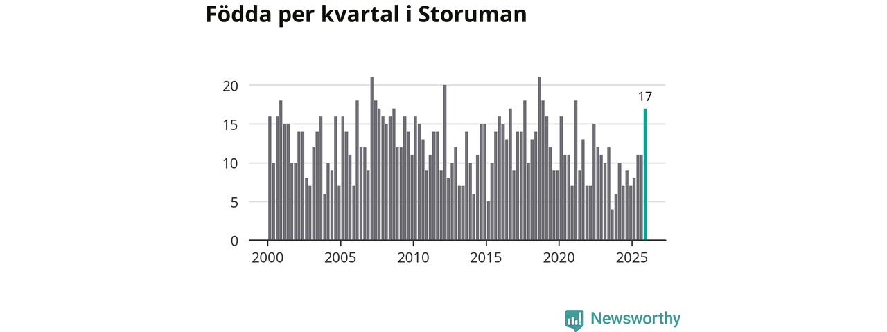 Enligt SCB:s siffror föddes 17 barn i Storuman under det senaste kvartalet, vilket är en relativt hög siffra historiskt sett. Samtidigt avled relativt få – 14 personer. Skillnaden mellan antal födda och döda är så liten att det inte går att säga om det beror på något annat än SCB:s röjandeskydd. Kommunen har nästan alltid haft negativt födelsenetto tidigare.