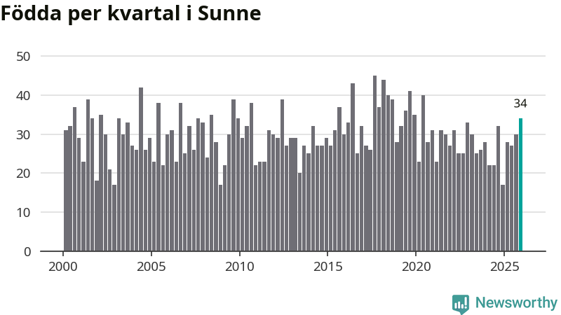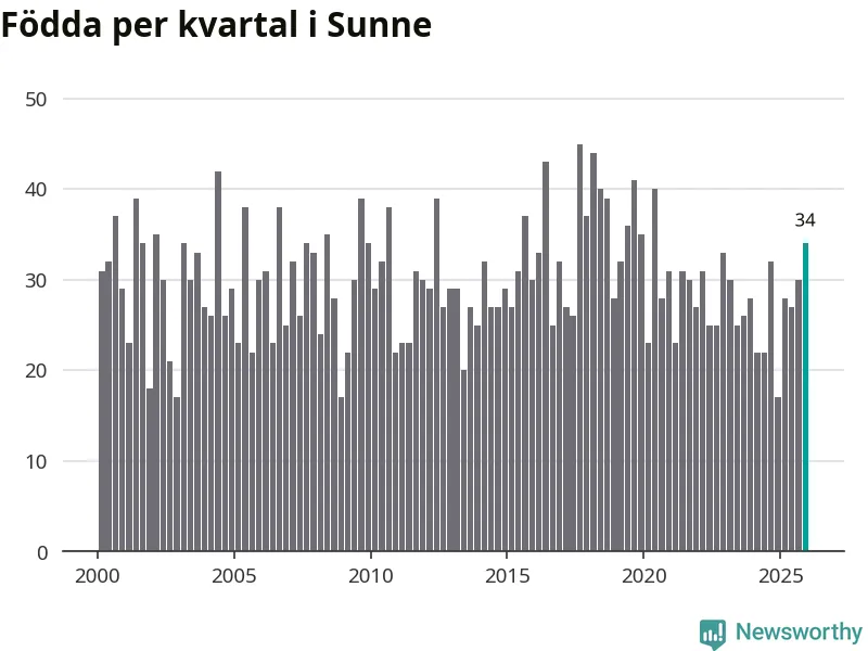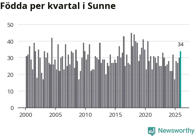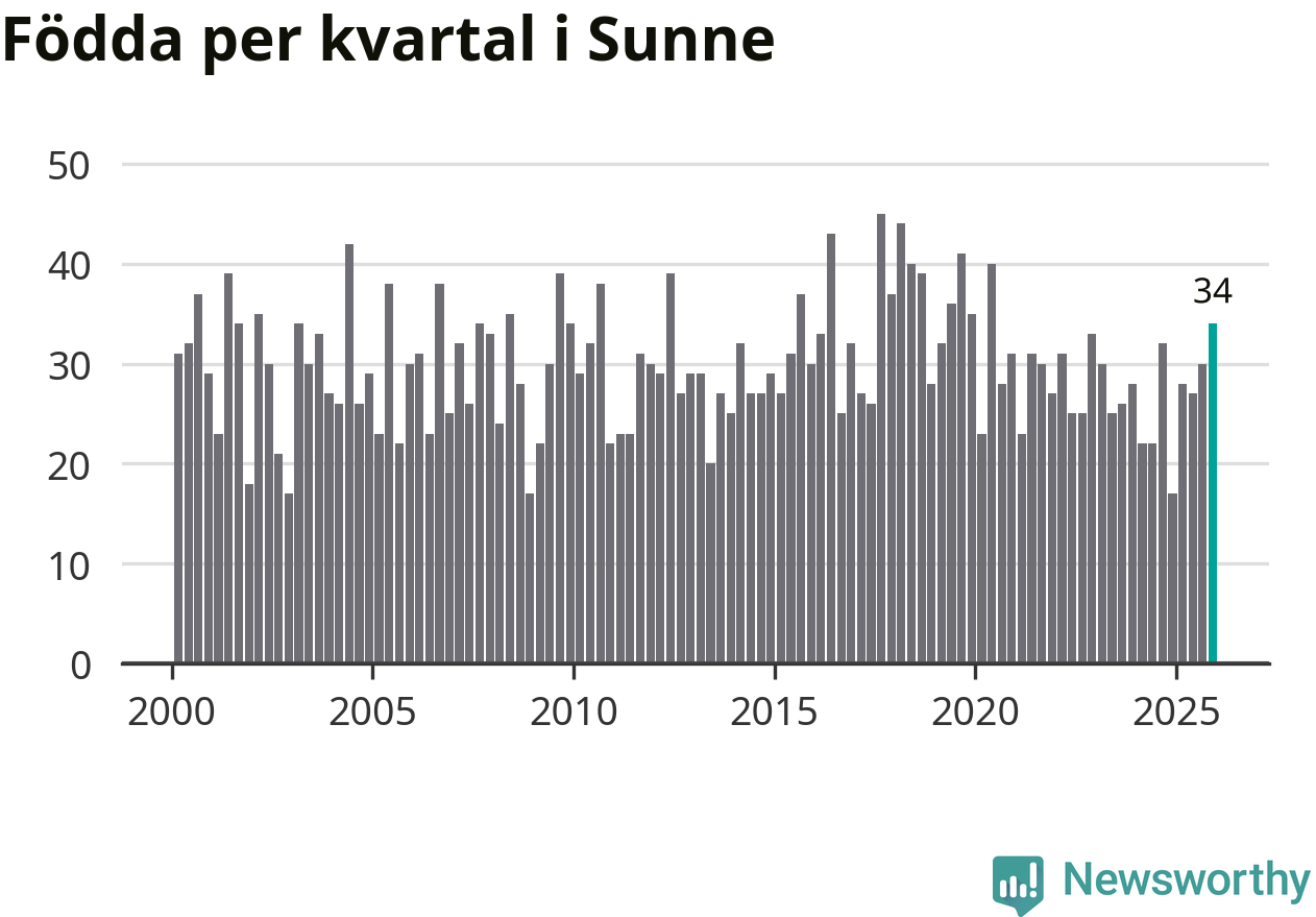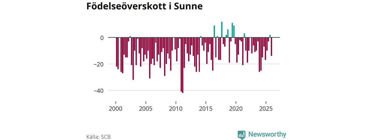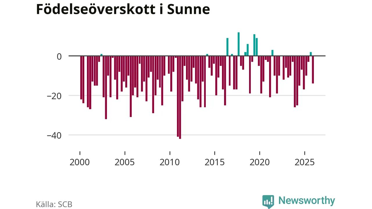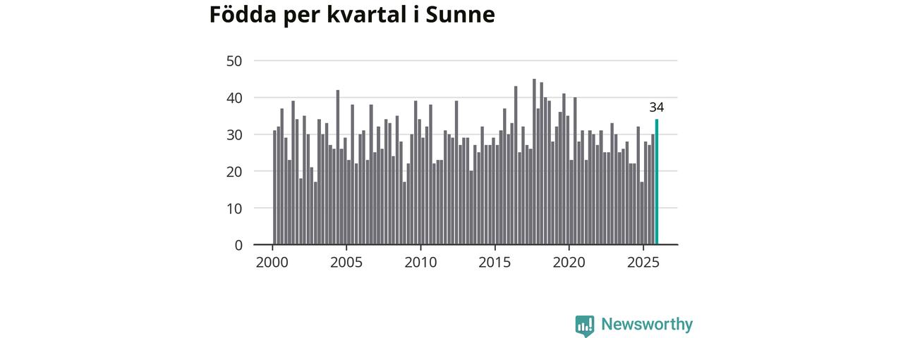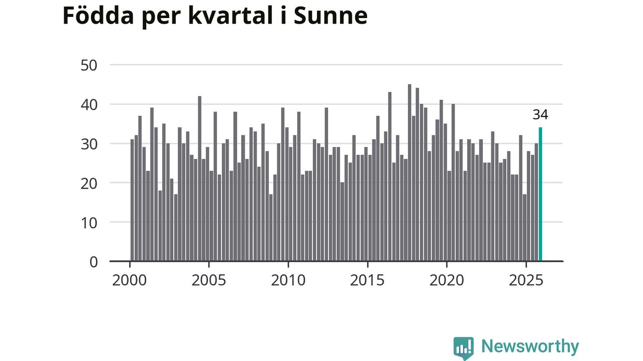Enligt SCB:s siffror föddes 34 barn i Sunne under det senaste kvartalet. Samtidigt avled 48 personer. Sunne hade alltså ett negativt födelsenetto, vilket kommunen historiskt sett oftast har haft.