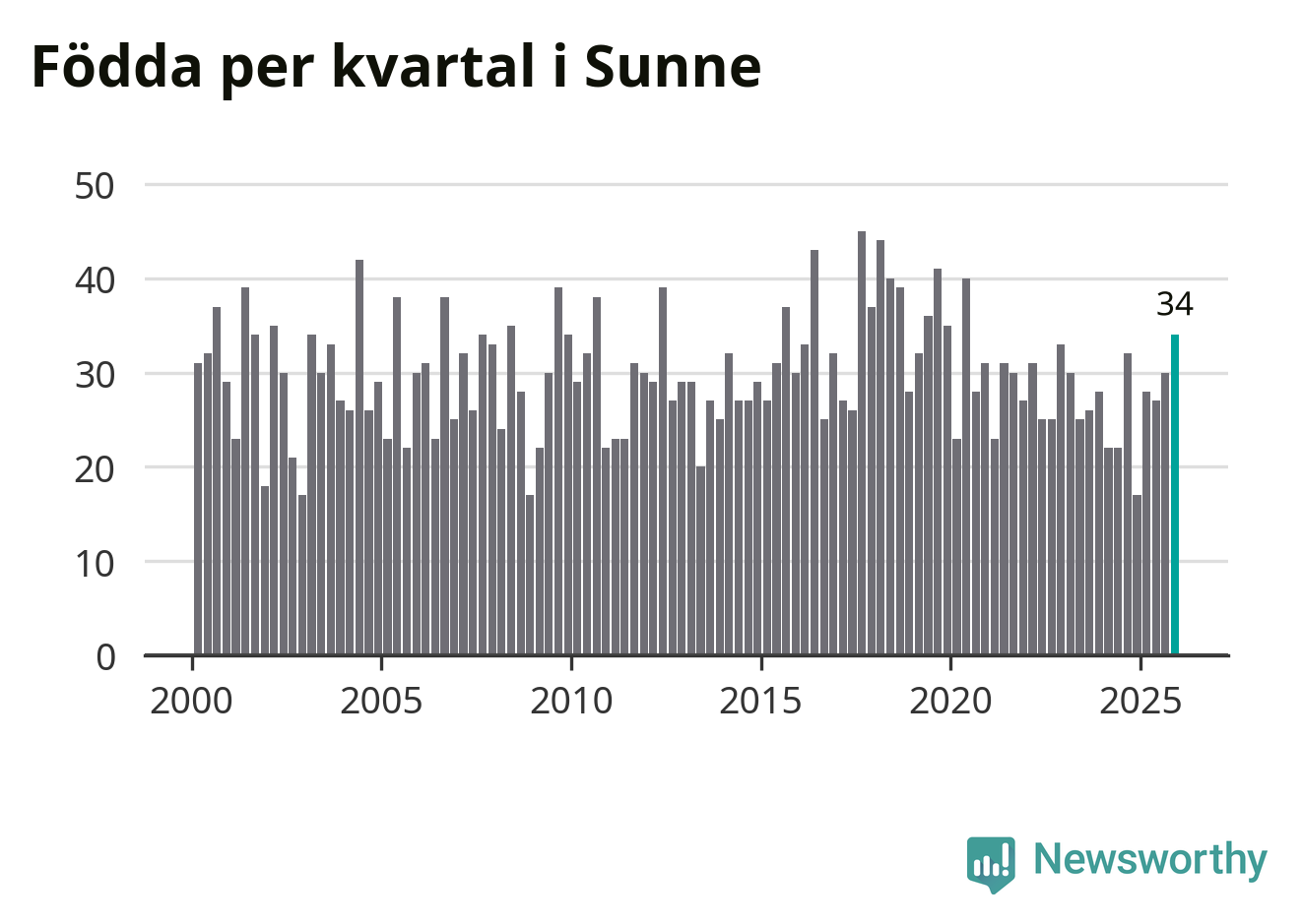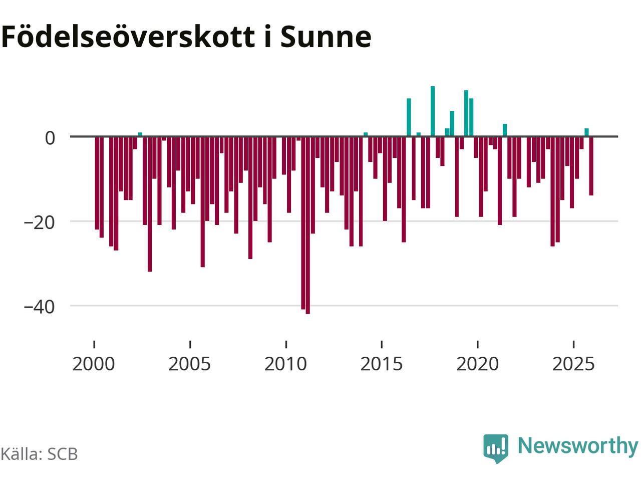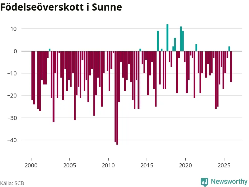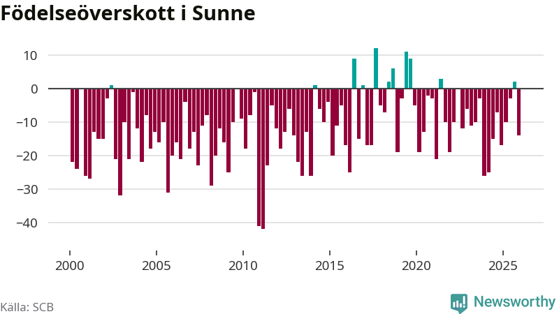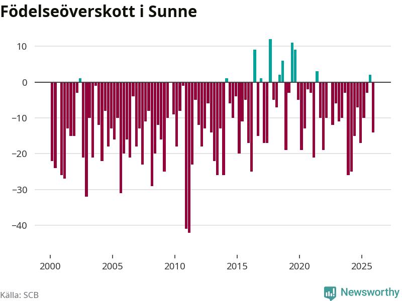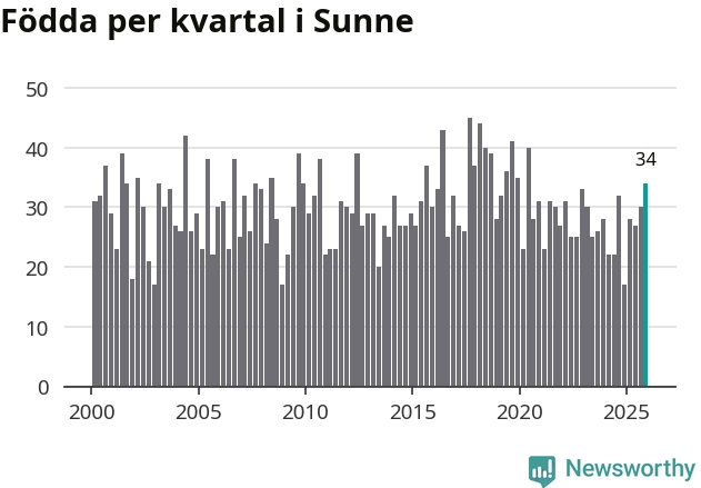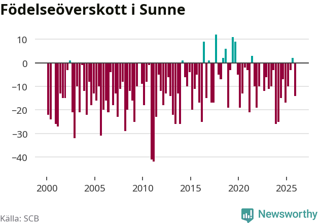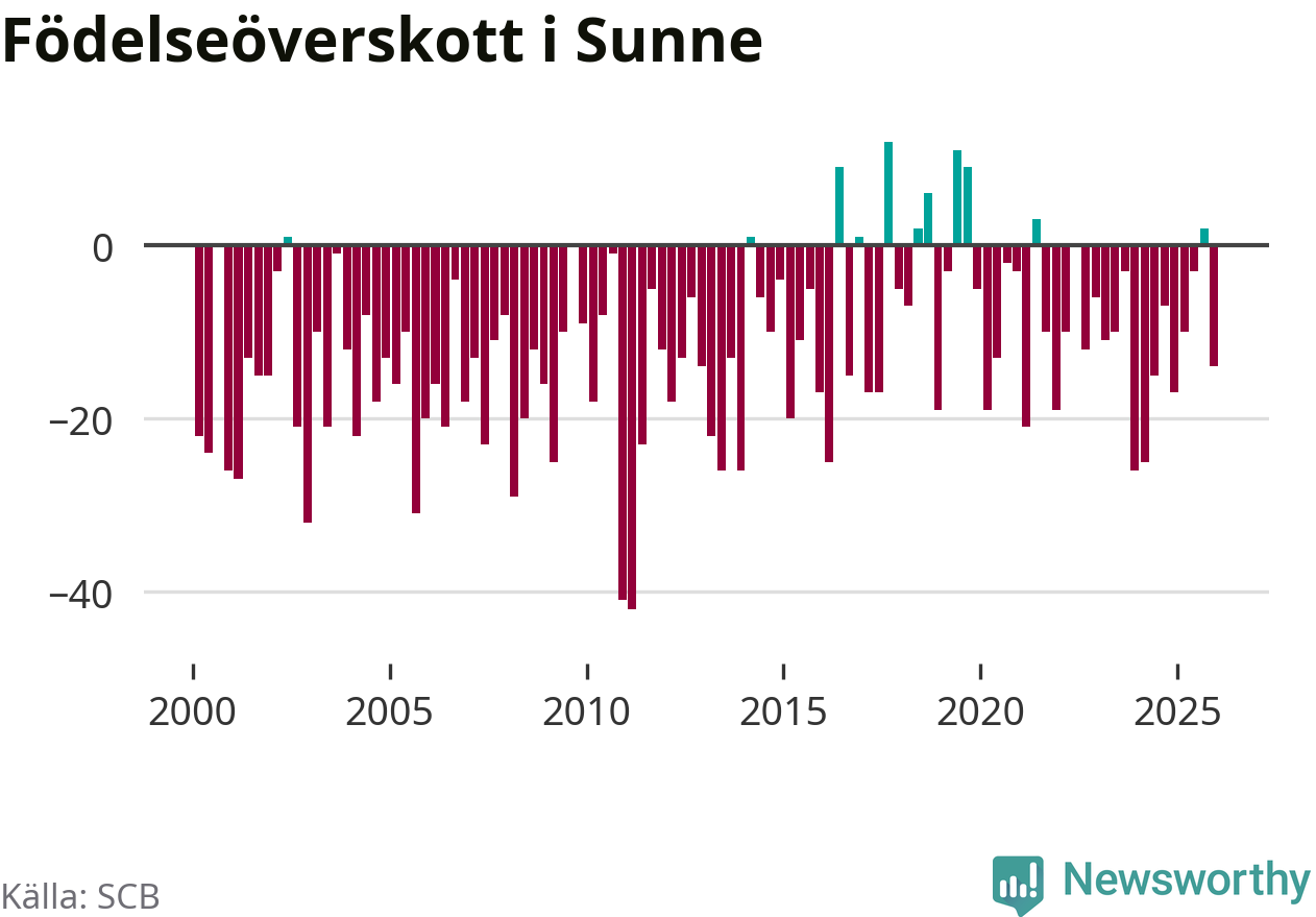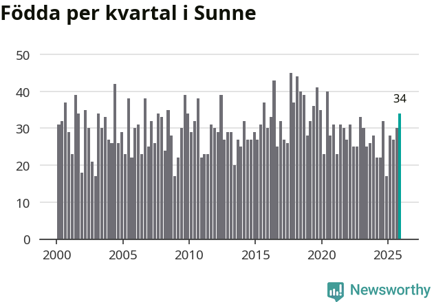 Enligt SCB:s siffror föddes 34 barn i Sunne under det senaste kvartalet. Samtidigt avled 48 personer. Sunne hade alltså ett negativt födelsenetto, vilket kommunen historiskt sett oftast har haft.
