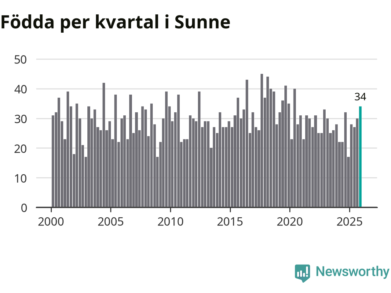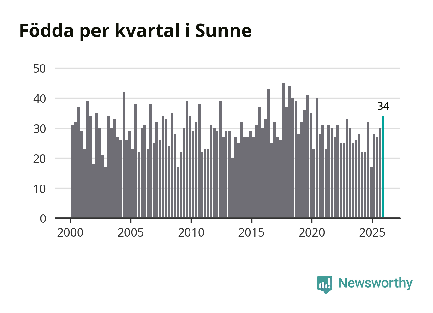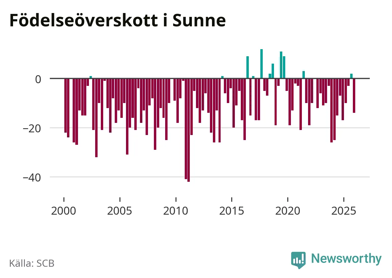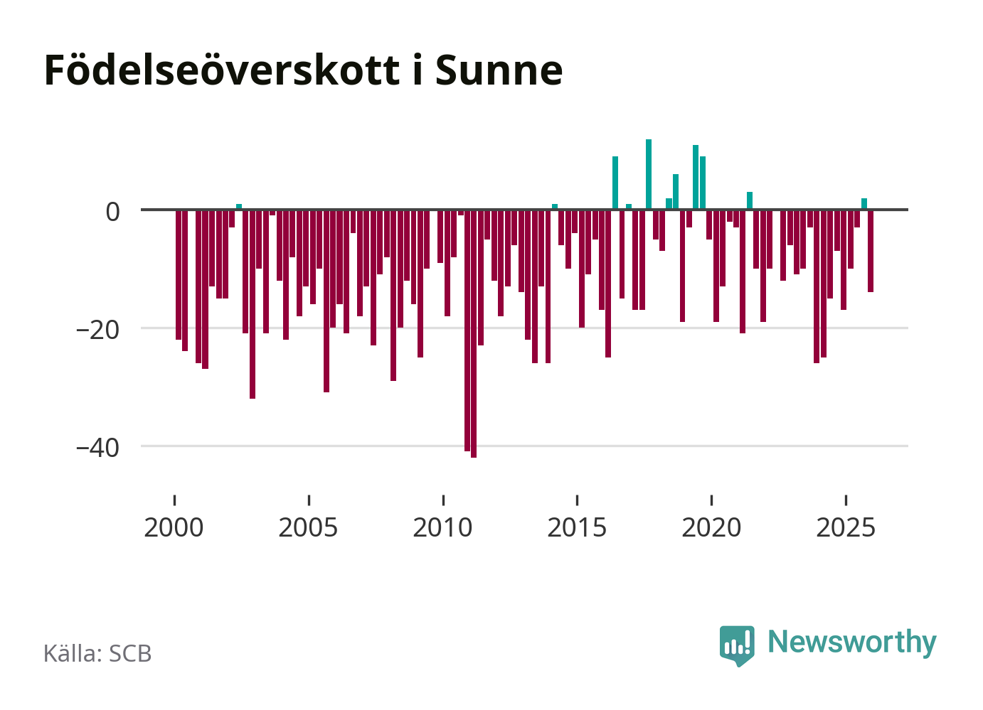 Enligt SCB:s siffror föddes 34 barn i Sunne under det senaste kvartalet. Samtidigt avled 48 personer. Sunne hade alltså ett negativt födelsenetto, vilket kommunen historiskt sett oftast har haft.