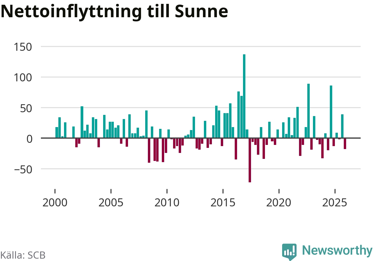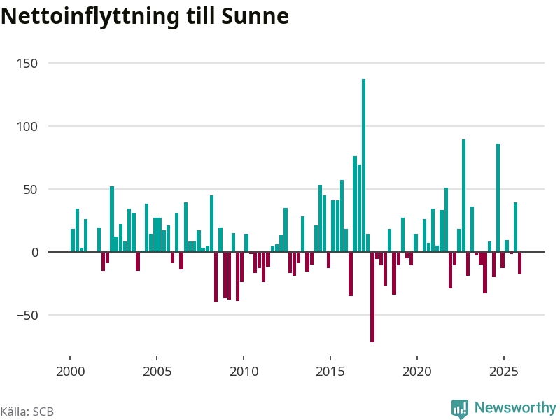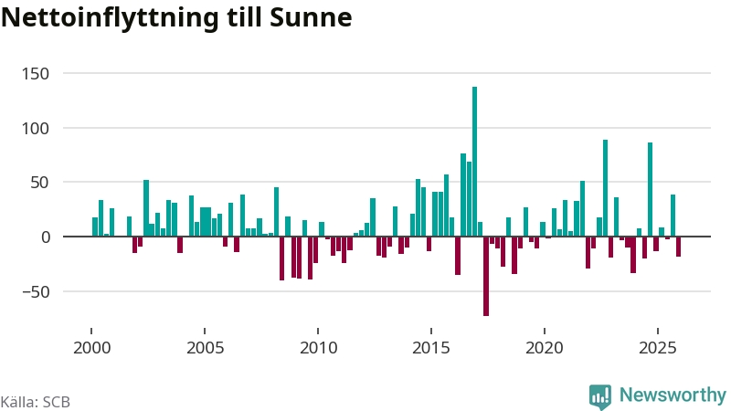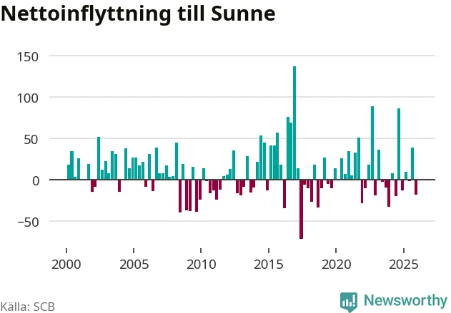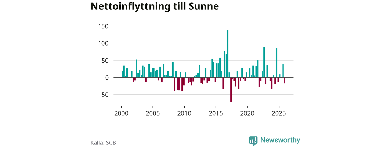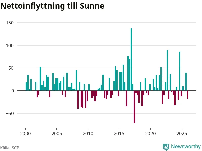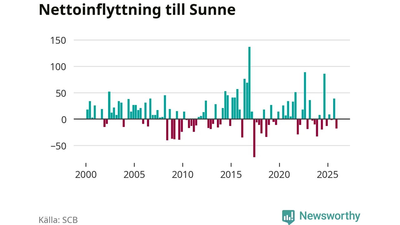 Under fjärde kvartalet 2025 flyttade 121 personer till kommunen medan 139 personer flyttade därifrån. Sedan seklets början har Sunne haft ungefär lika många kvartal med positivt flyttnetto som negativt.