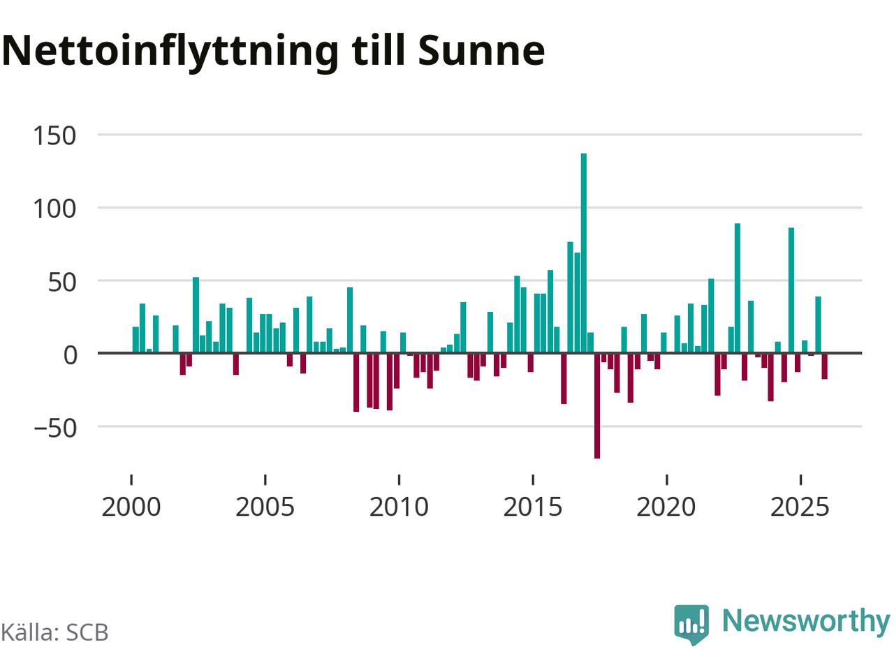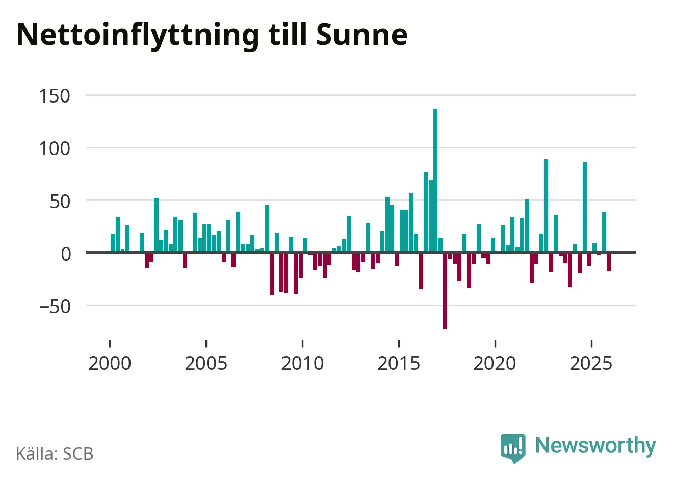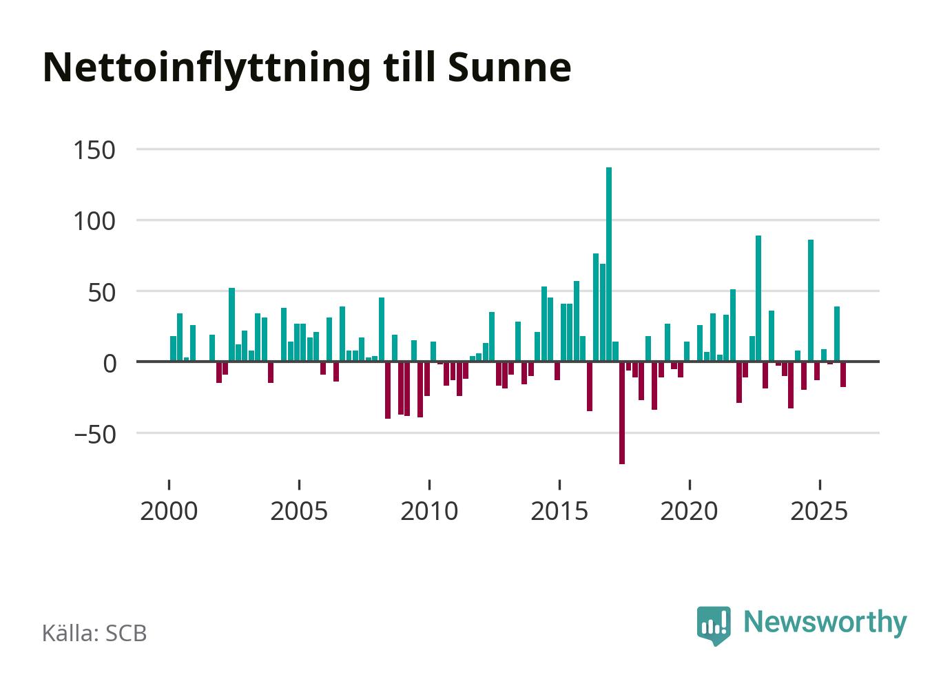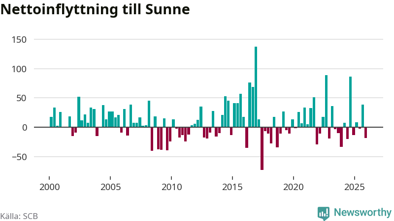 Under fjärde kvartalet 2025 flyttade 121 personer till kommunen medan 139 personer flyttade därifrån. Sedan seklets början har Sunne haft ungefär lika många kvartal med positivt flyttnetto som negativt.