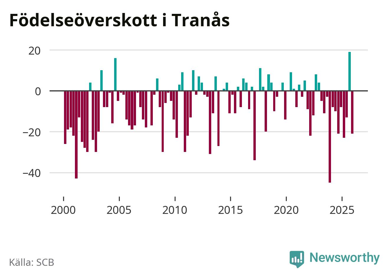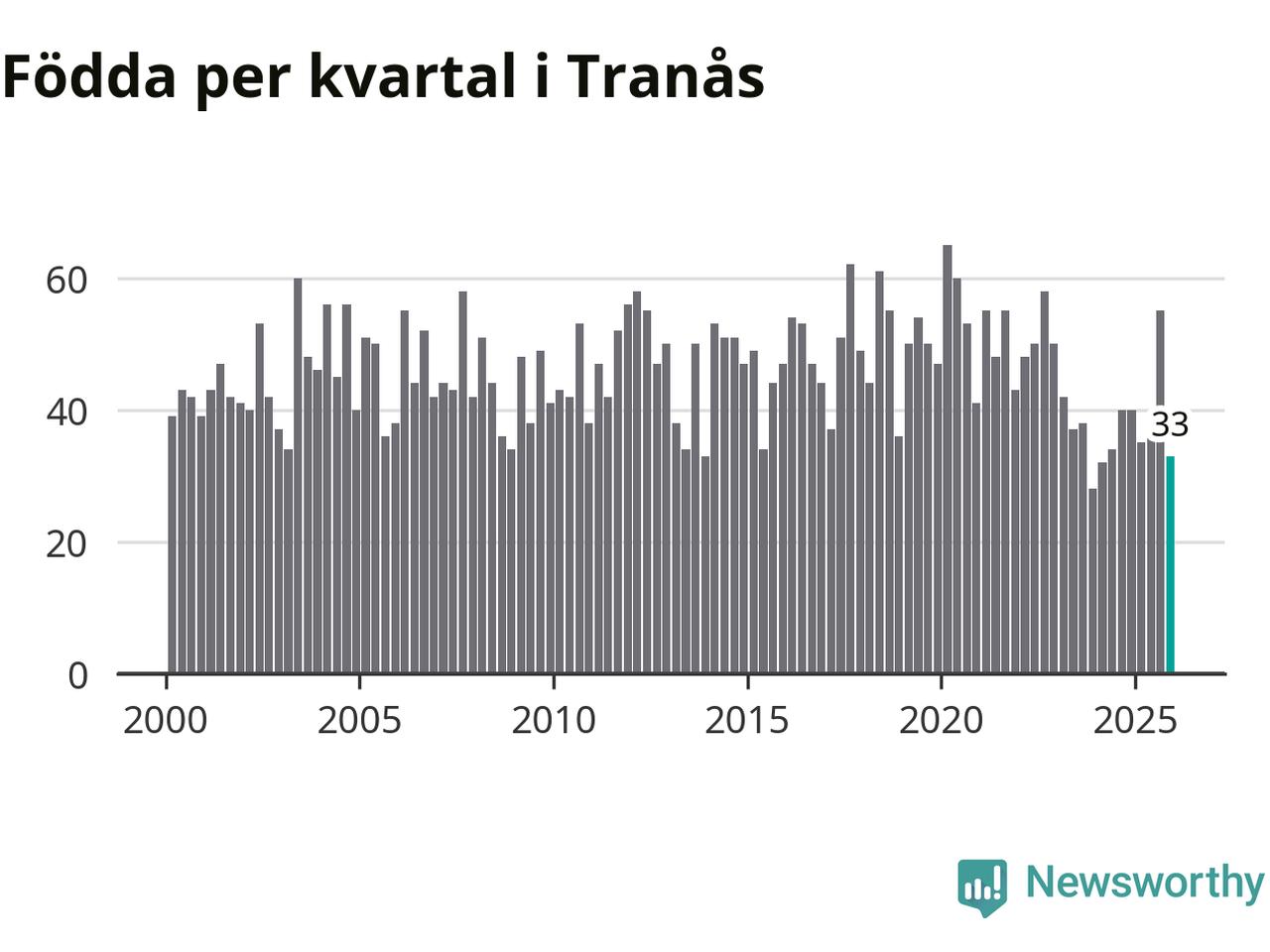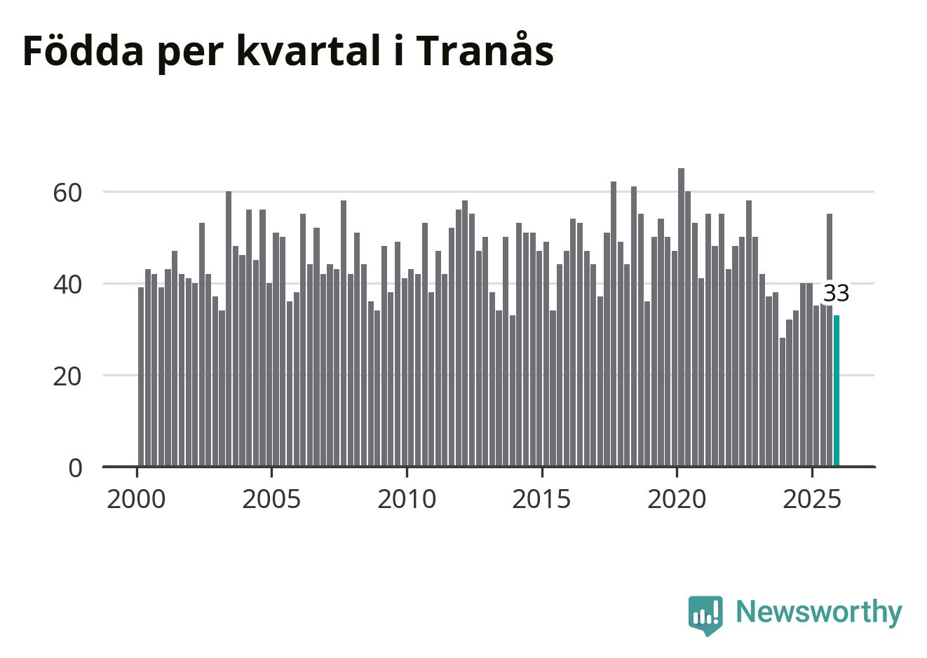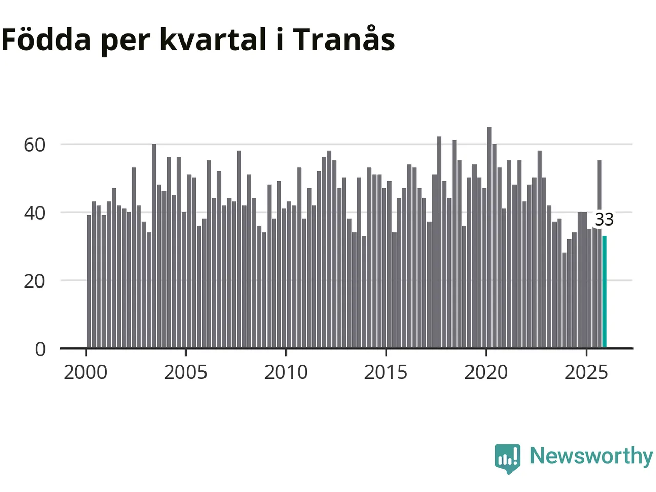 Enligt SCB:s siffror föddes 33 barn i Tranås under det senaste kvartalet. Samtidigt avled 54 personer. Tranås hade alltså ett negativt födelsenetto, vilket kommunen historiskt sett oftast har haft.