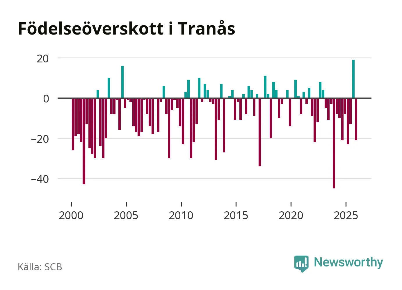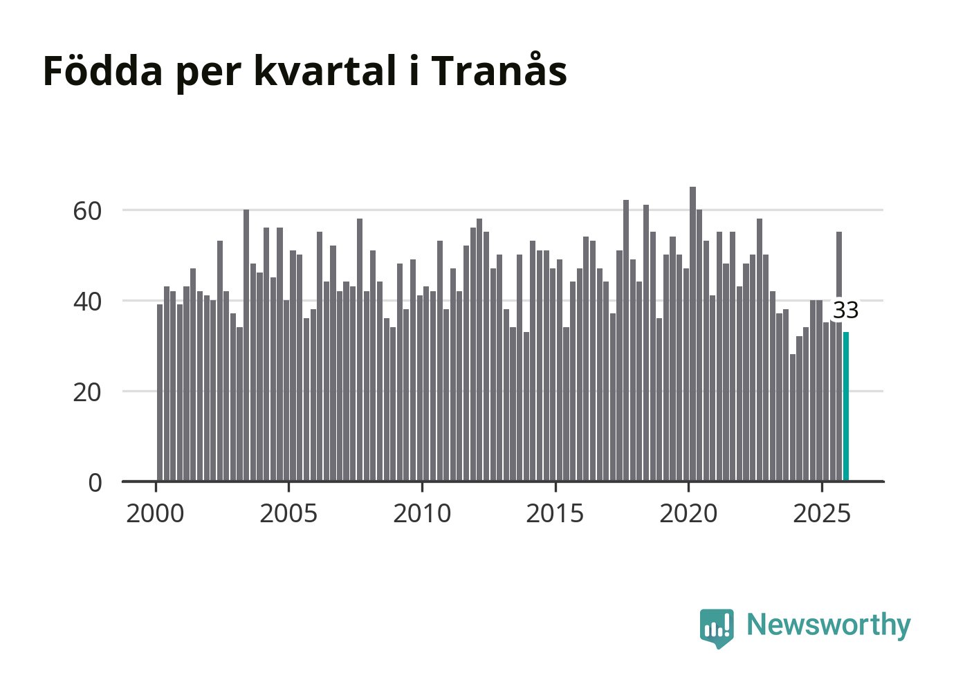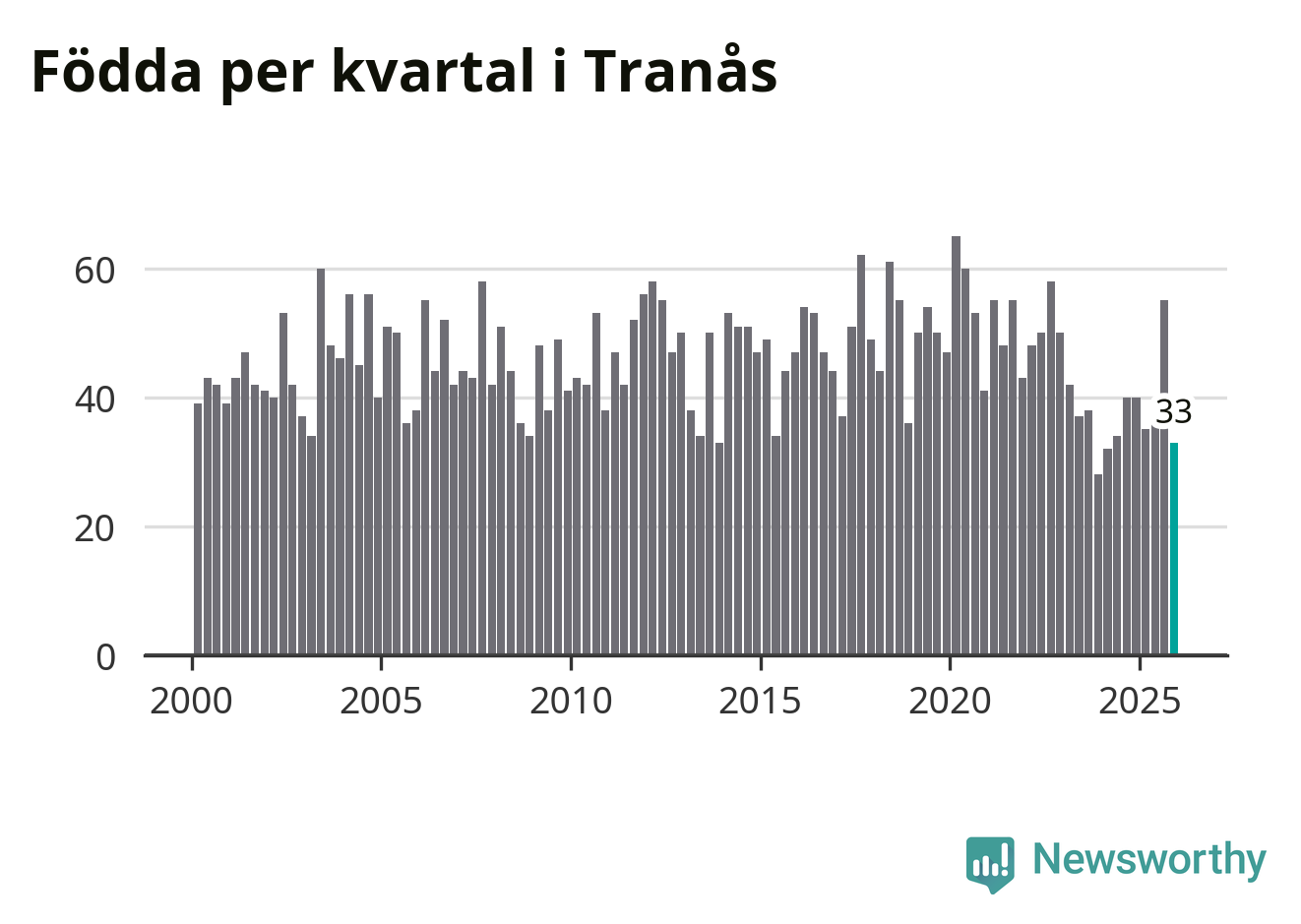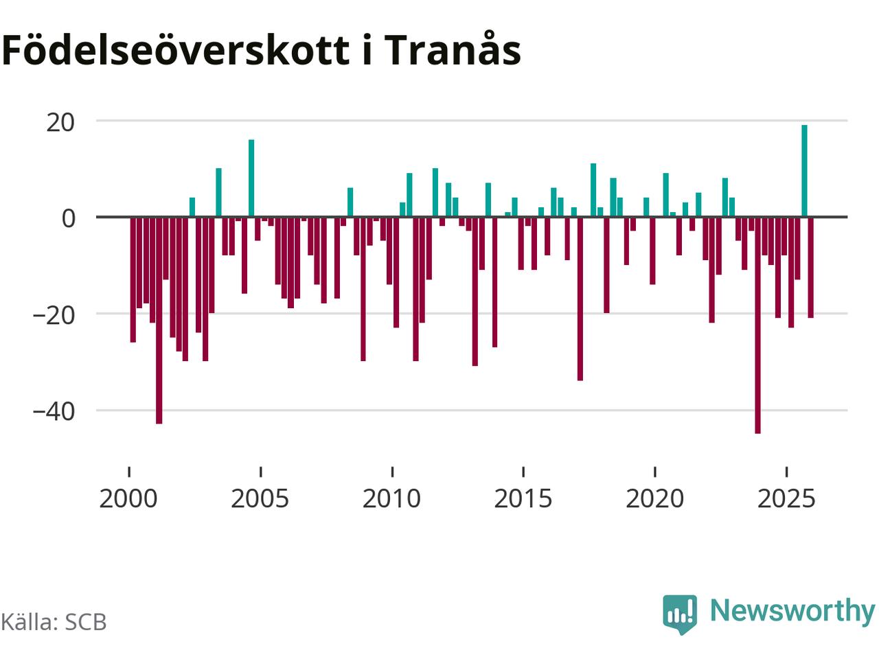 Enligt SCB:s siffror föddes 33 barn i Tranås under det senaste kvartalet. Samtidigt avled 54 personer. Tranås hade alltså ett negativt födelsenetto, vilket kommunen historiskt sett oftast har haft.