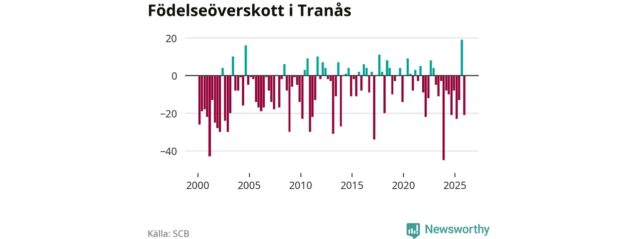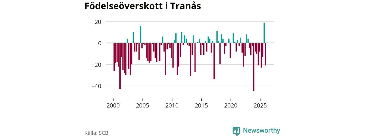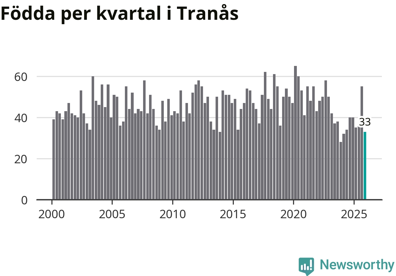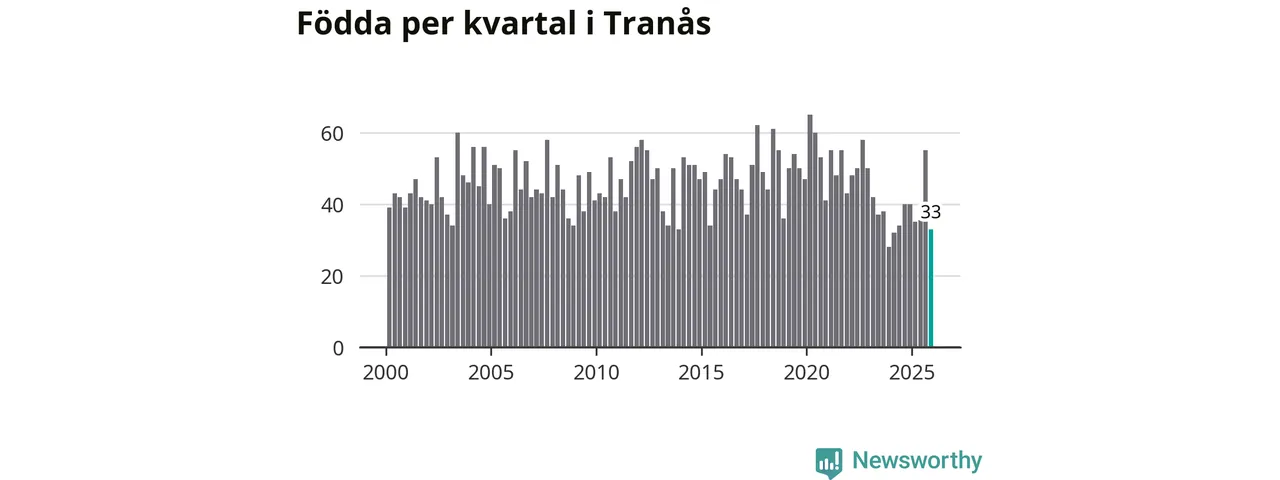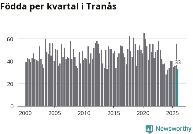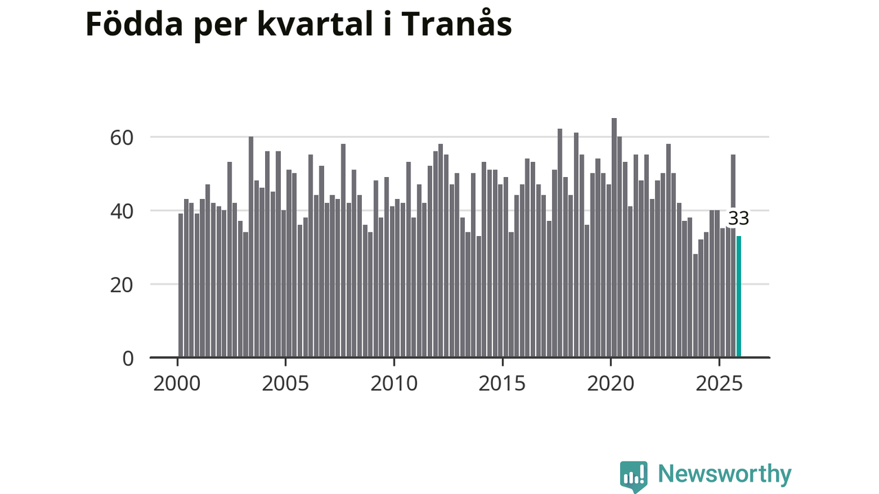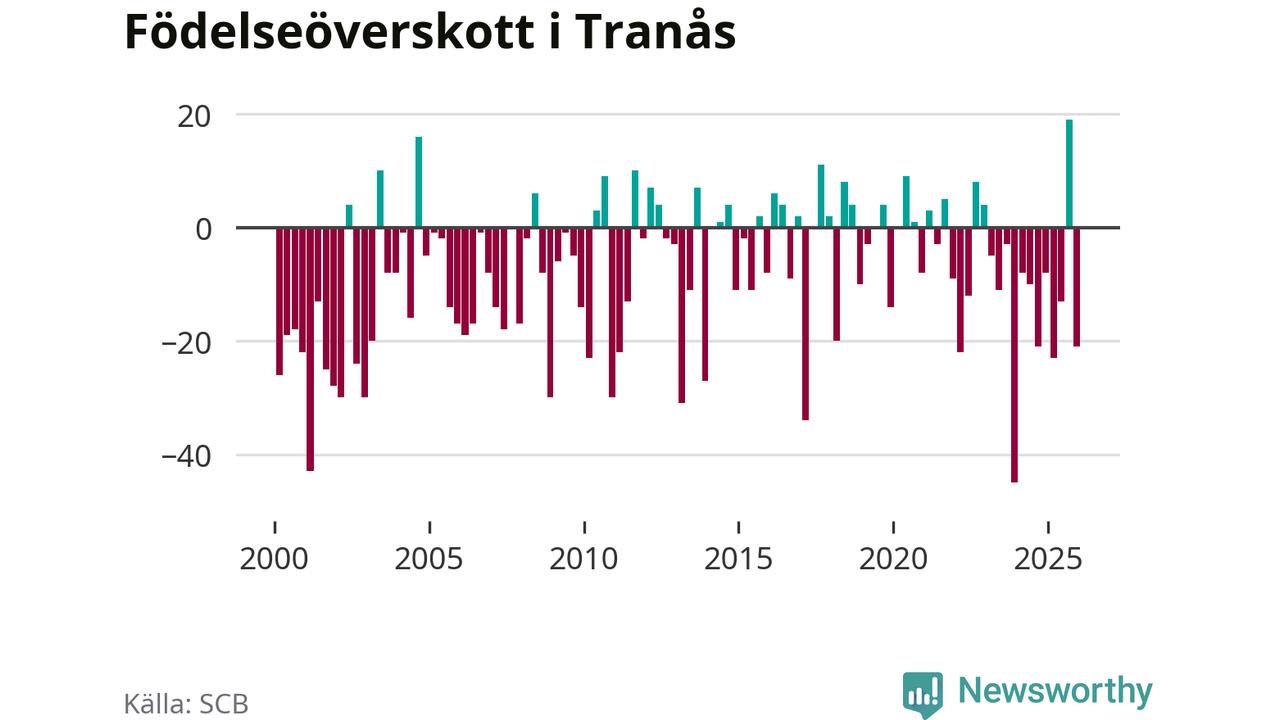 Enligt SCB:s siffror föddes 33 barn i Tranås under det senaste kvartalet. Samtidigt avled 54 personer. Tranås hade alltså ett negativt födelsenetto, vilket kommunen historiskt sett oftast har haft.
