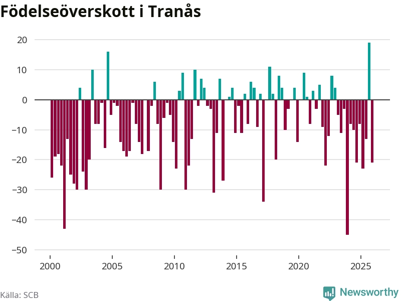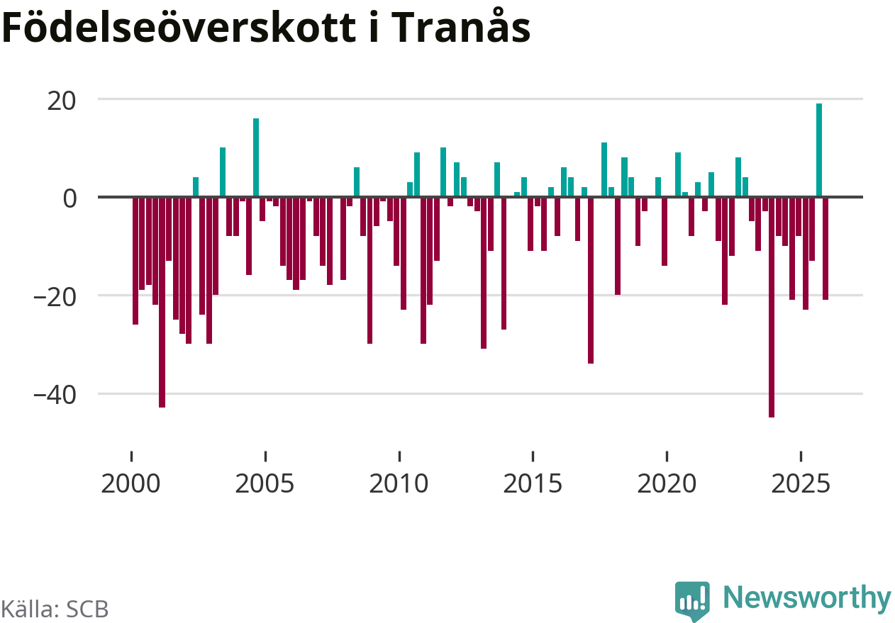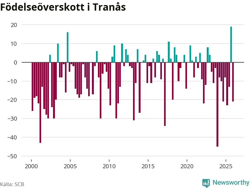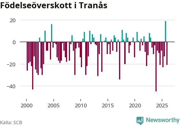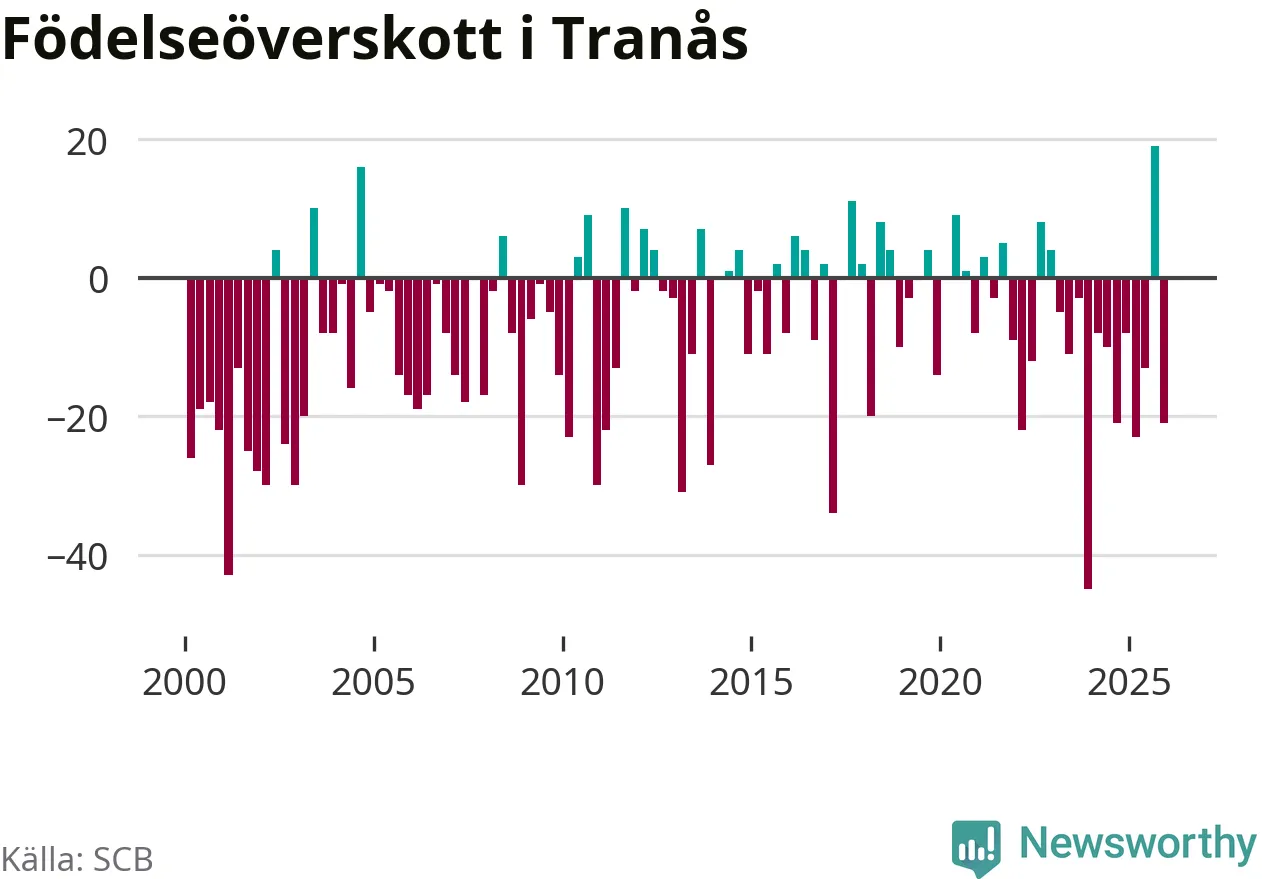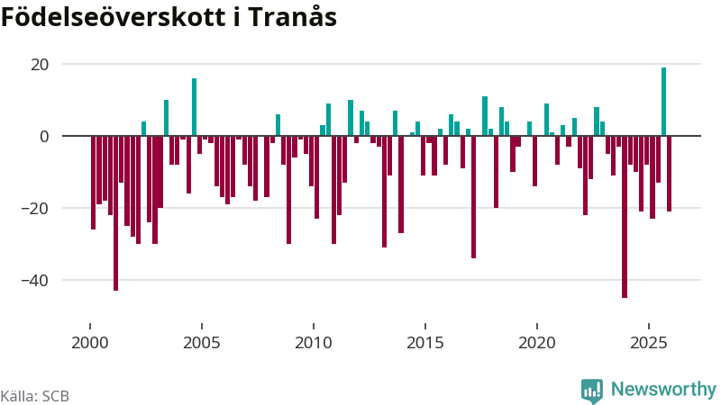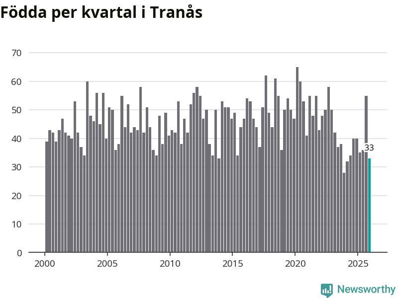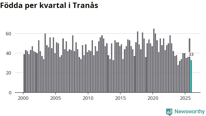 Enligt SCB:s siffror föddes 33 barn i Tranås under det senaste kvartalet. Samtidigt avled 54 personer. Tranås hade alltså ett negativt födelsenetto, vilket kommunen historiskt sett oftast har haft.